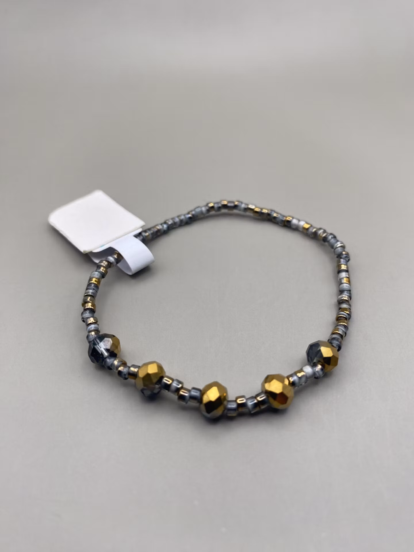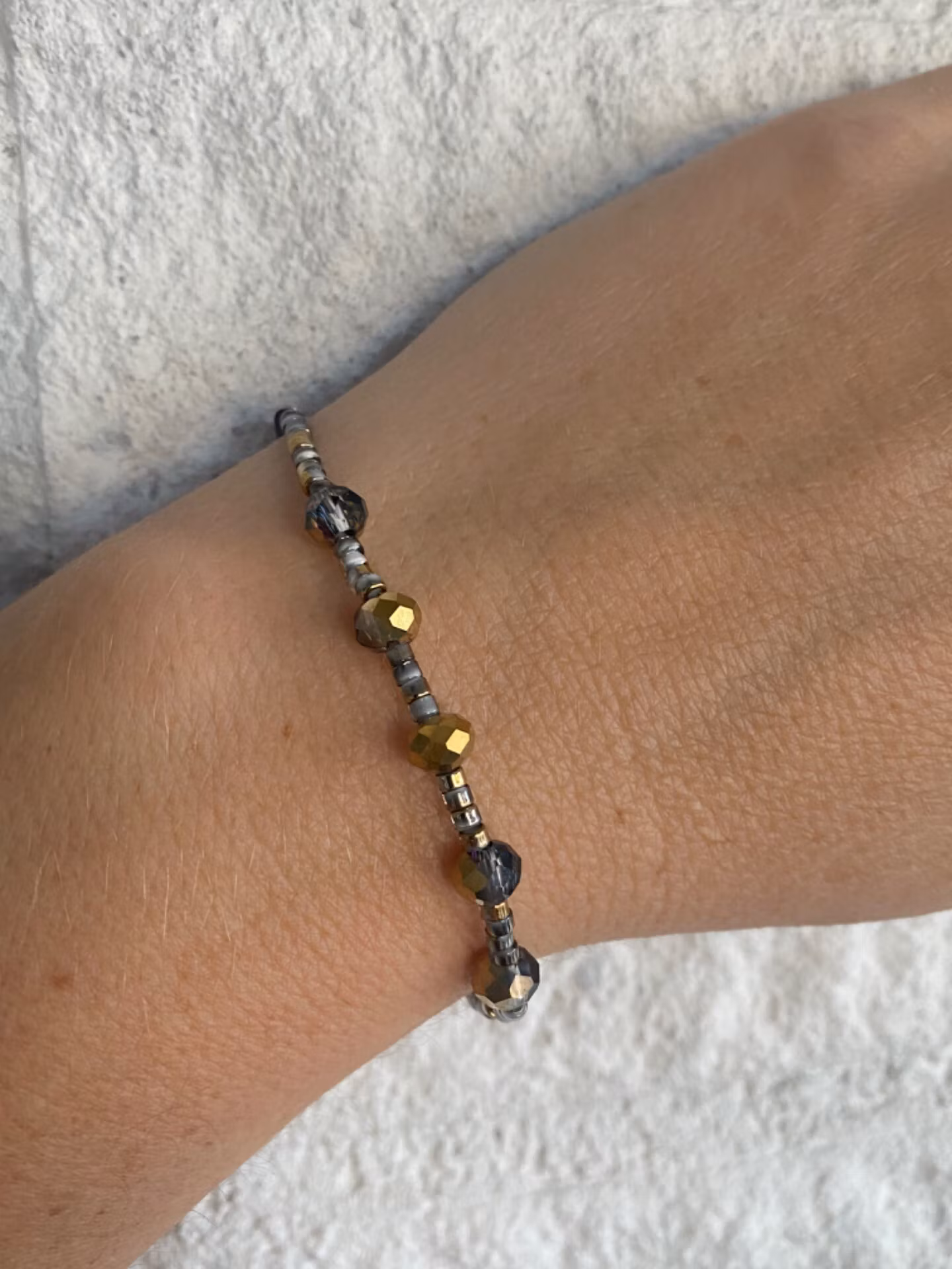 Tjustigt armband i små gråmellerade glaspärlor runt om, större guldmellerade glaspärlor i blickfångetPärlor 6mm, 2,5mmVisas produkten "Tillfälligt slut" efter a