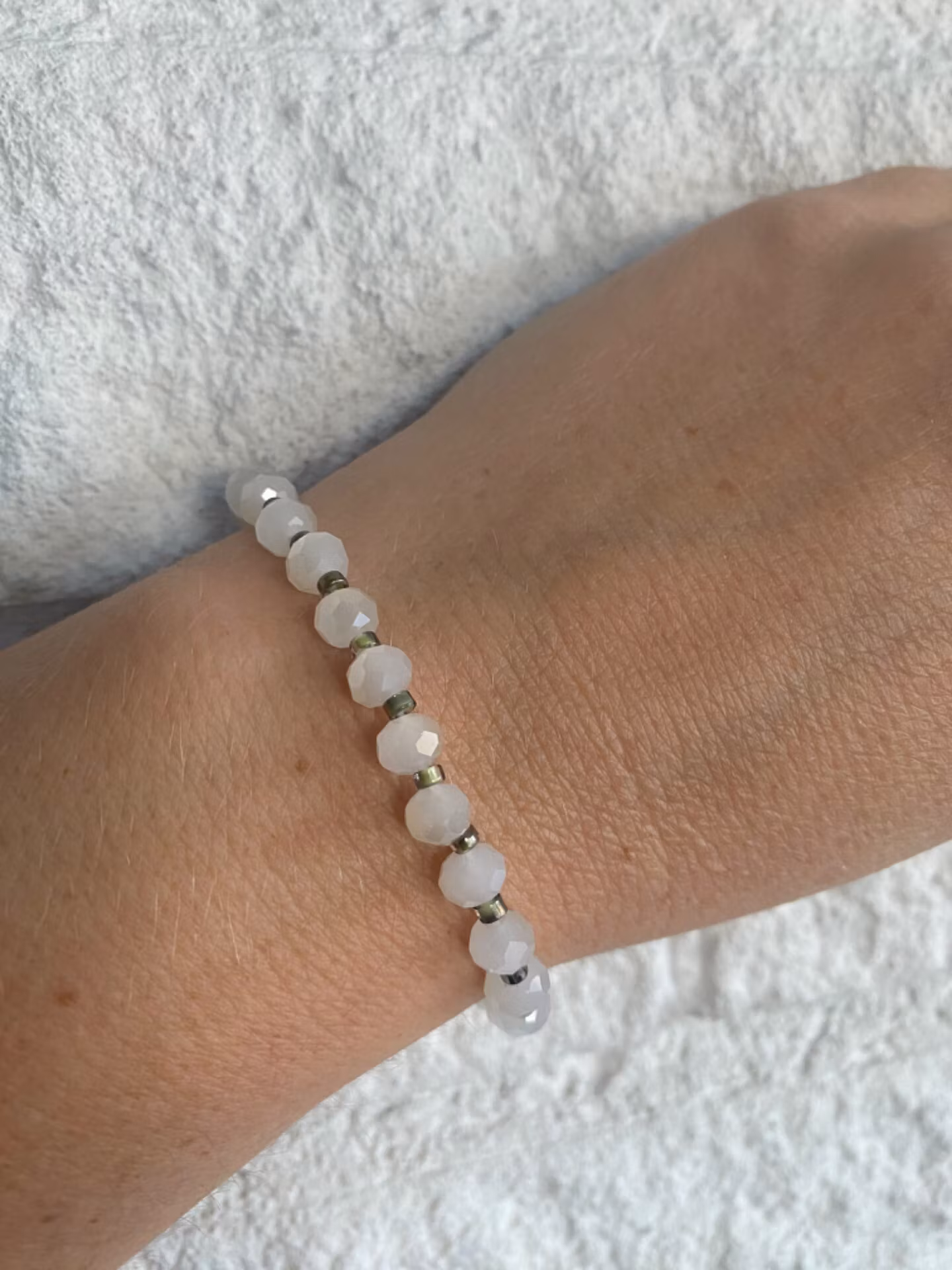 Vackert armband i vita frostade glaspärlor varvat med grönmellerade små glaspärlor.Pärlor 6mm, 2,5mmVisas produkten "Tillfälligt slut" efter att du lagt den i d