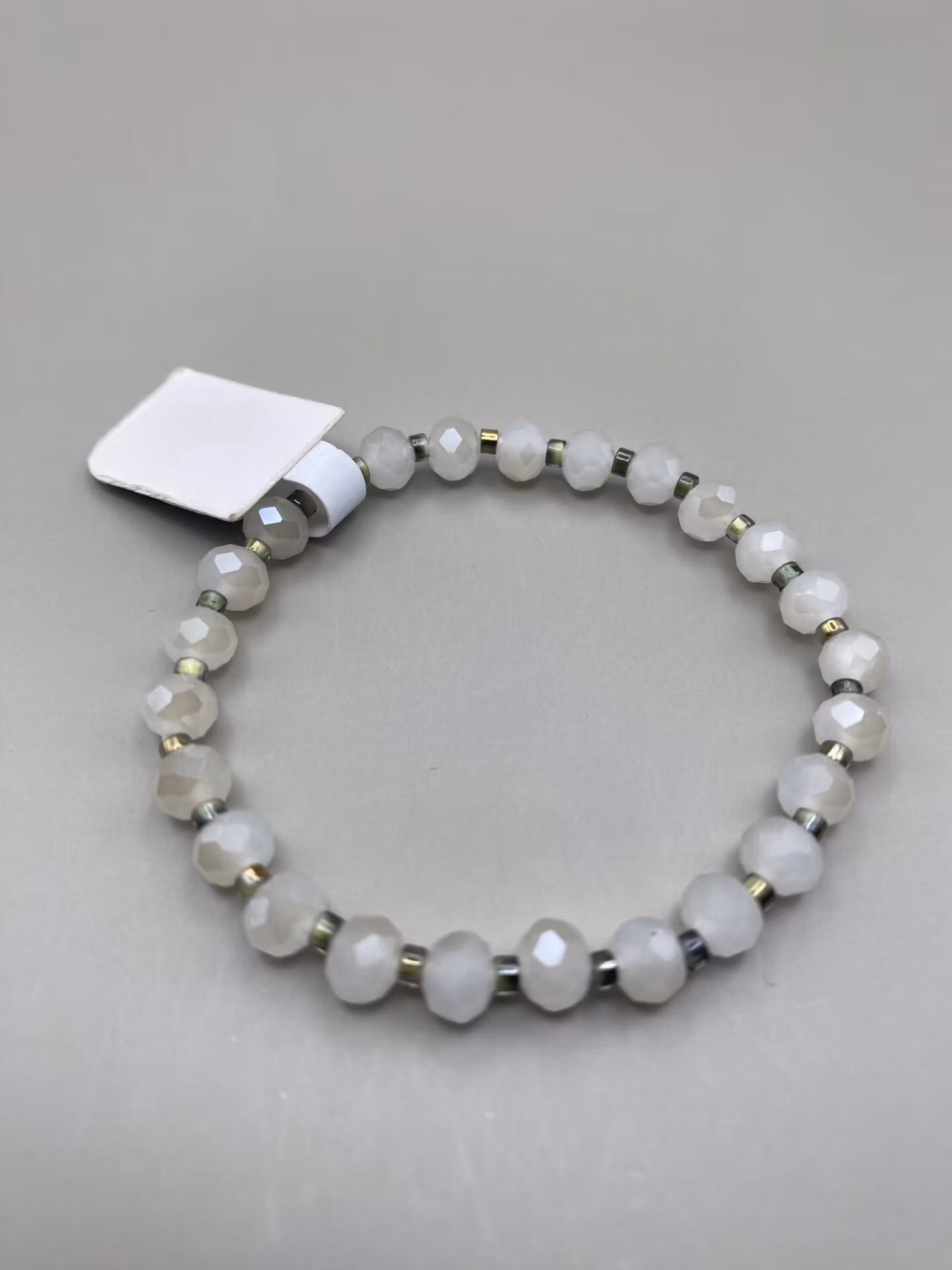 Vackert armband i vita frostade glaspärlor varvat med grönmellerade små glaspärlor.