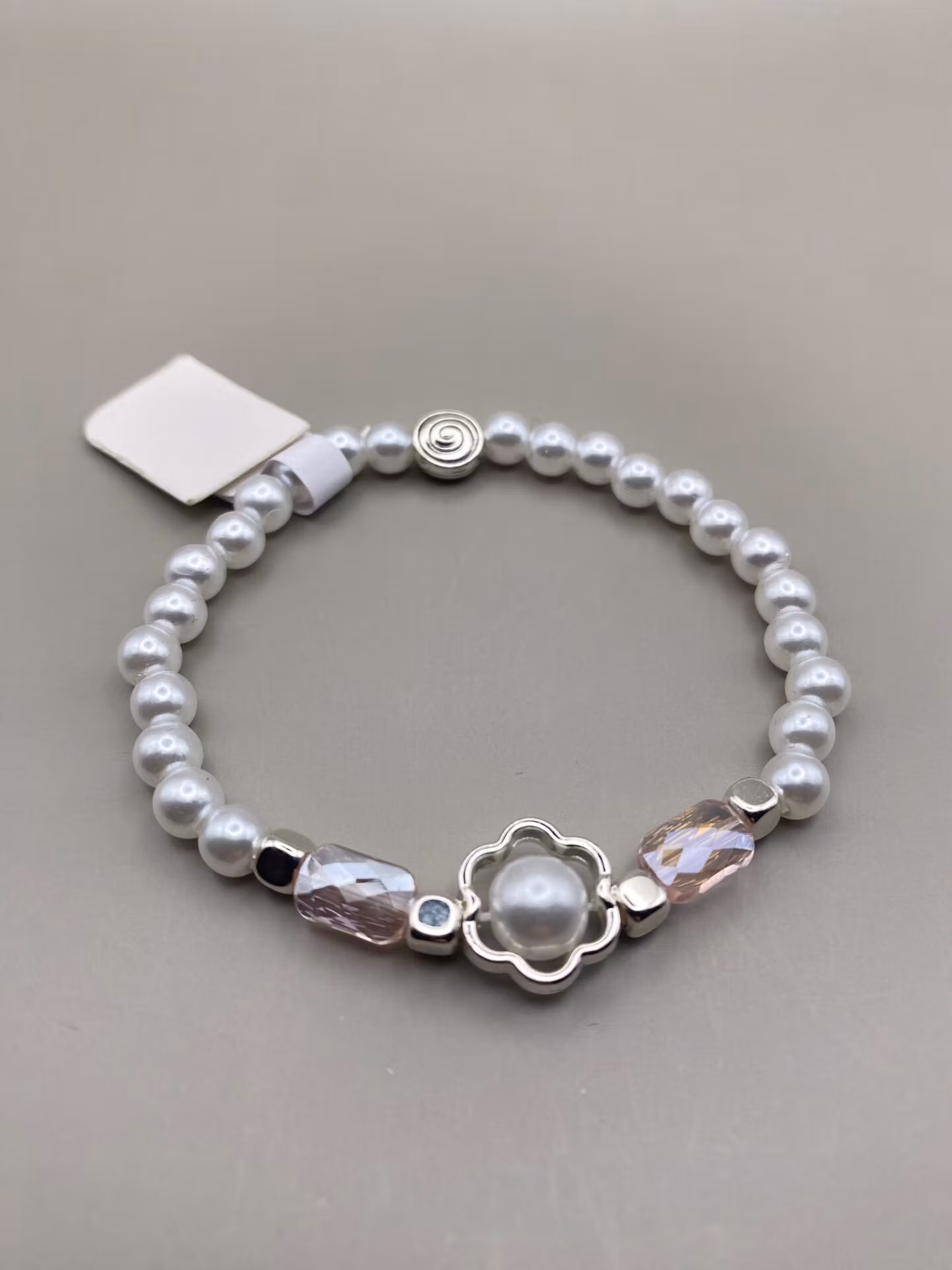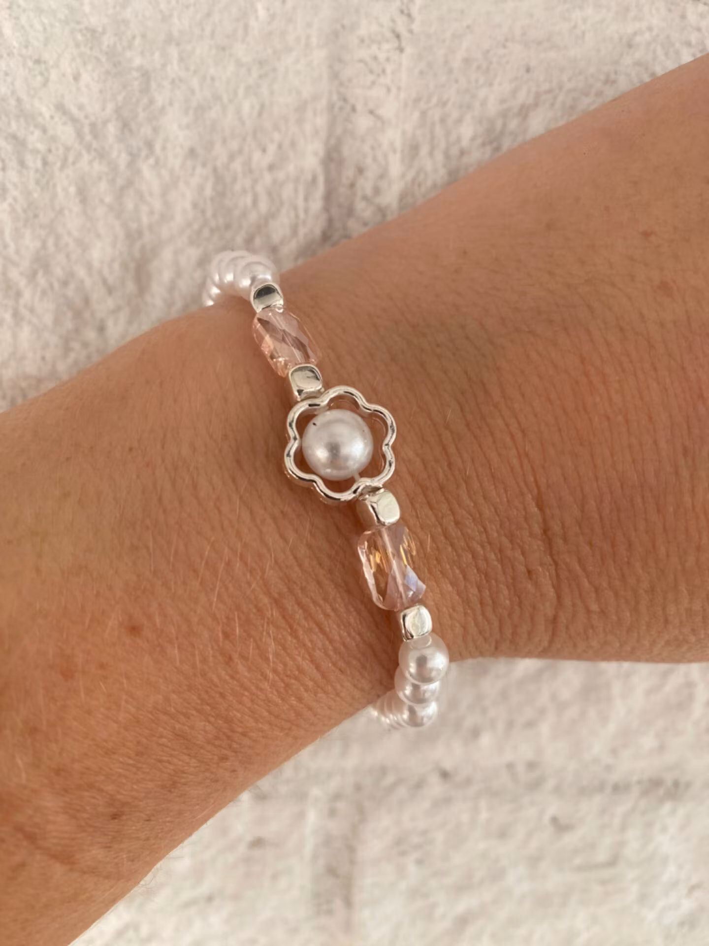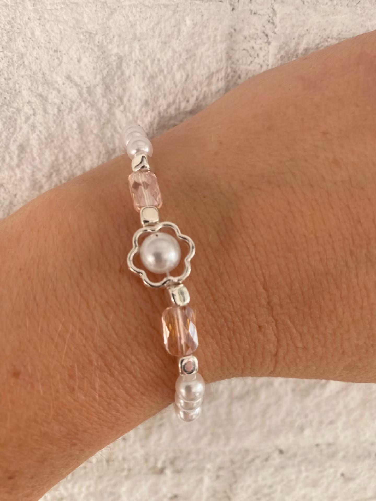 Vackert armband i kritvita glansiga pärlor runt om, rektangulära ljusrosa glaspärlor och silverfärgat hölje med större kritvit pärla i blickfånget. Fin avslutspärla.