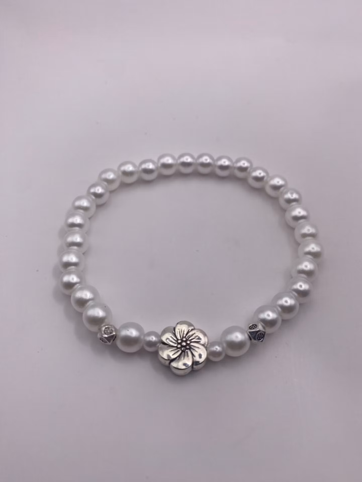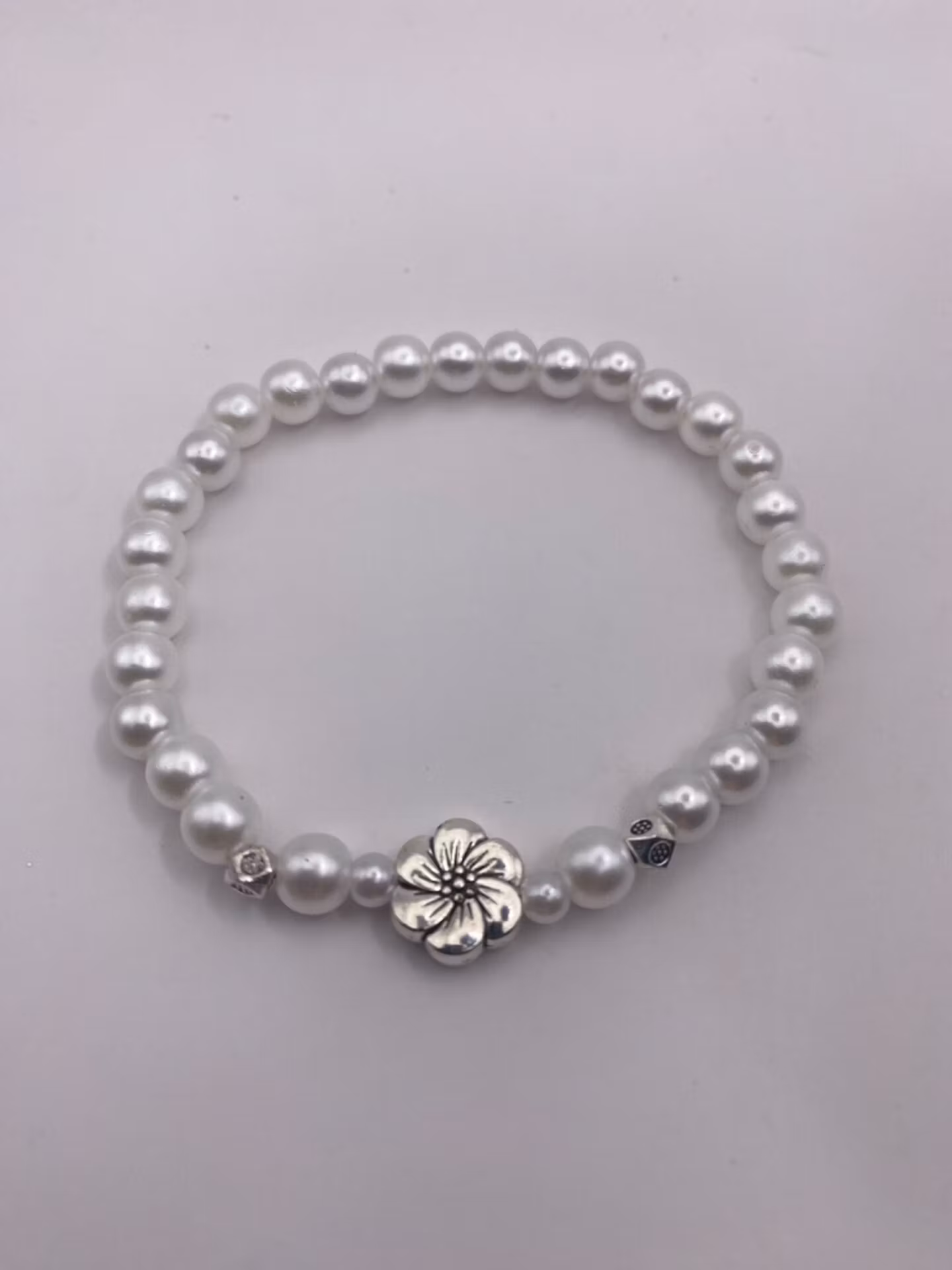 Vackert armband i kritvita glansiga mindre pärlor, fin silverfärgad blomma i blickfånget samt silverfärgade detaljer.pärlor: 6mm*Visas produkten "Tillfälligt sl