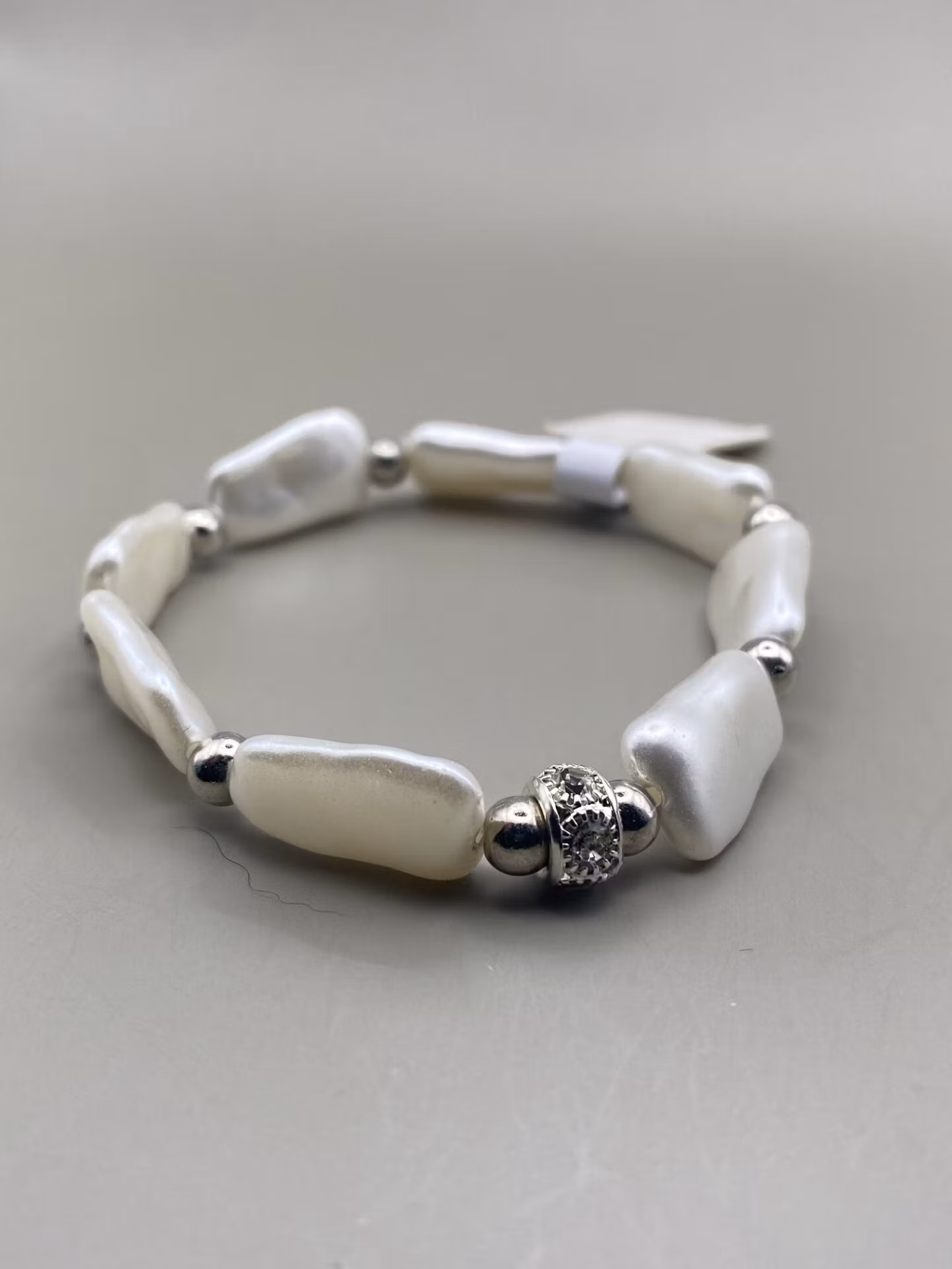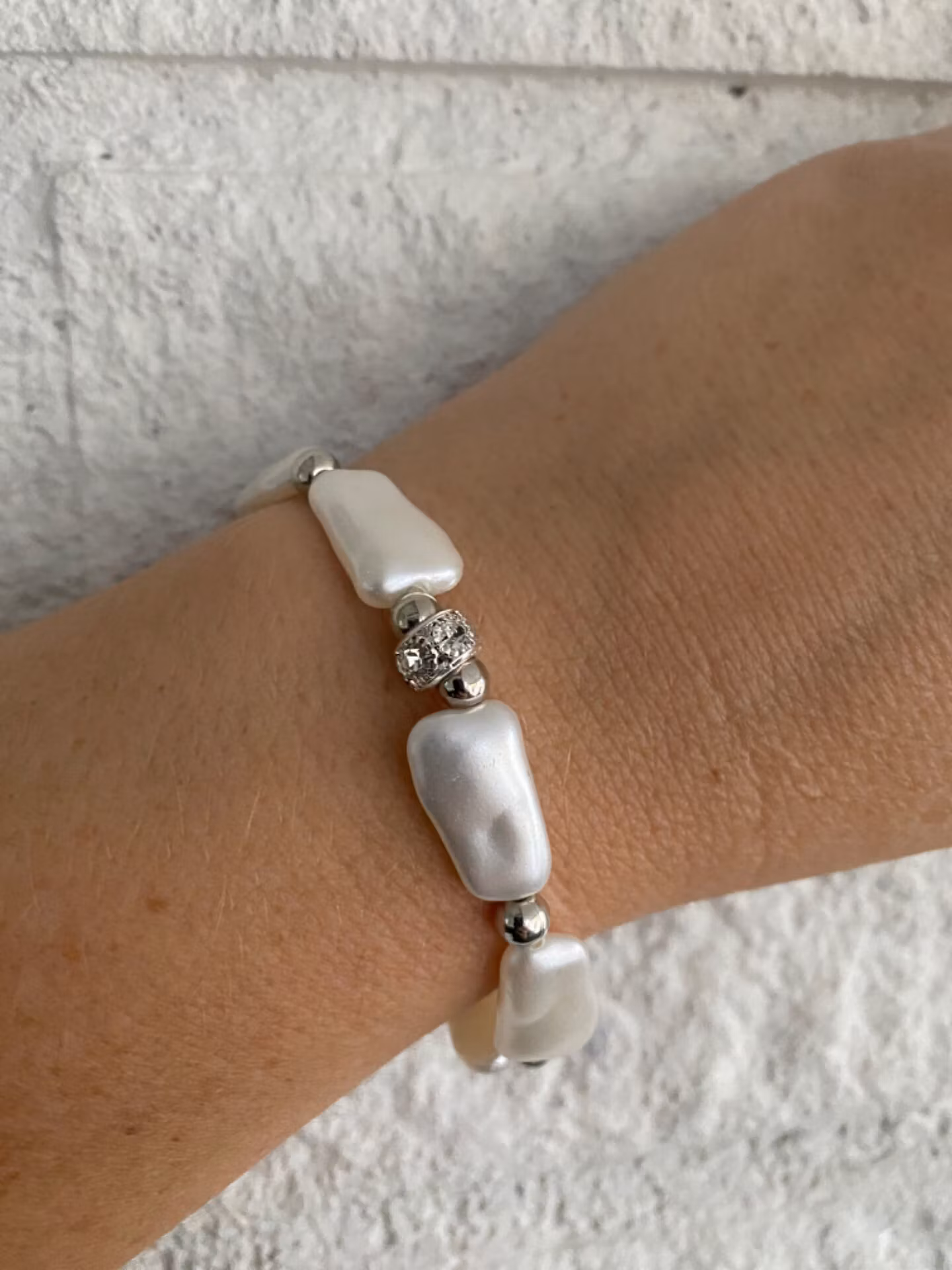 Väldigt elegant armband med oregelbundna blanka vita pärlor varvat med silverfärgade små pärlor och silverfärgad strassdetalj i blickfånget.