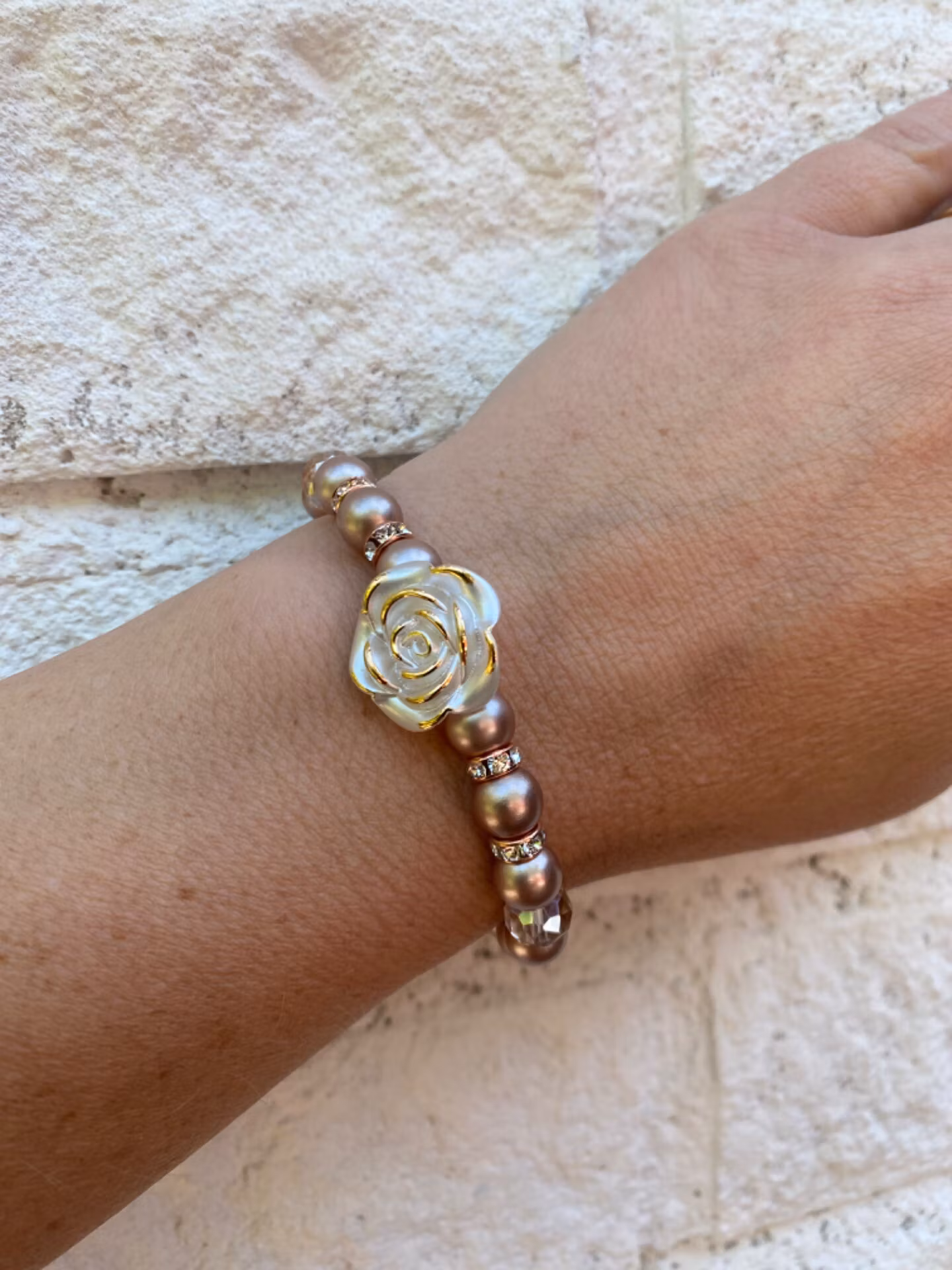 Armband i champagne toner, glasdetaljer, strass och blomma