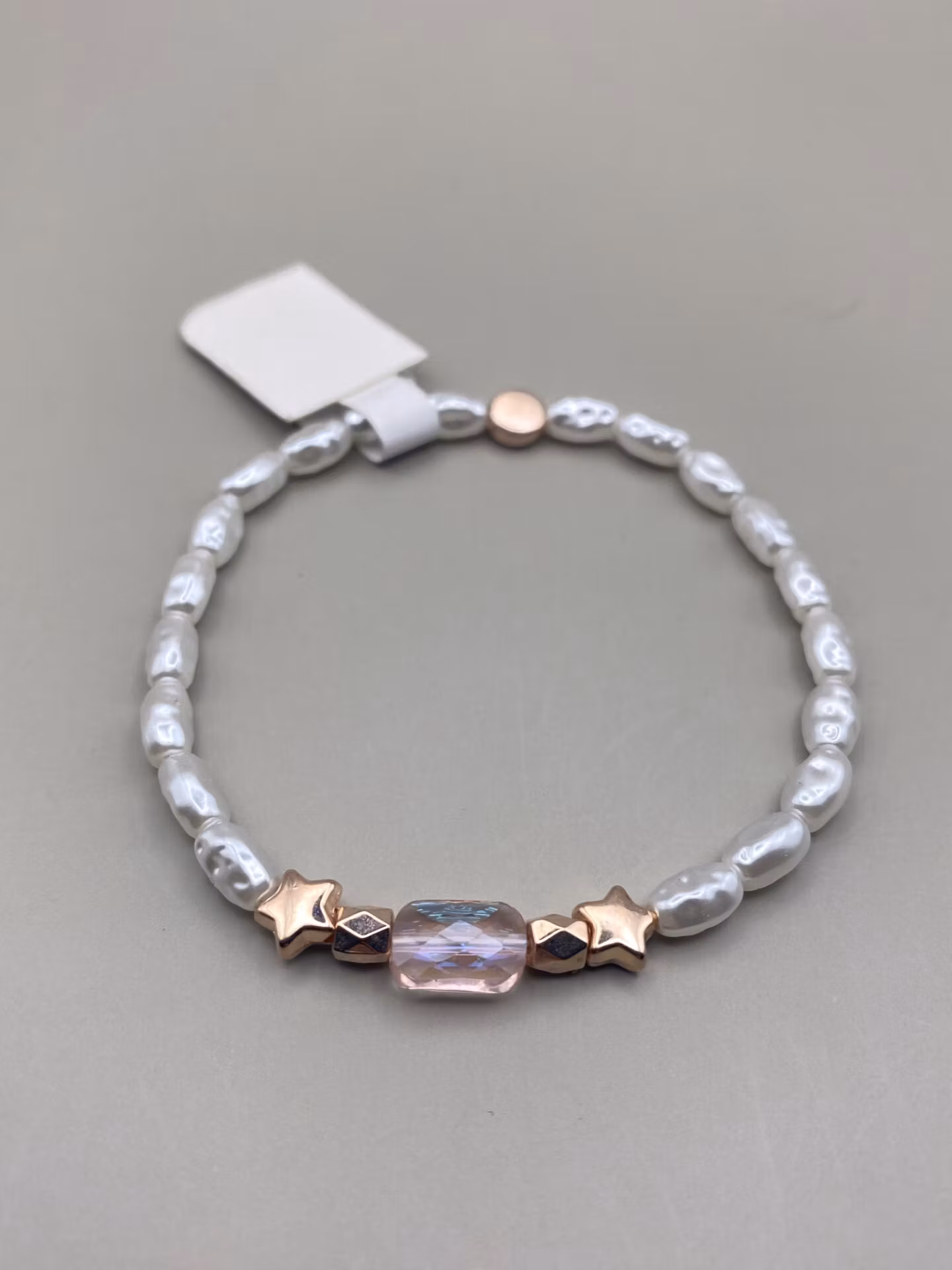Armband av kritvita oregelbundna pärlor, med roséfärgade detaljer av bland annat stjärnor. Ljusrosa större glassten i blickfånget