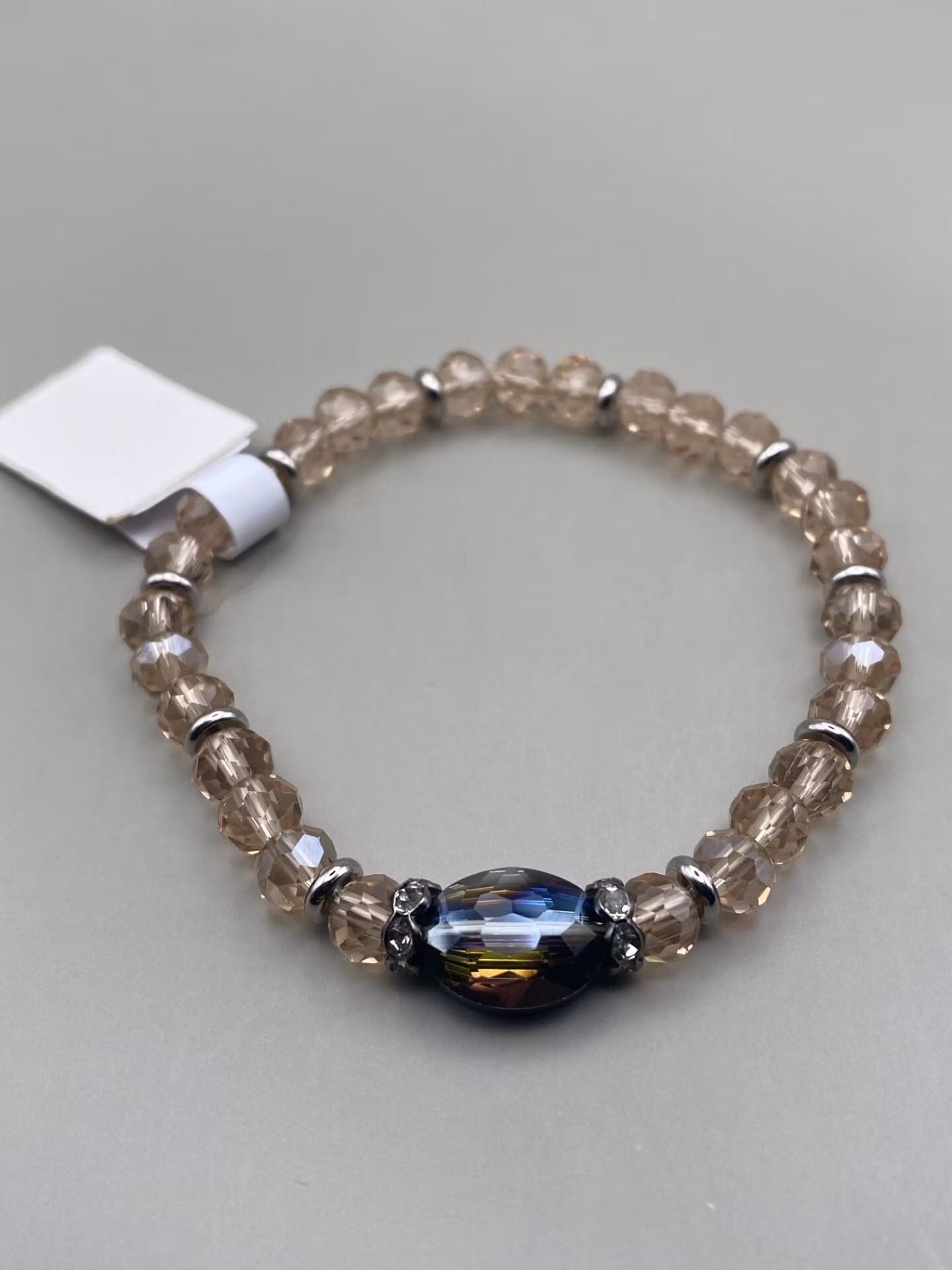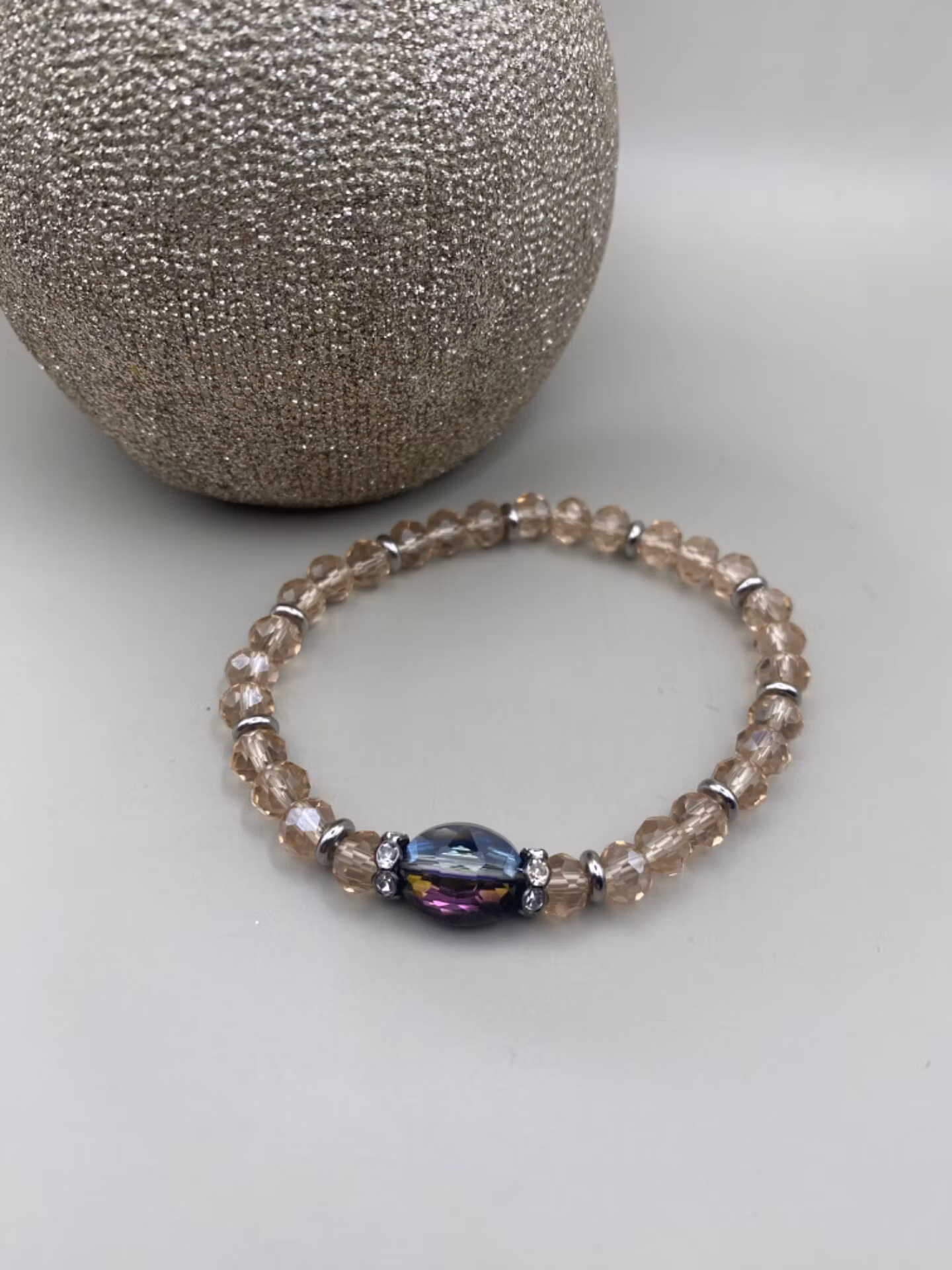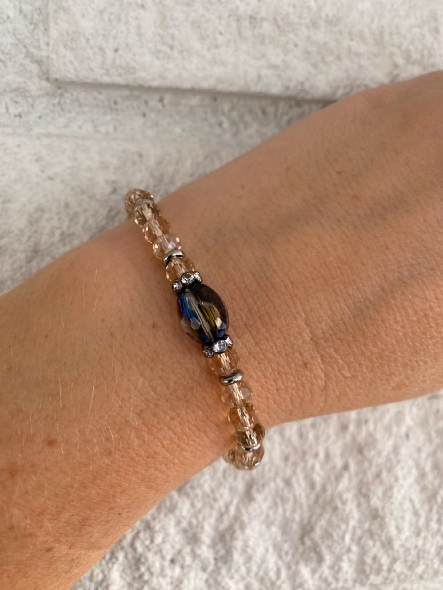 Skimrande armband med varvat champagnefärgade fasetterade glaspärlor och stålgrå distanser, större skimrande grå fasetterade glaspärla i blickfånget.