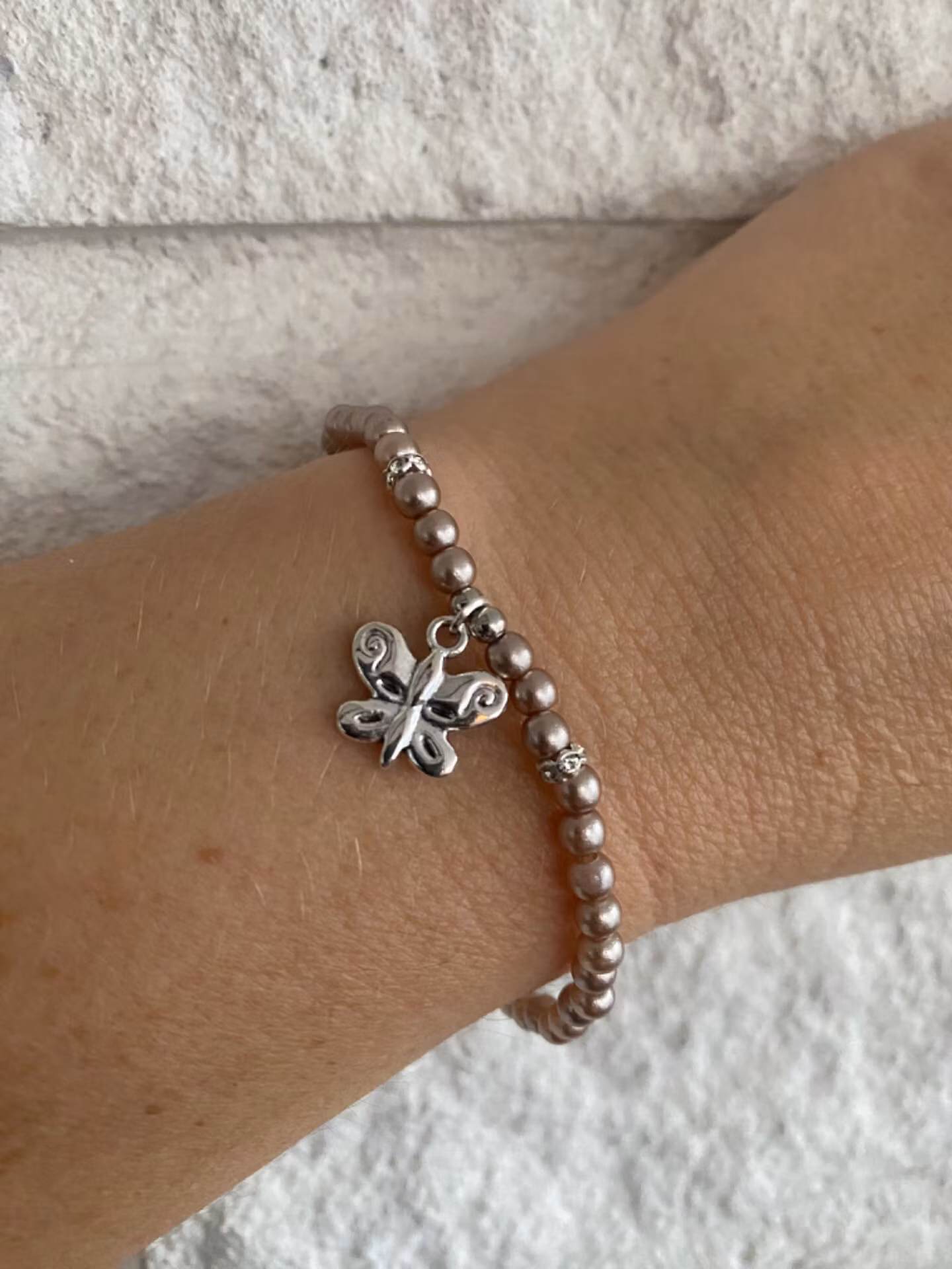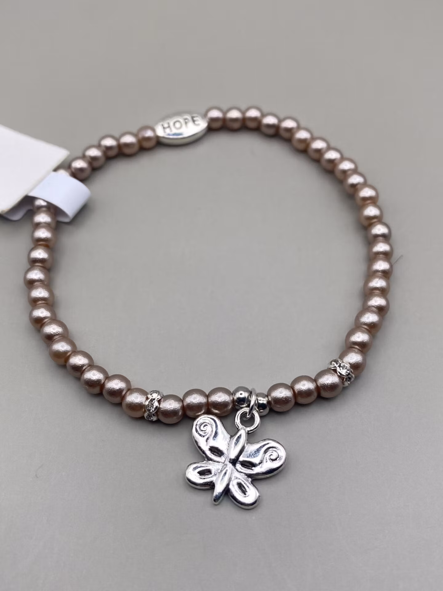 Tjusigt armband i champagnefärgade små pärlor med strass och dekorativ silverfärgad fjäril i blickfånget. Fin avslutspärla med text ”hope”Pärlor 4mmVisas produk