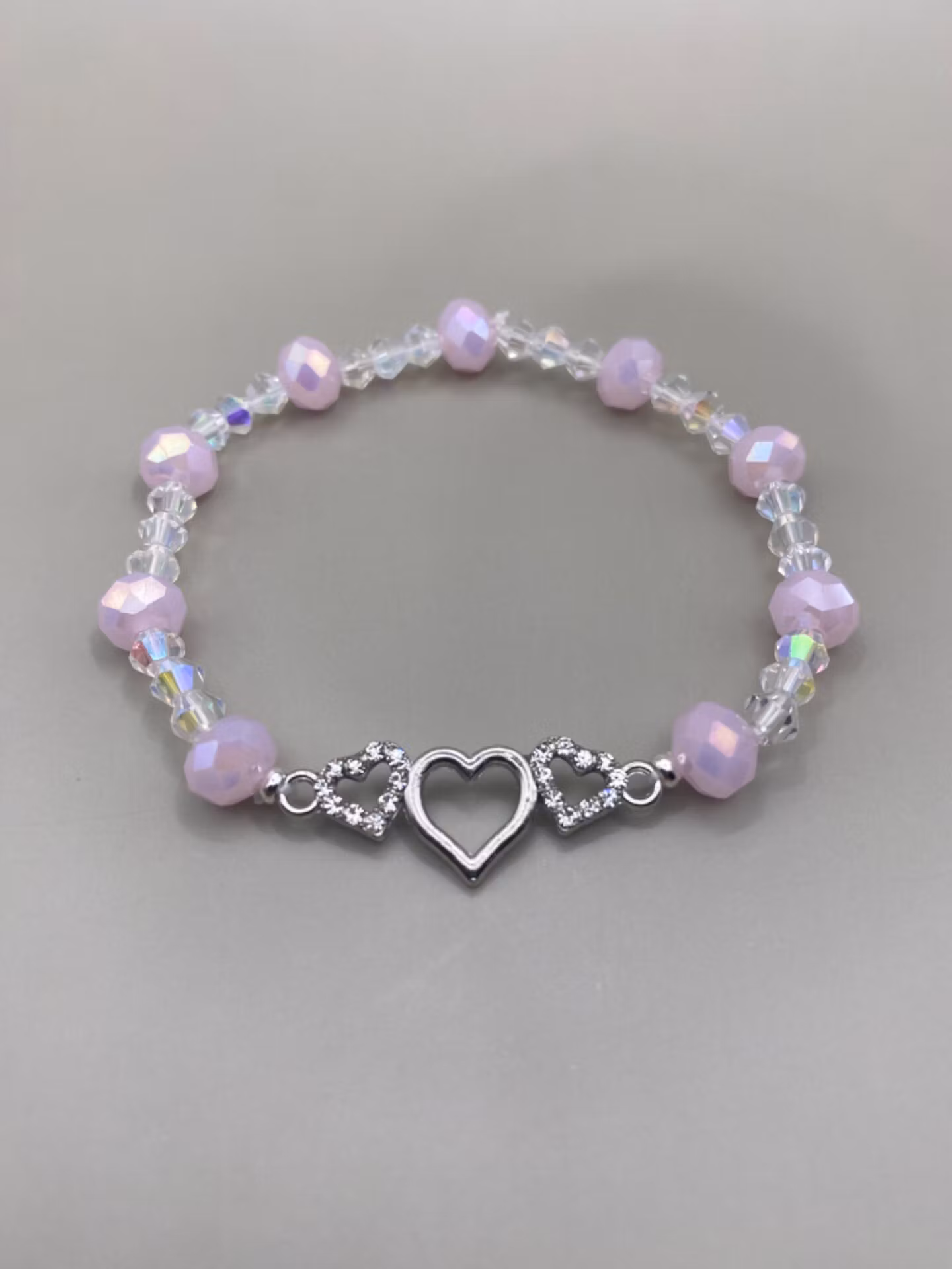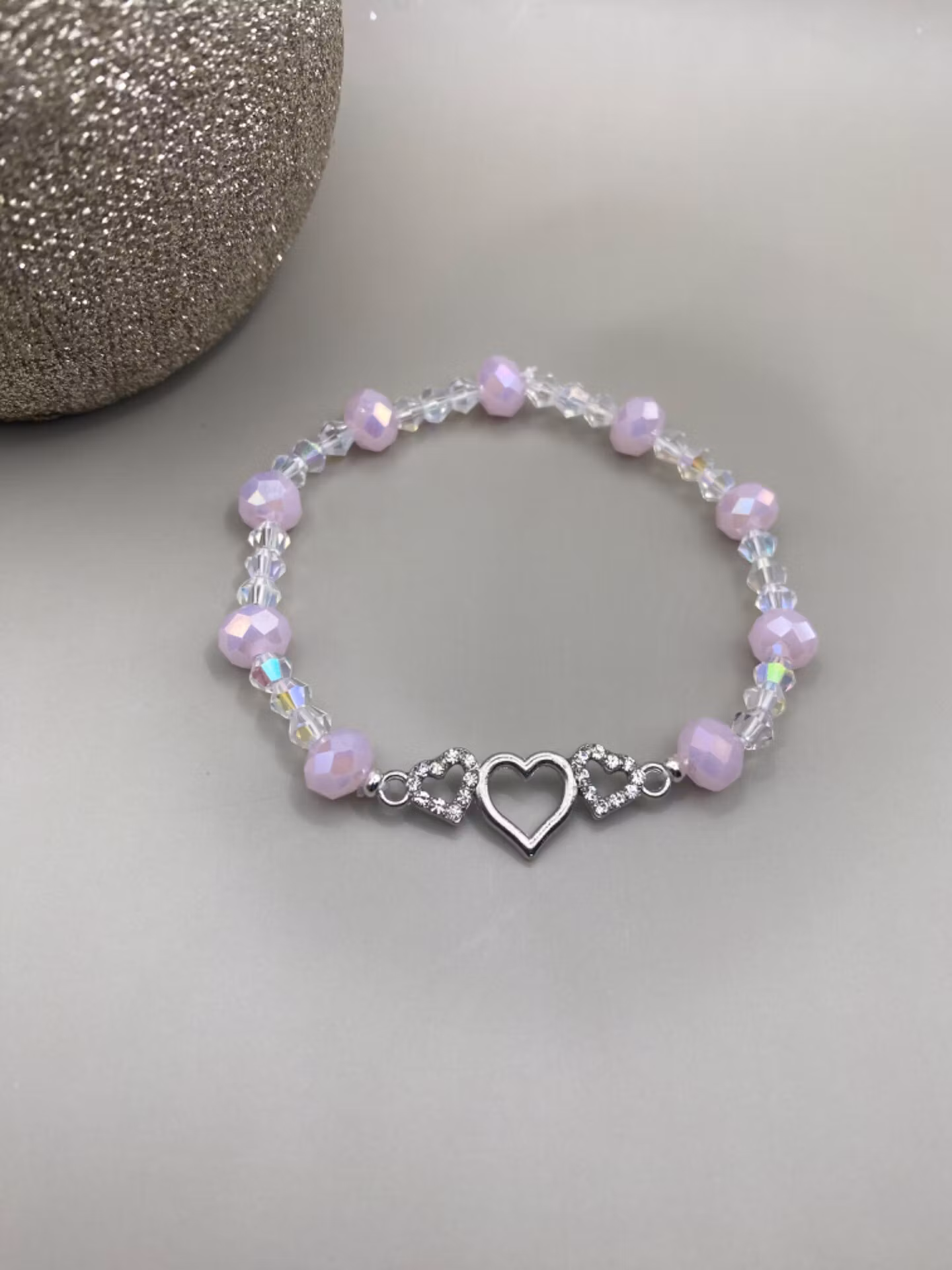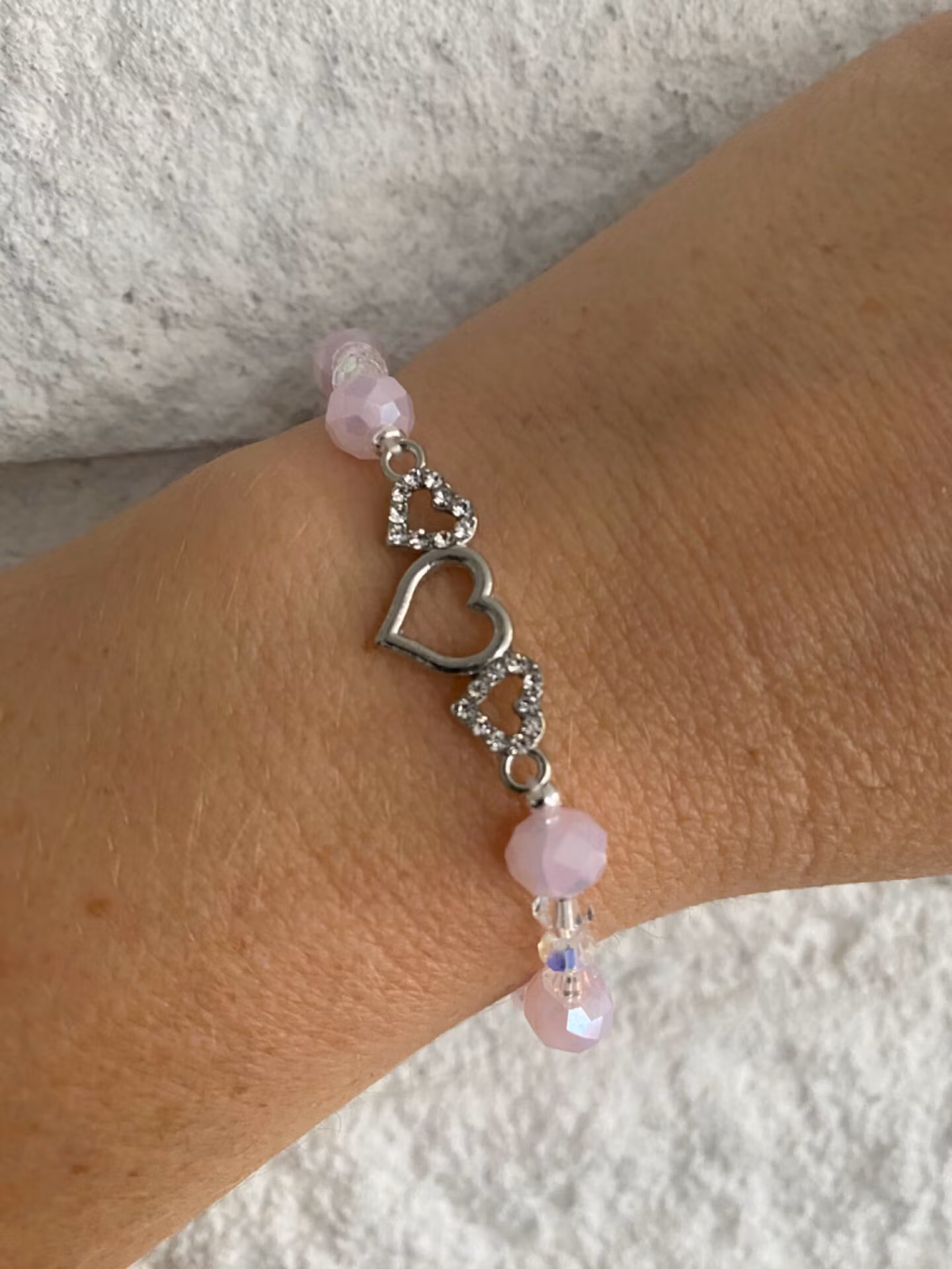 Fint och lekfullt armband i fint varvat mönster av fasetterade pastellrosa glänsade glaspärlor och små hologram-aktiga genomskinliga glaspärlor. Fin silverfärgad berlock i form av tre hjärtan, två med strass i blickfånget.