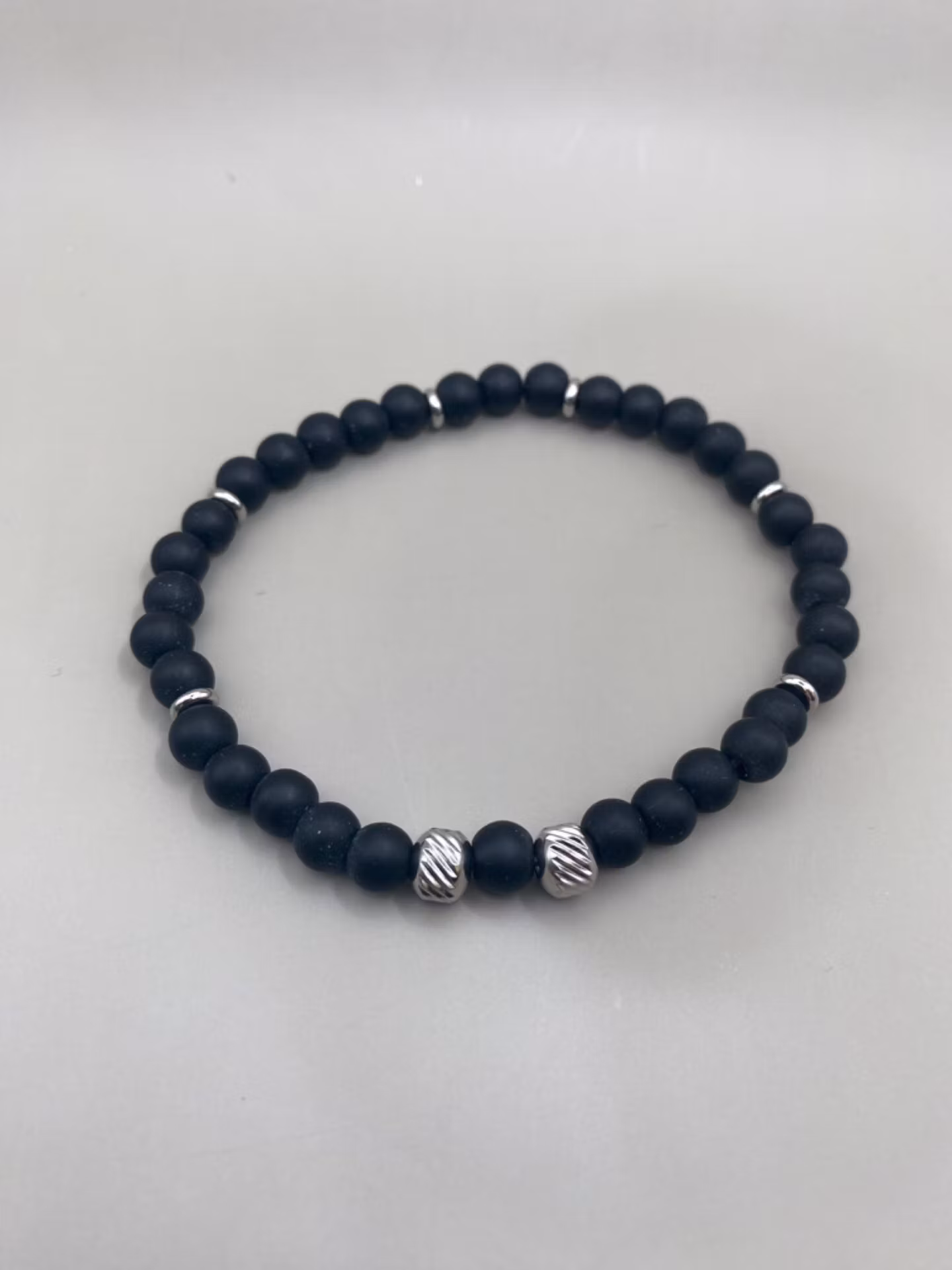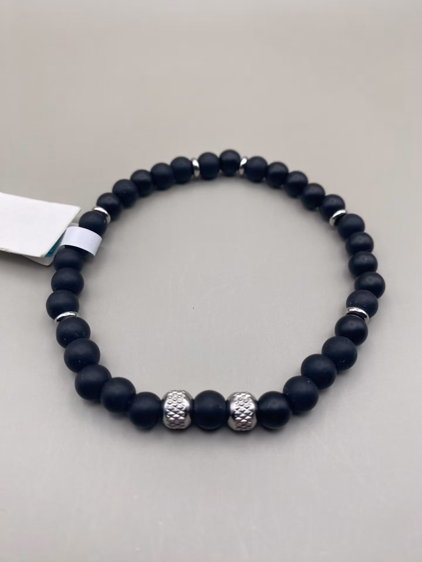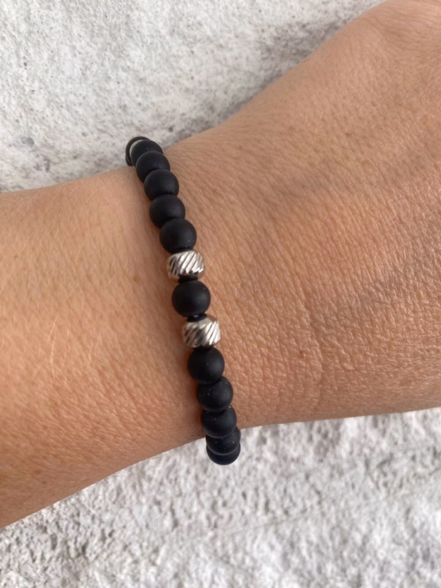 Enkelt stilrent armband i mattsvarta pärlor med lite tyngd, rostfria distanser och stilrena mönstrade detaljer i rostfritt stål i blickfånget. Pärlor 6mm*Visas