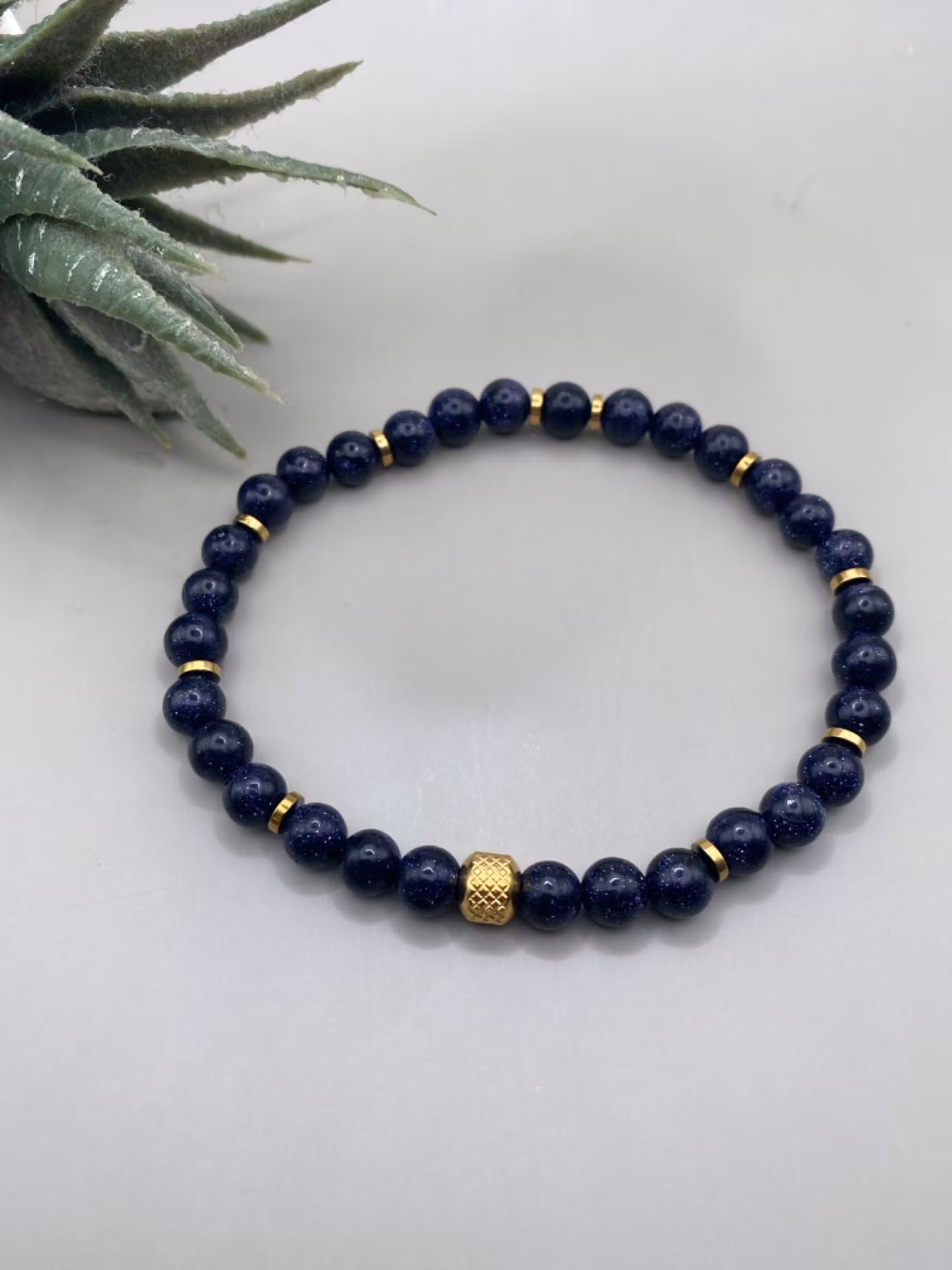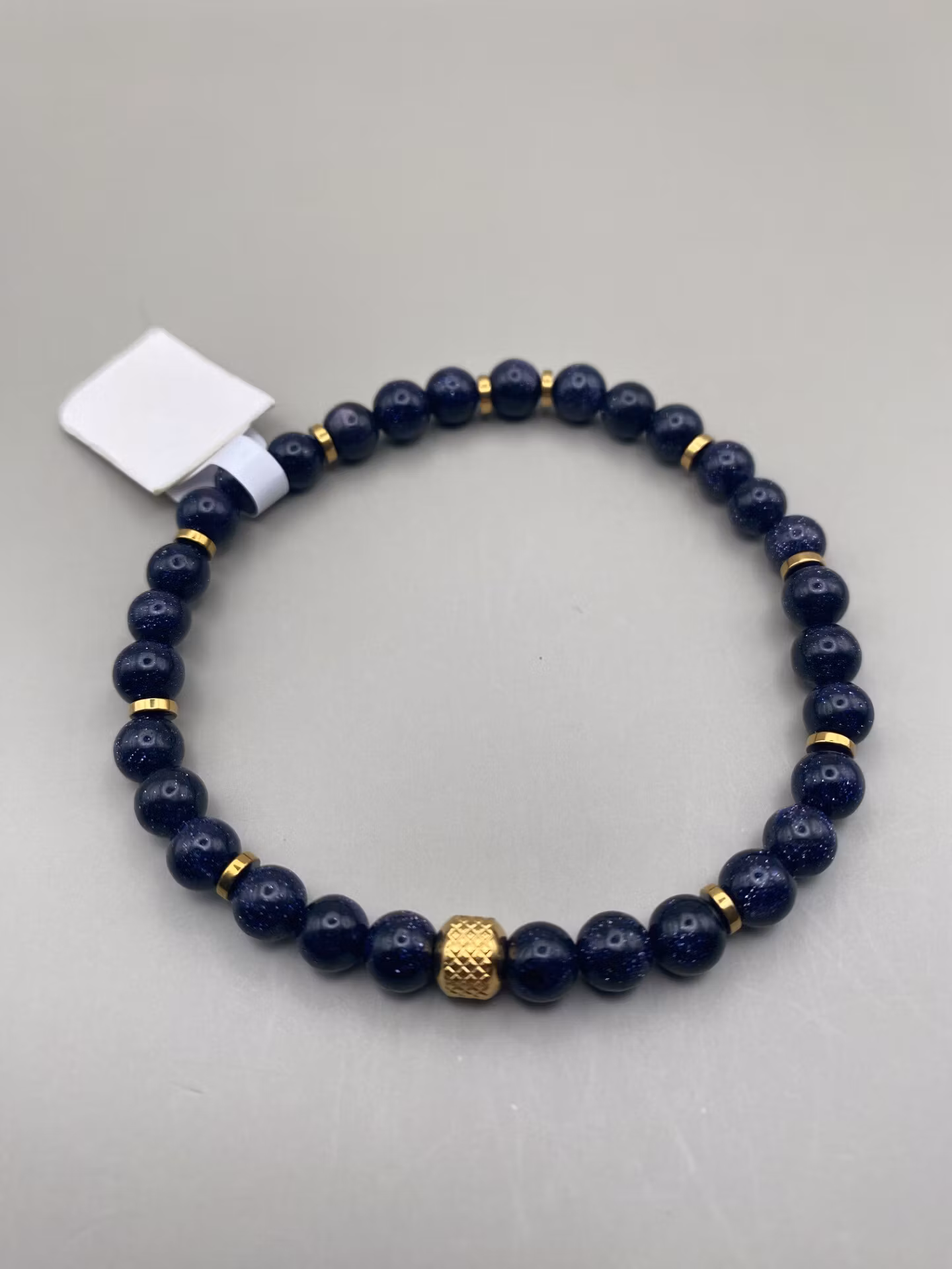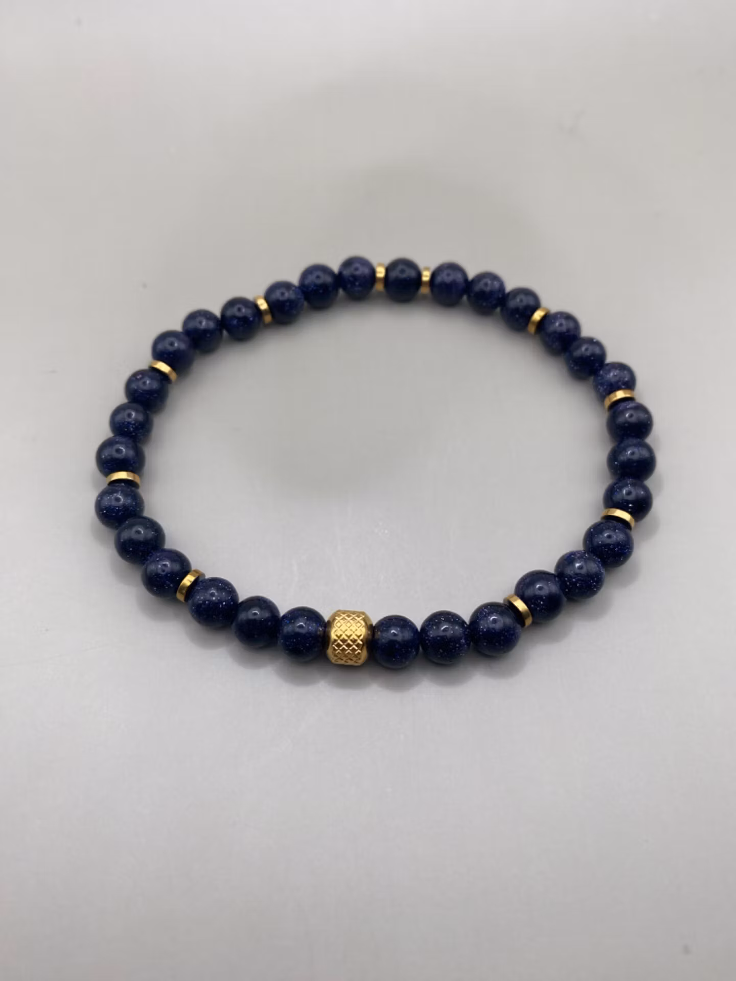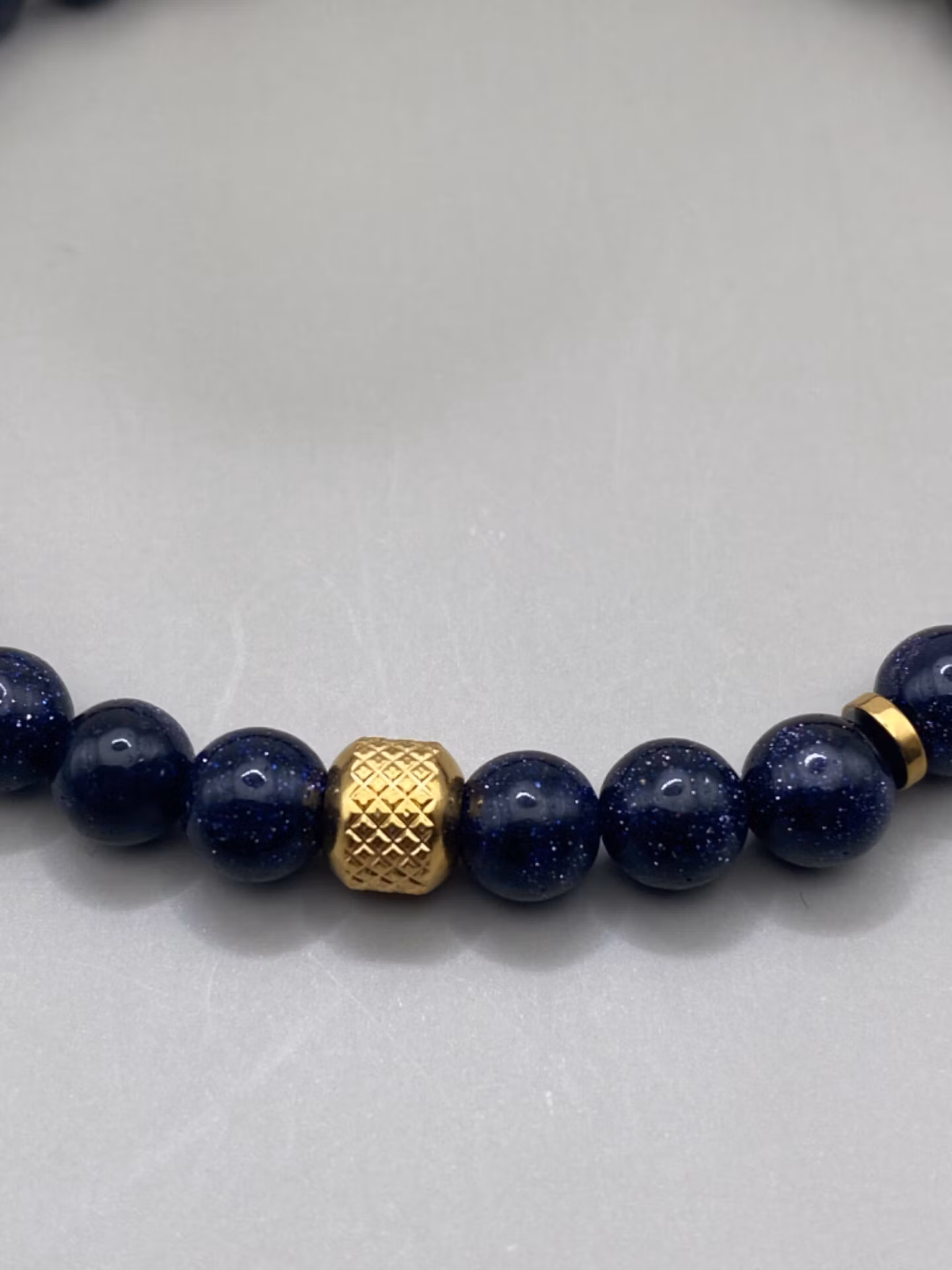 Stilrent armband i mörkt mörkblå mellanstora pärlor med lite tyngd och aningen skimrande, rostfria guldfärgade distanser och stilren mönstrad detalj i guldfärga