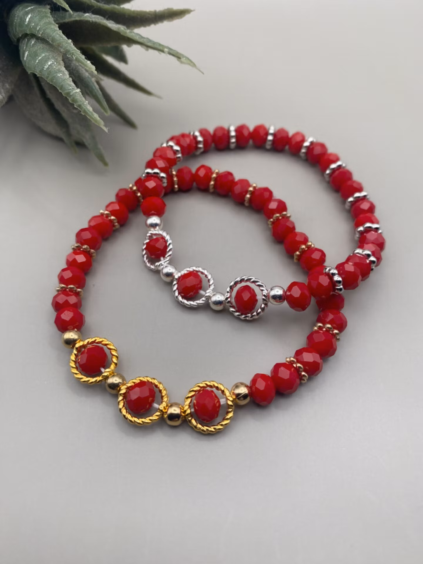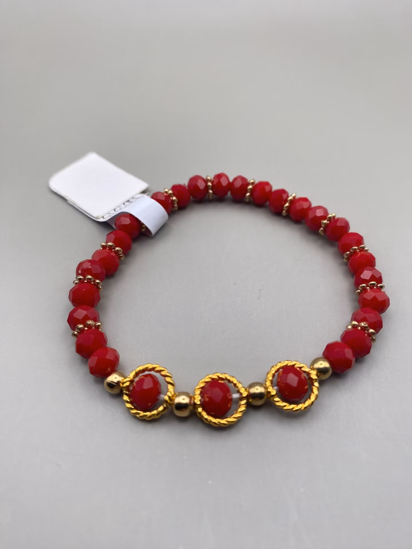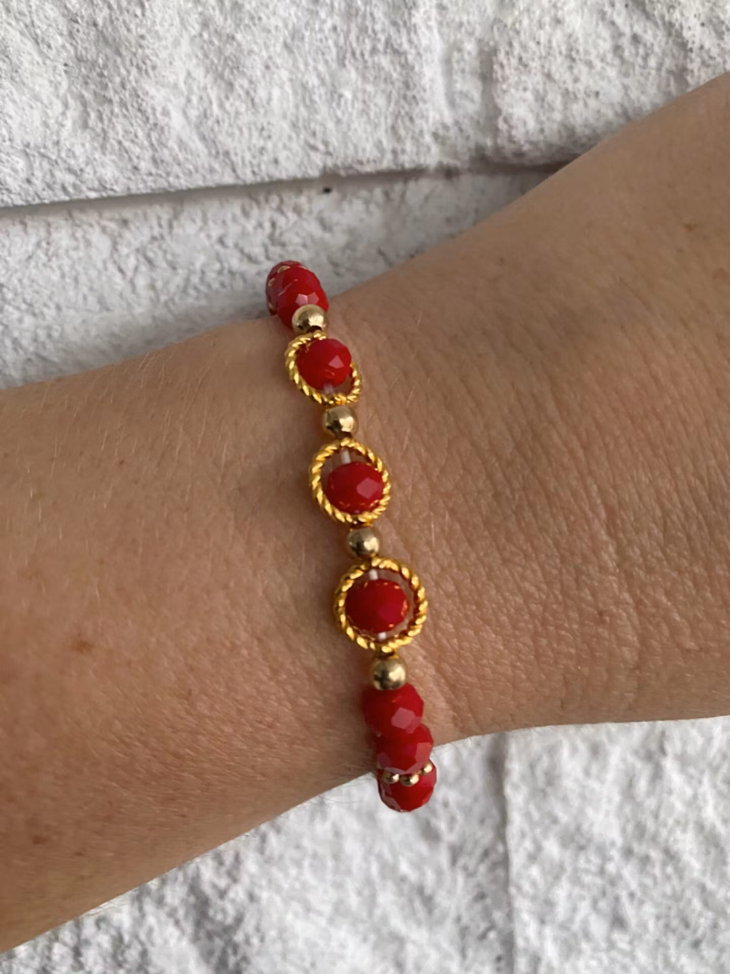 Fint armband av röda blanka fasetterade glaspärlor varvat med guldfärgade distanser och tre guldfärgade höljen kring tre av pärlorna i blickfånget