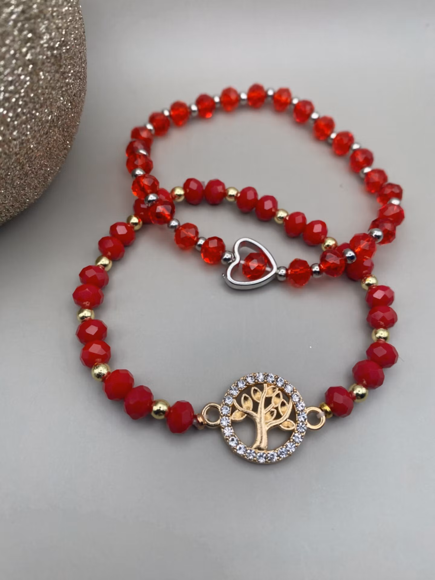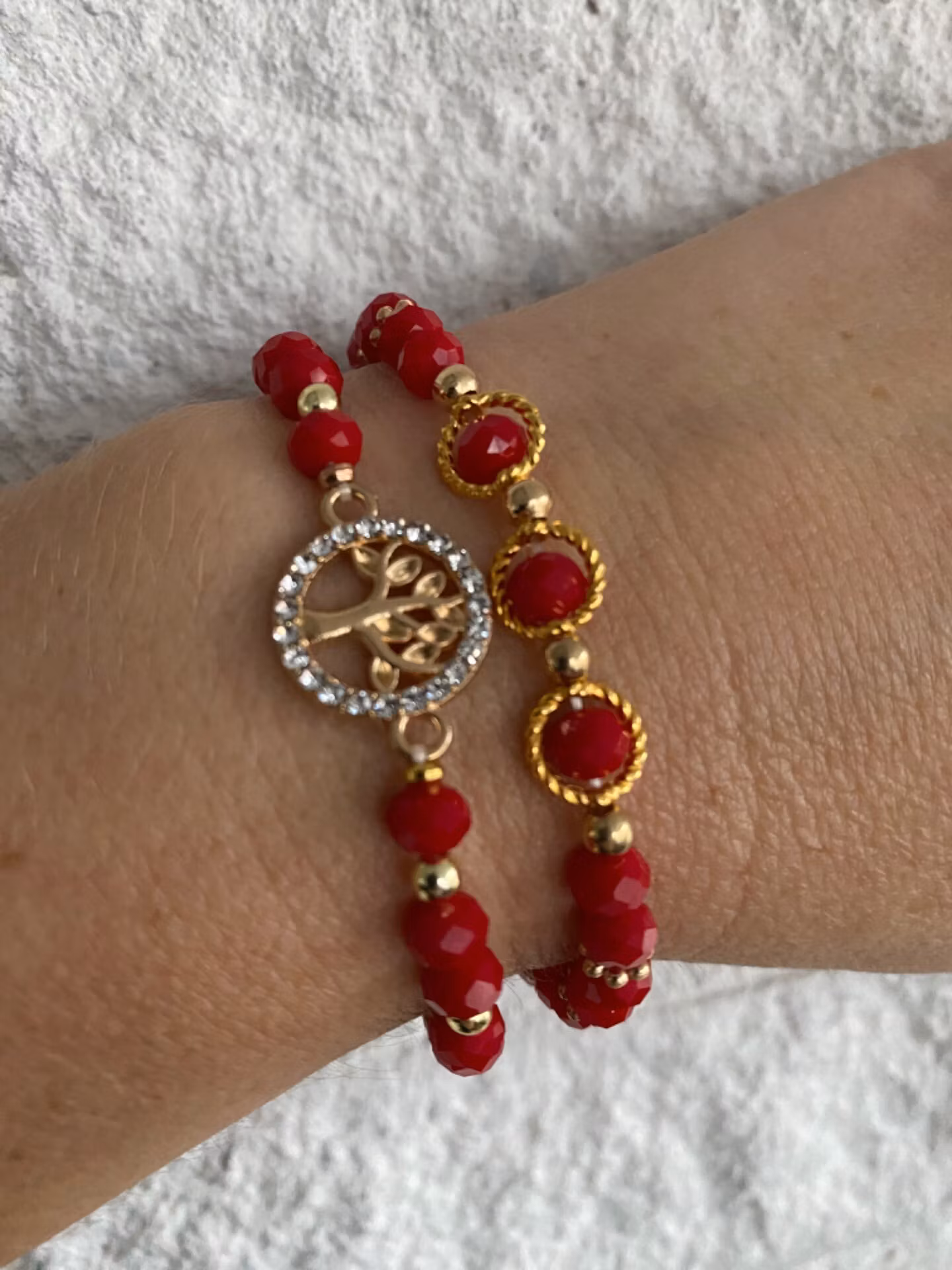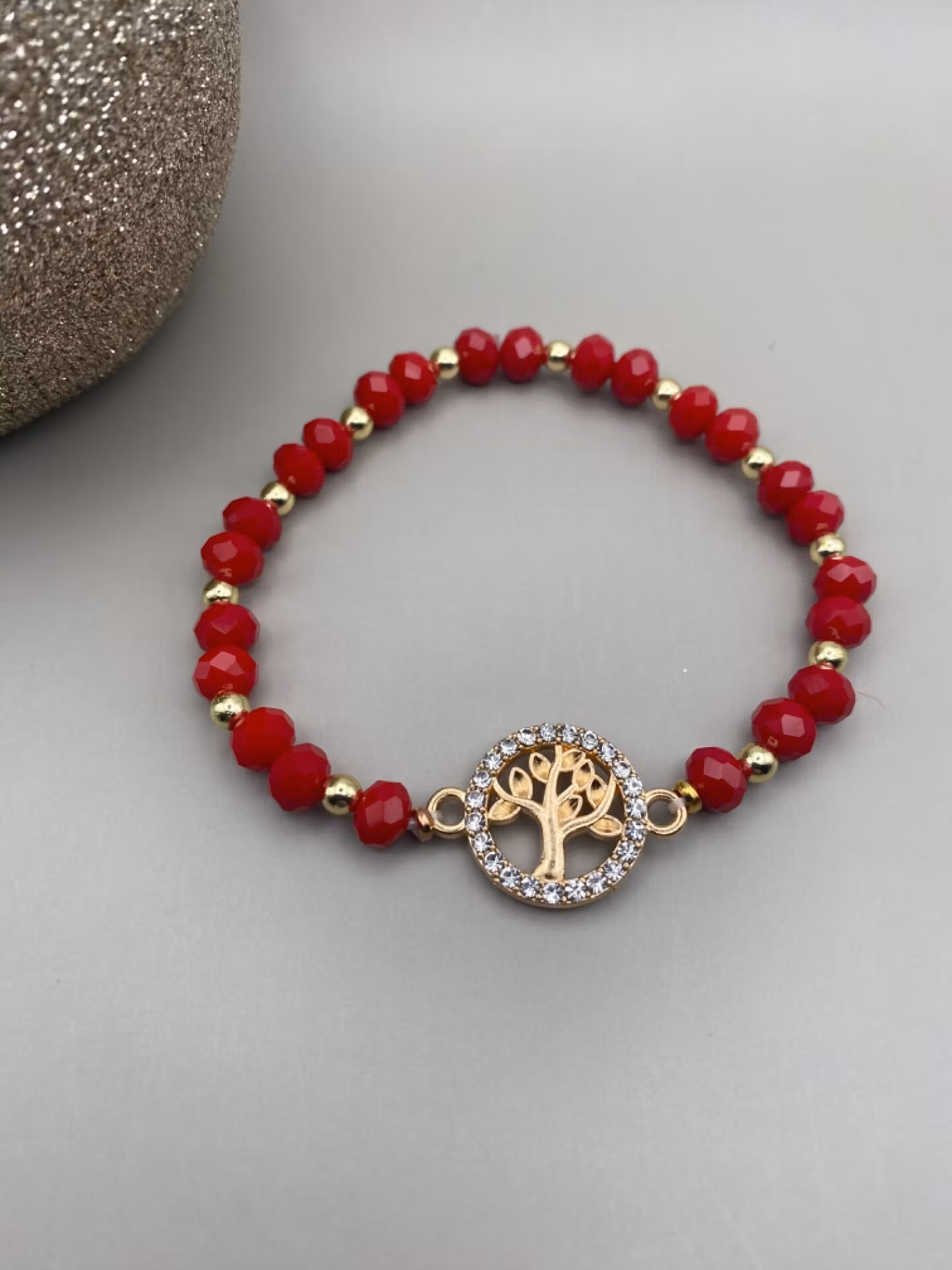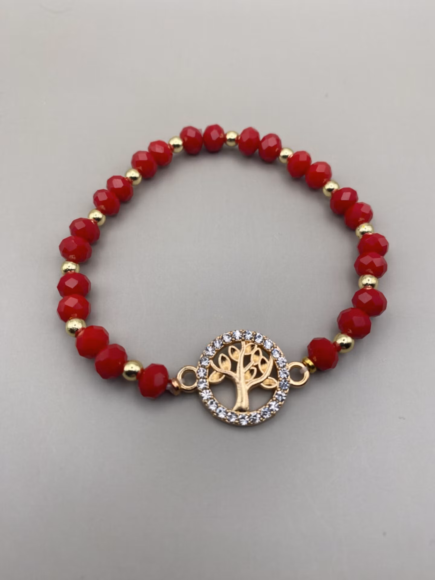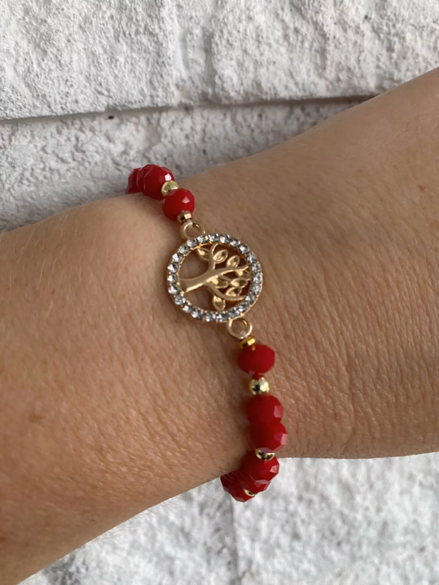 Fint armband av röda blanka glaspärlor varvat med guldfärgade små pärlor. Berlock i form av ”livets träd” med strass i blickfånget.