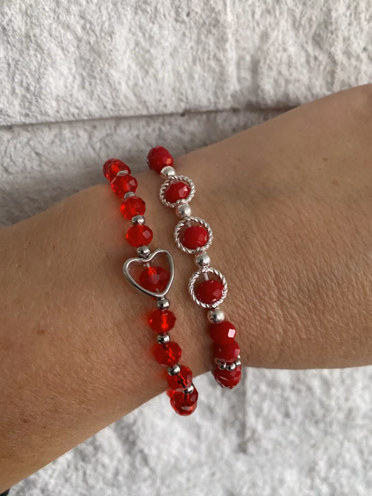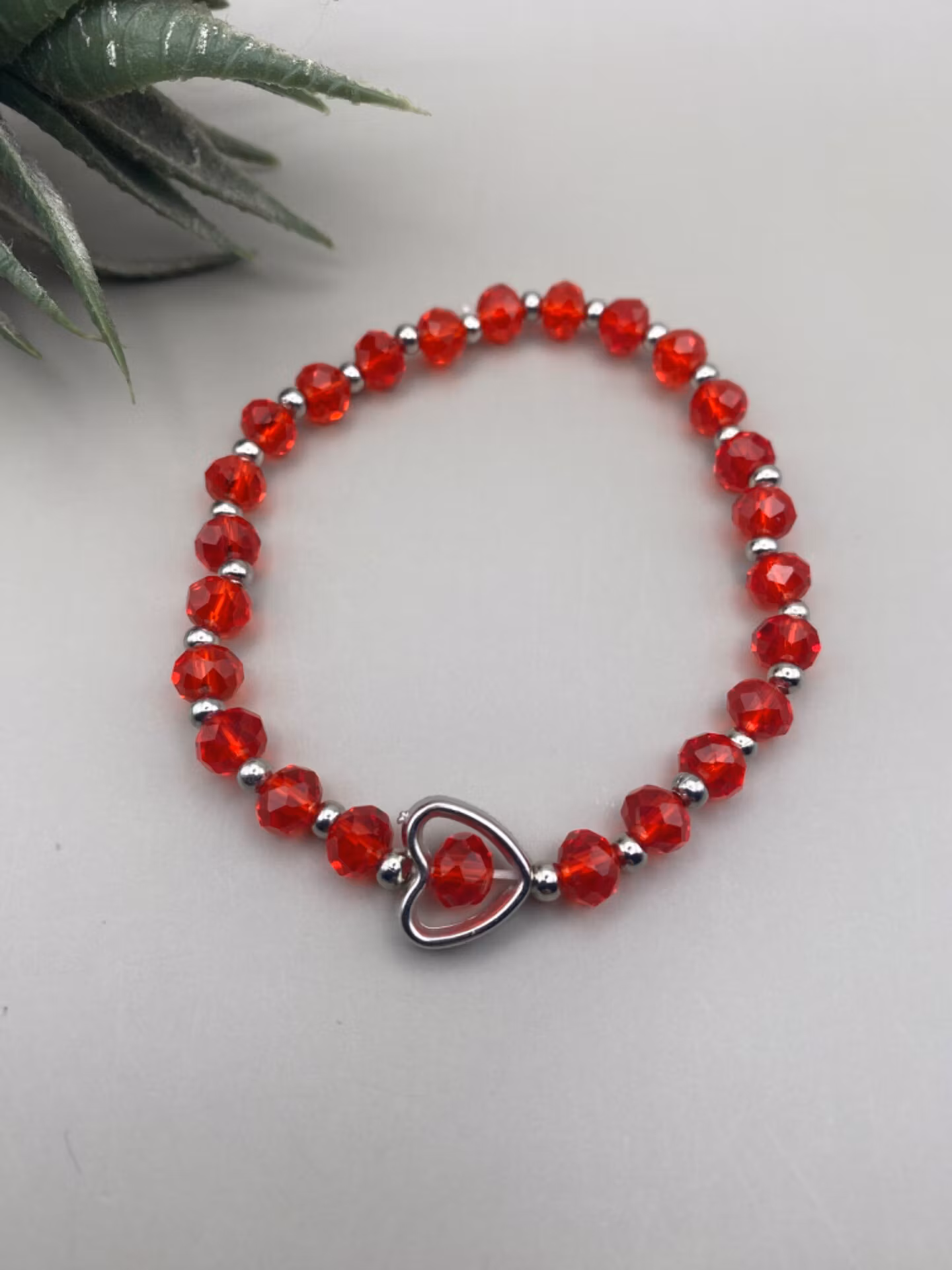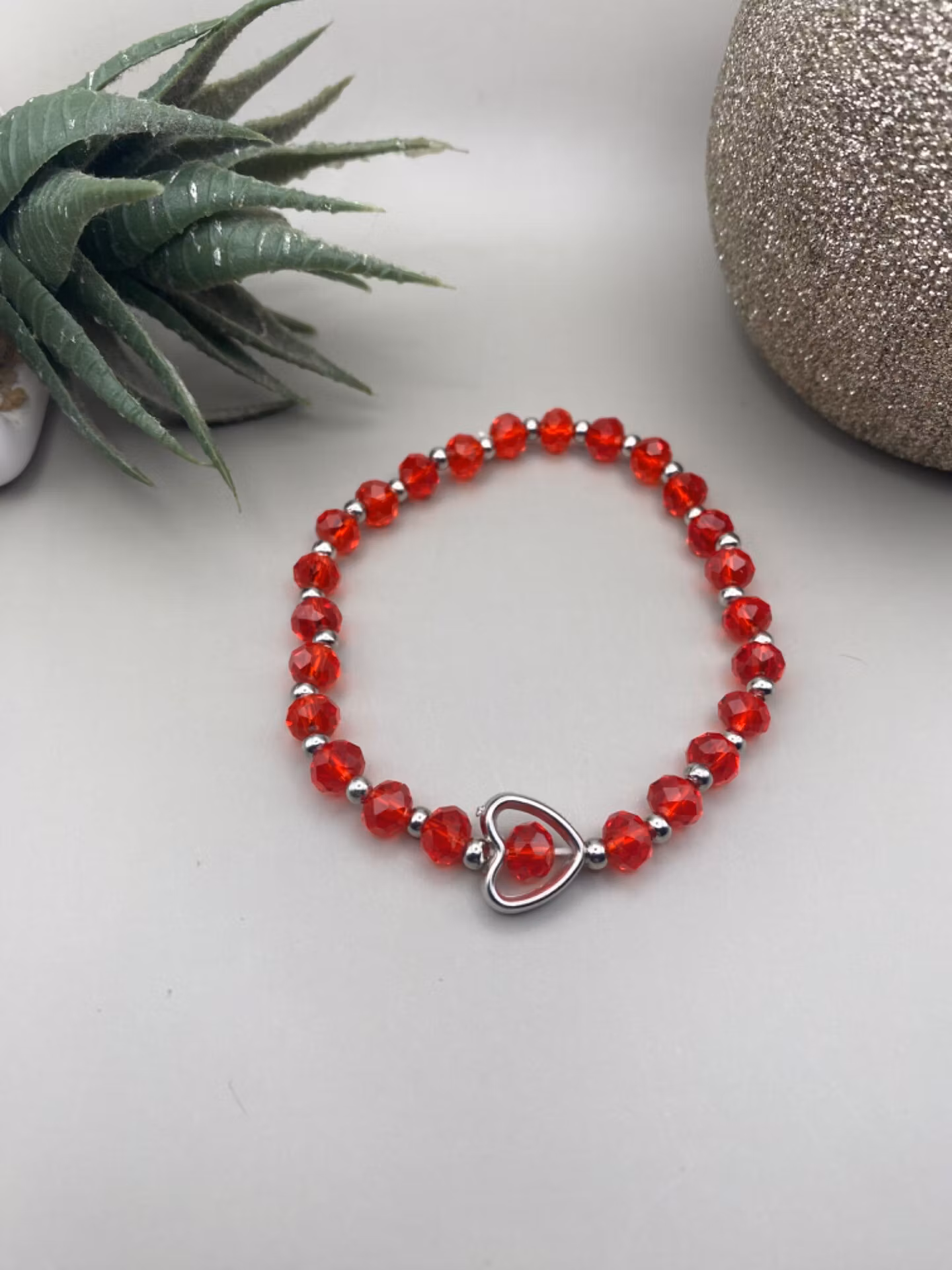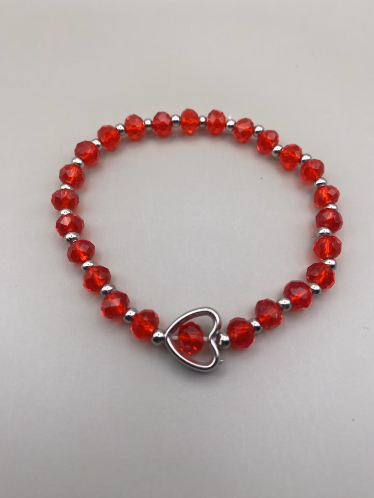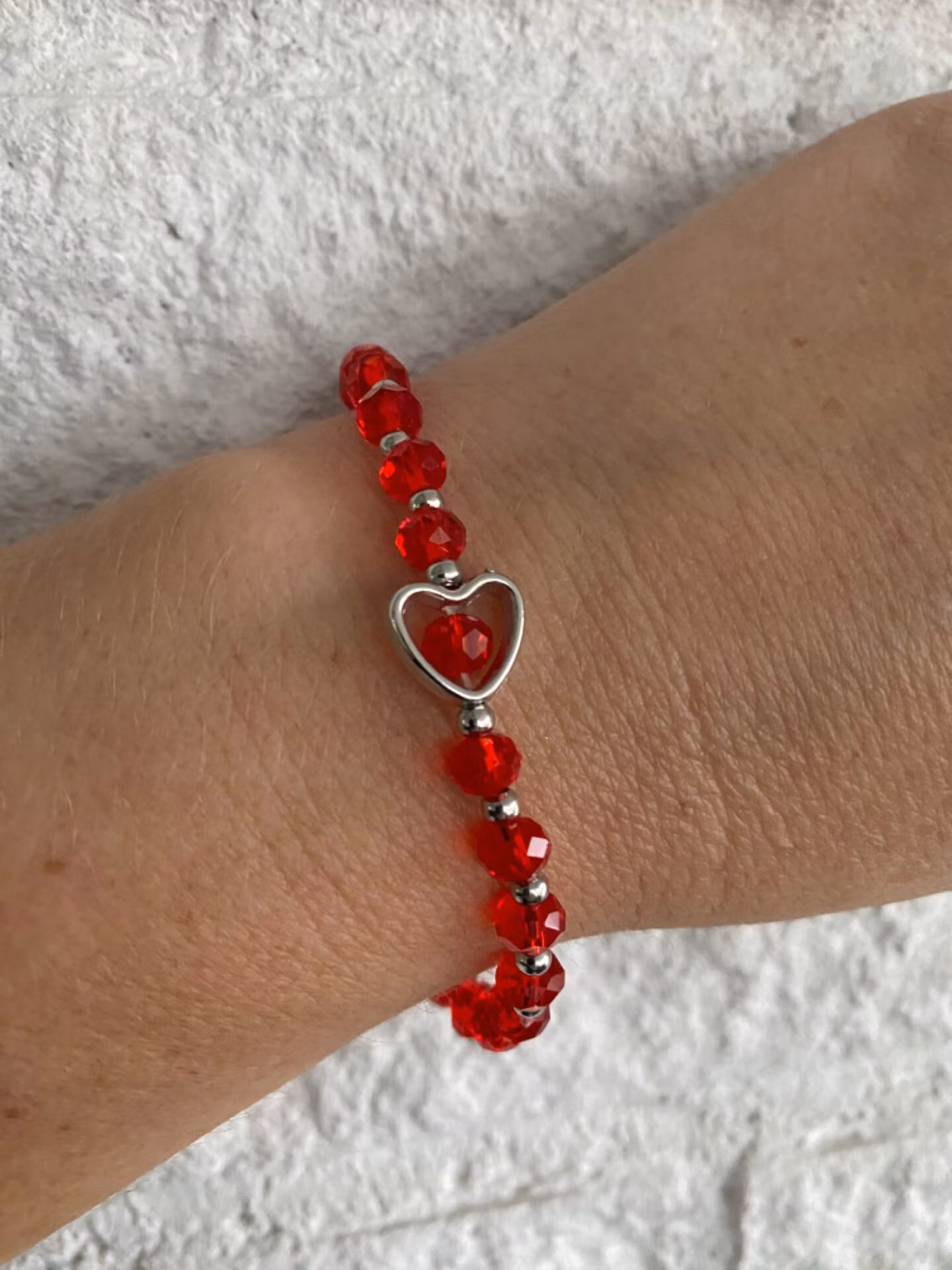 Tjusigt armband av röda genomskinliga glaspärlor varvat med silverfärgade små pärlor. Ett silverfärgat hölje i form av ett hjärta kring en röd glaspärla i blickfånget.