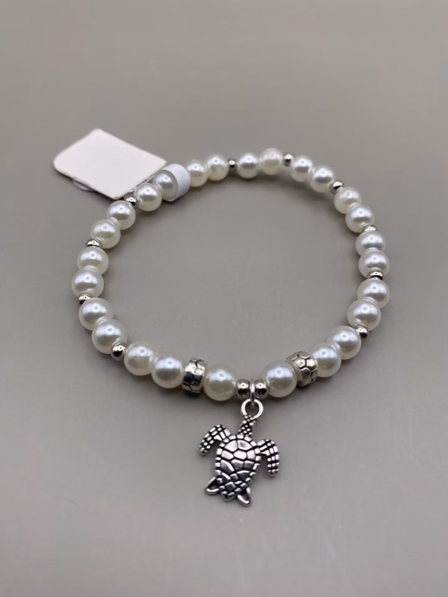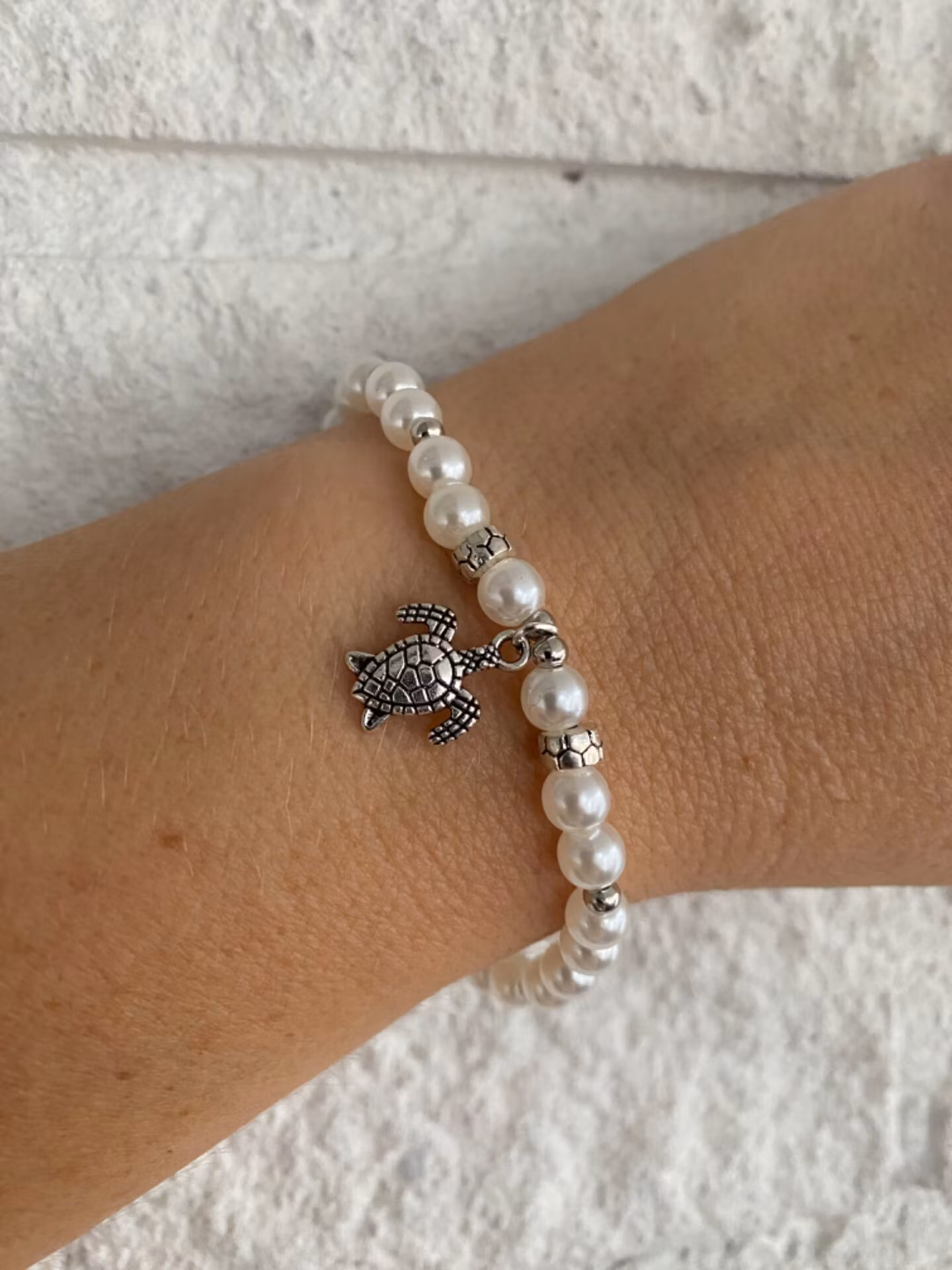 Skimrande armband av blanka benvita pärlor varvat med silverfärgade små pärlor, två mönstrade silverfärgade pärlor samt en antiksilverfärgad sköldpadda som berlock i blickfånget.