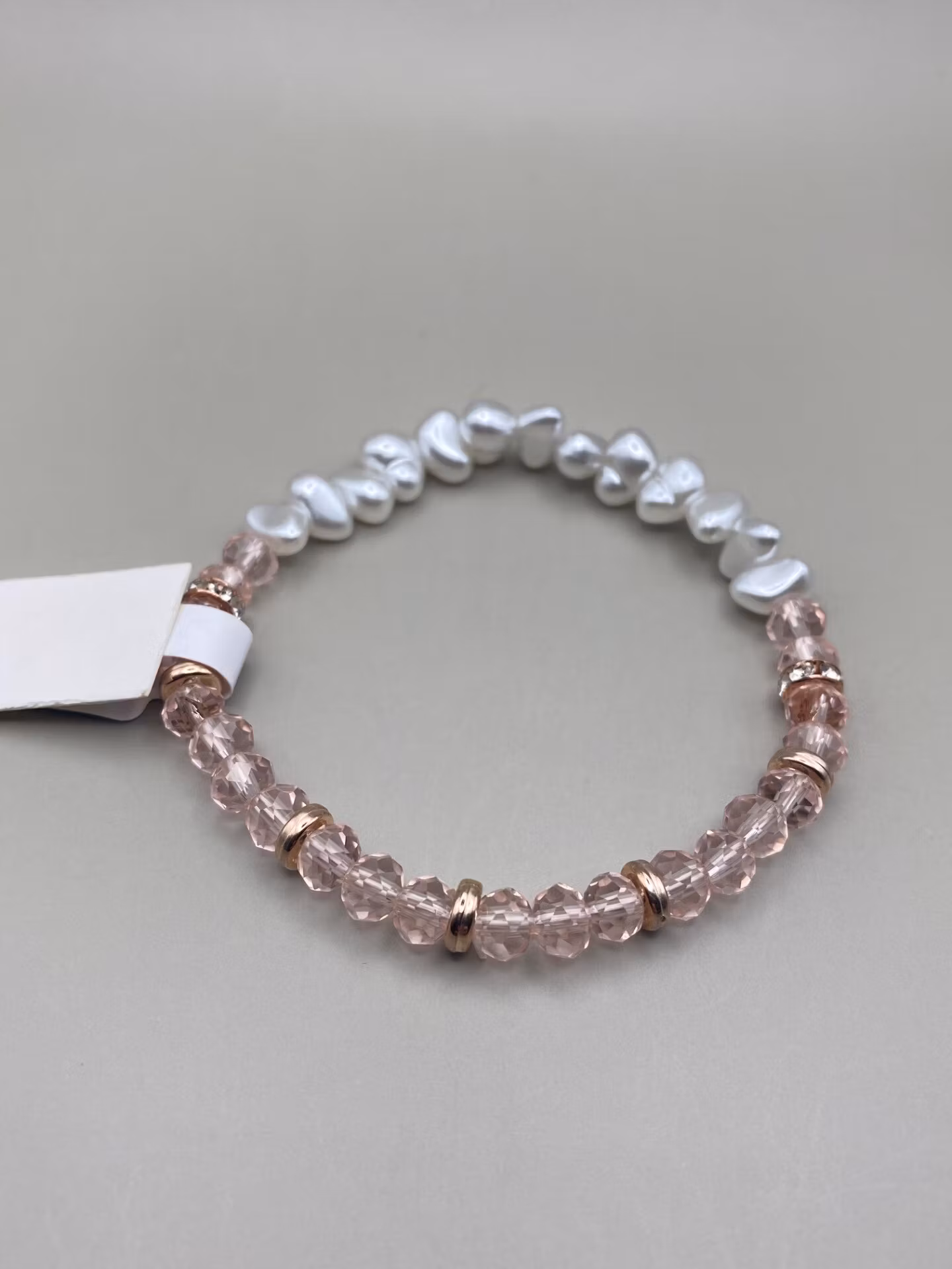 Armband av benvita blanka oregelbundna pärlor samt ljusrosa glaspärlor och roséfärgade detaljer och strass