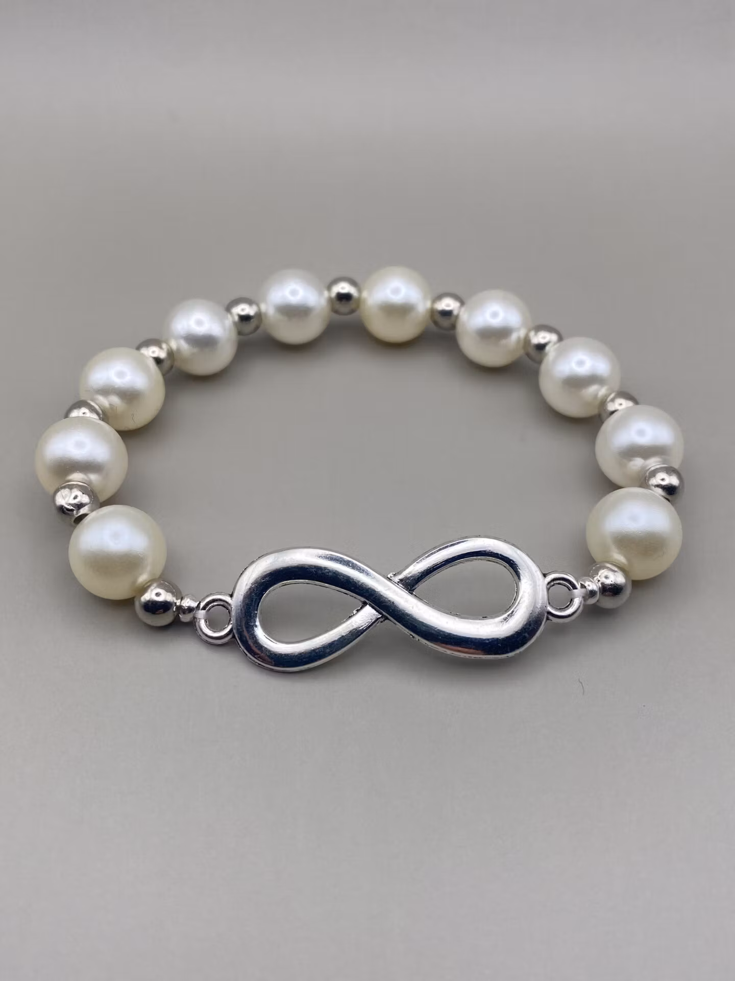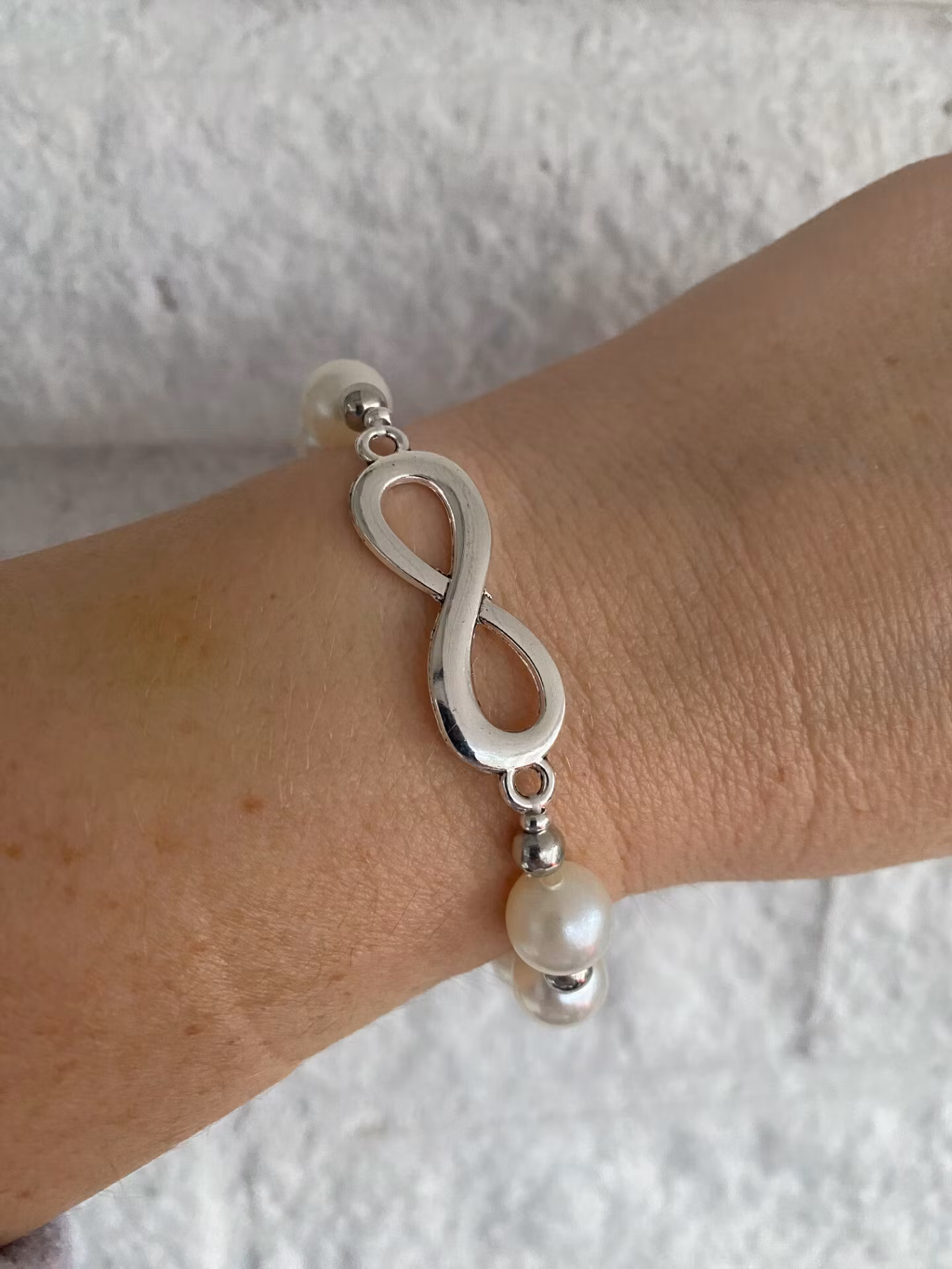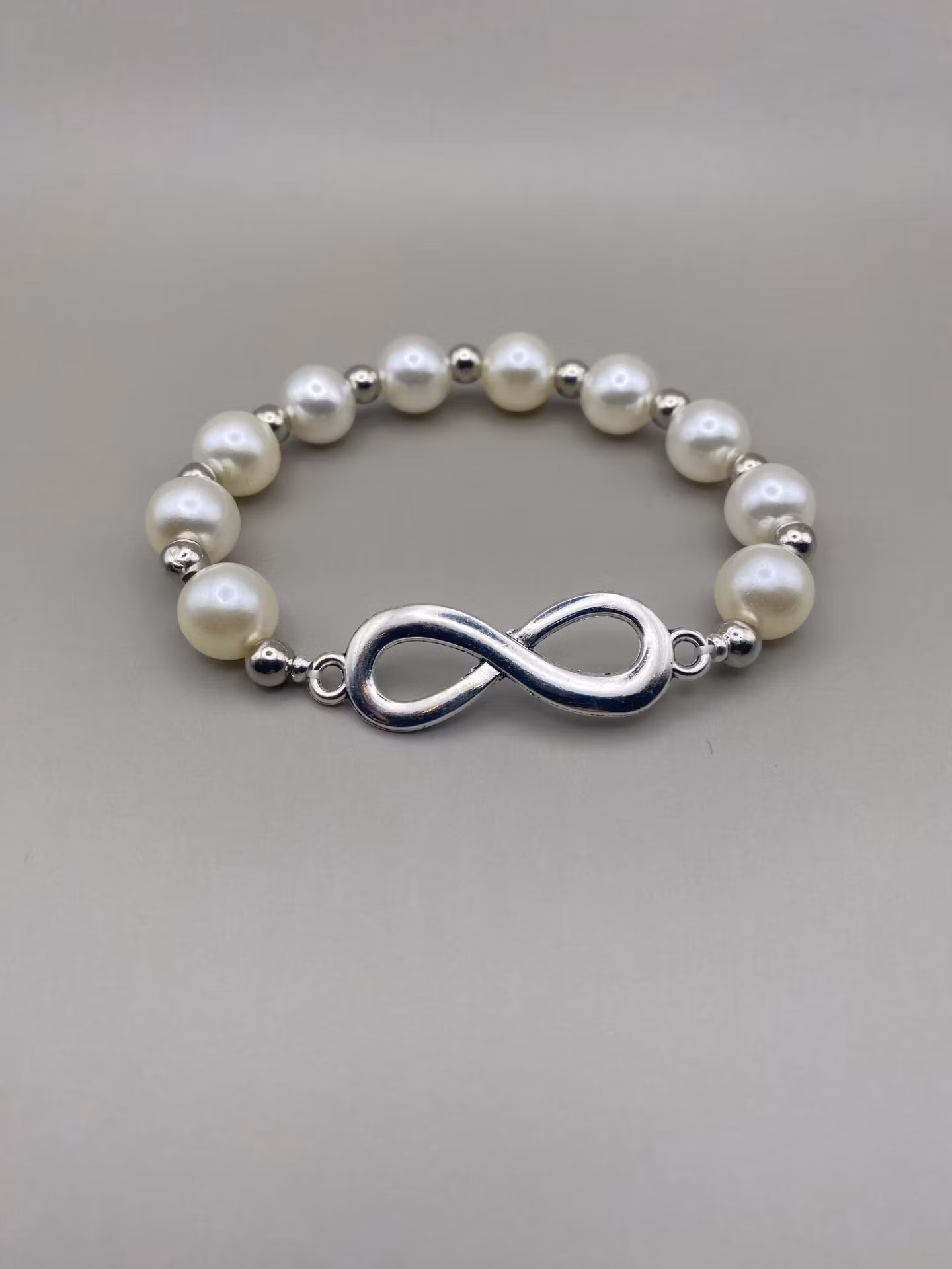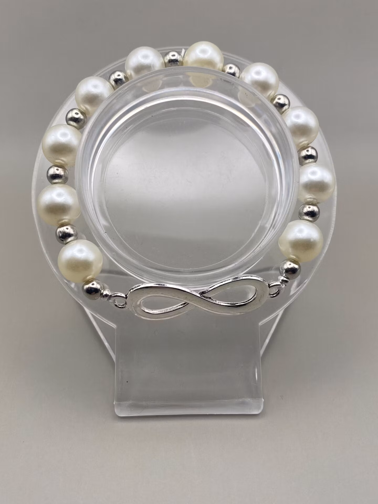 Tjusigt armband i stora benvita högglansiga pärlor varvat med silverfärgade mindre pärlor och dekorativ evighetssymbol i blickfånget