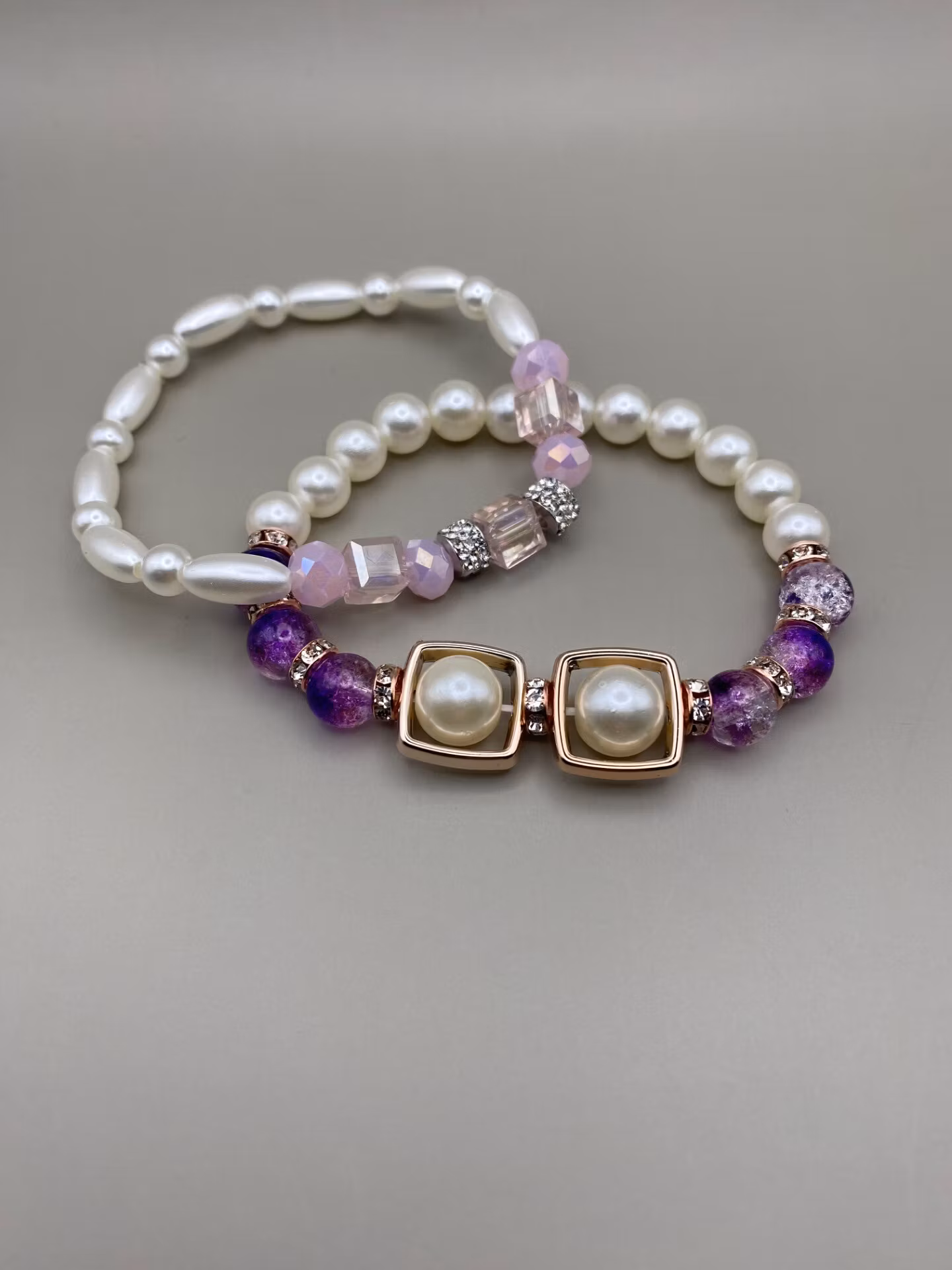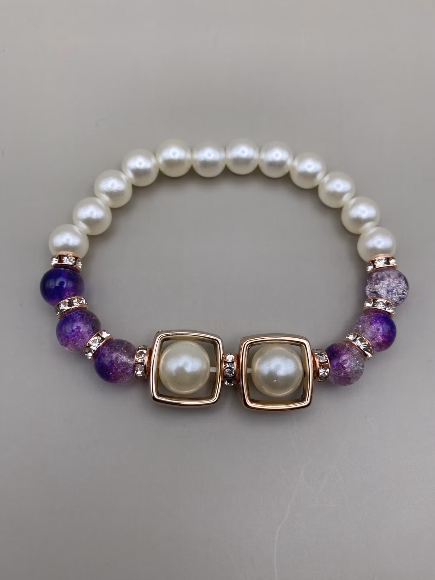 Kul armband i elfenbenvita stora runda pärlor runt om, Lilamellerade glaspärlor varvat med roséfärgad strass, två större benvita pärlor i blickfånget med fint r