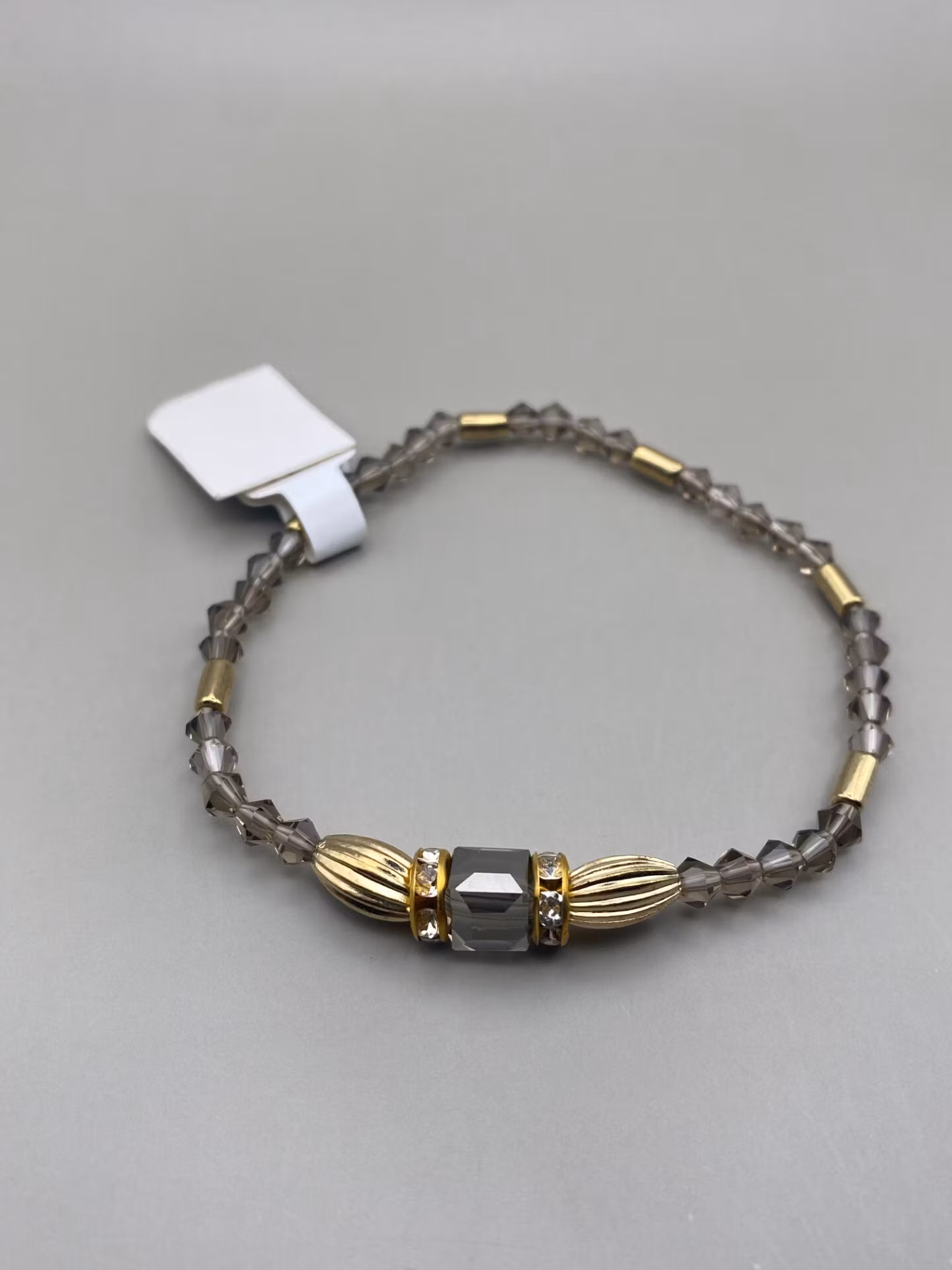Armband av små grå glaspärlor, guldfärgade detaljer och fyrkantig glaspärla i blickfånget, varvat med guldfärgade detaljer och strass