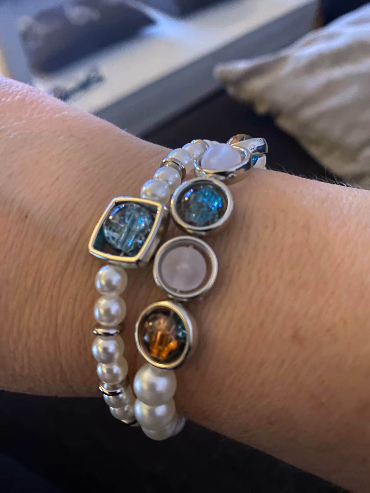 Fint armband i elfenbenvita stora pärlor runt om, i blickfånget finns fem varvat vita frostade glaspärlor och grön-orange mellerade glaspärlor med runt silverfärgat hölje. Väldigt fin detalj.