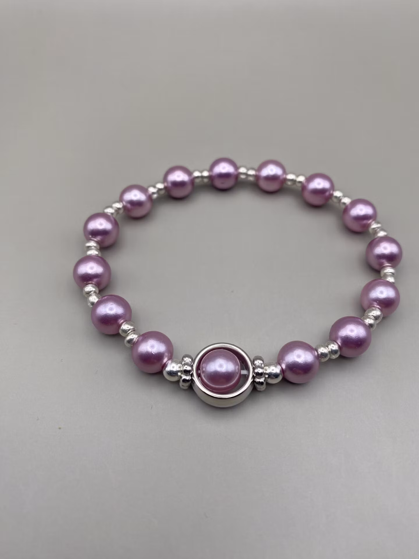 Fint armband i högblanka ljuslila pärlor varvat med små silverfärgade pärlor, och silverfärgat hölje kring centrerad pärla i blickfånget.