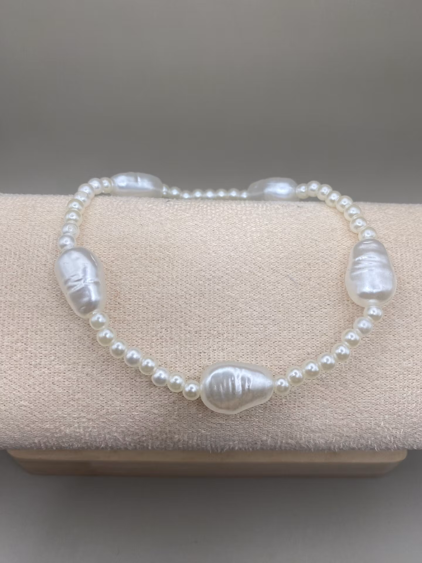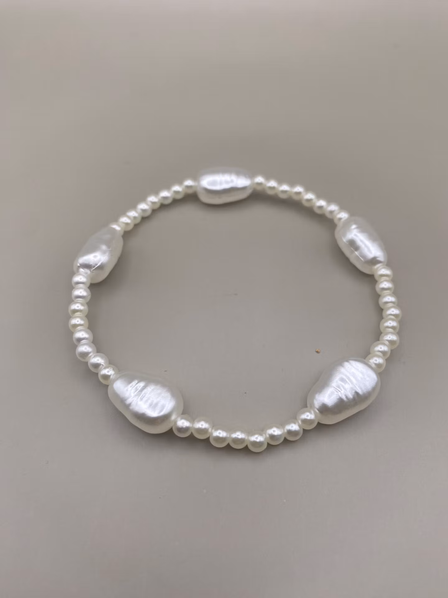 Elegant armband i högblanka benvita större oregelbundna pärlor varvat med små benvita pärlor.