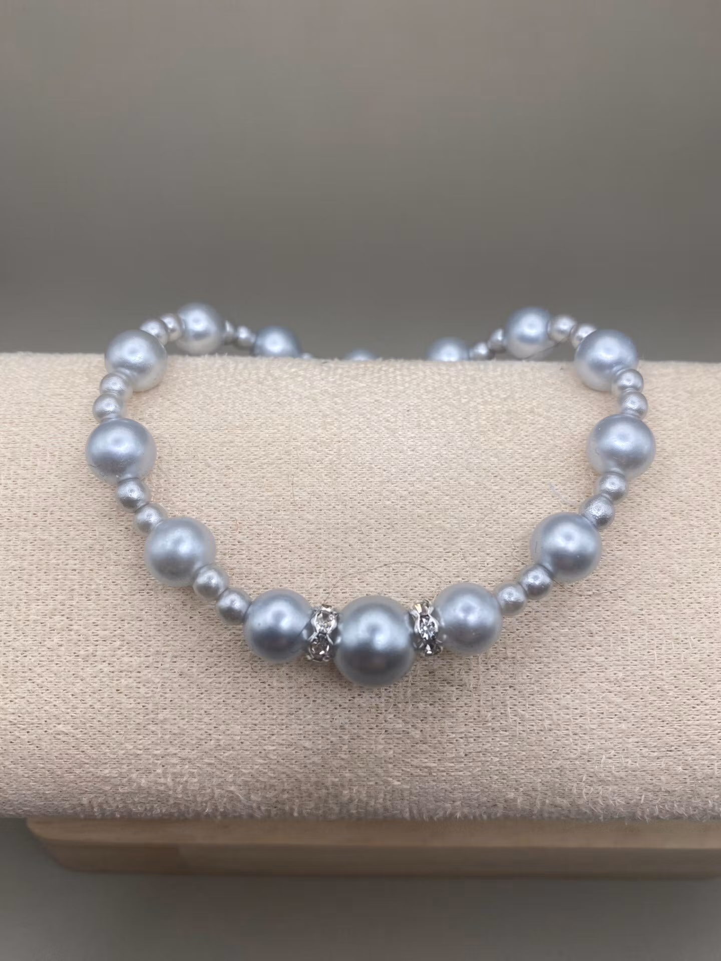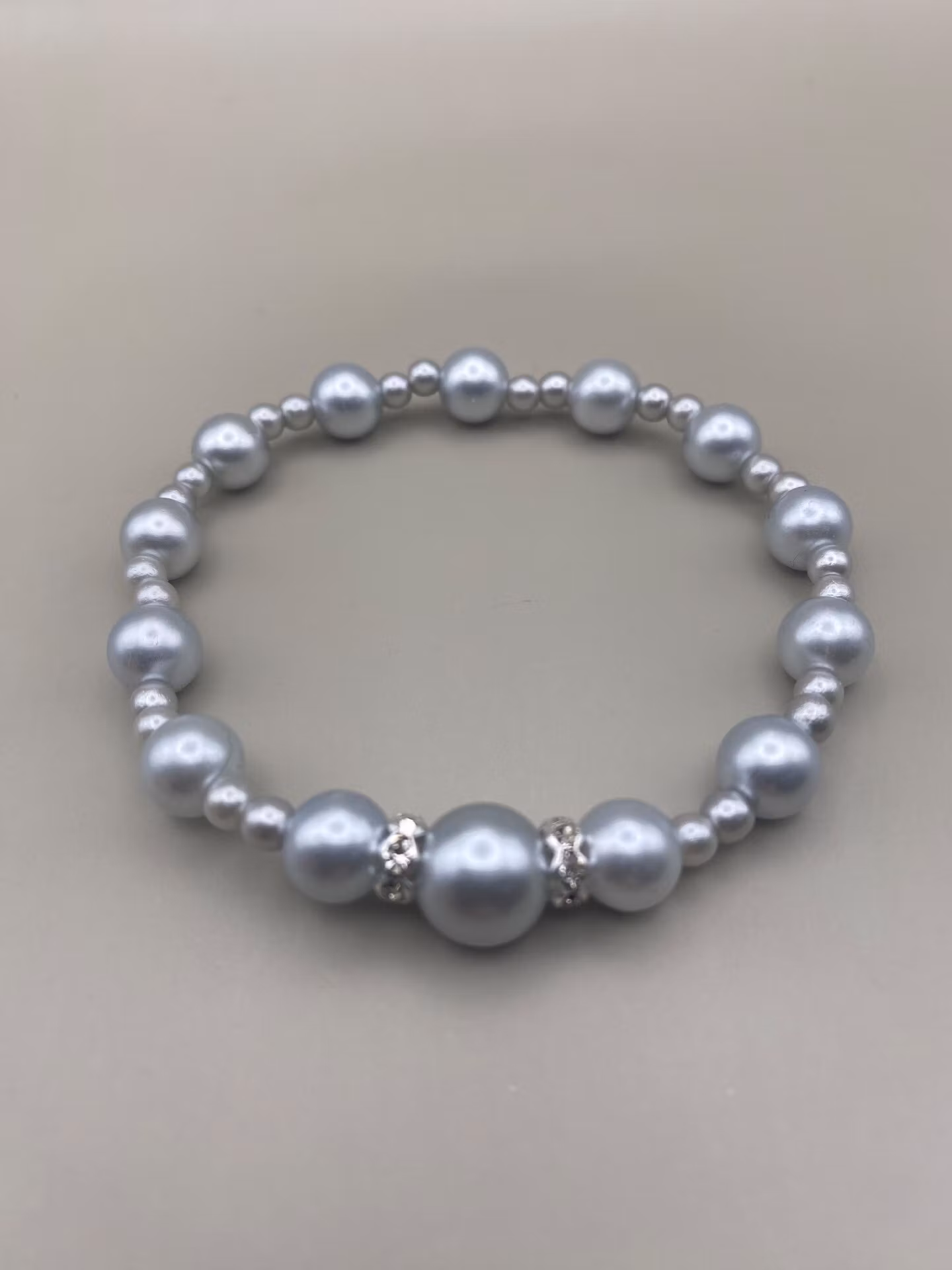Elegant armband i högblanka ljust silverfärgade stora pärlor varvat med små silverfärgade pärlor, större pärla och strass i blickfånget.