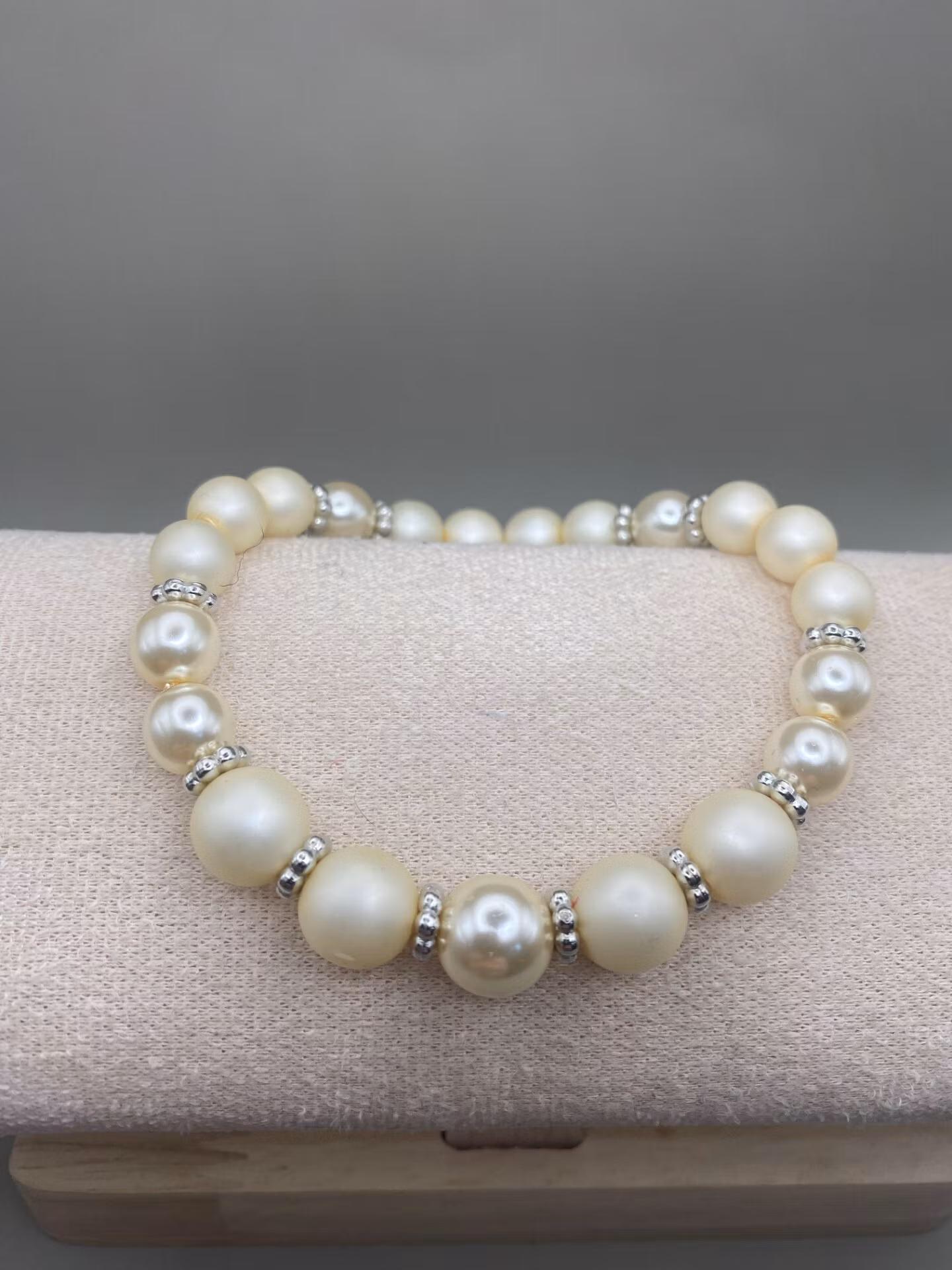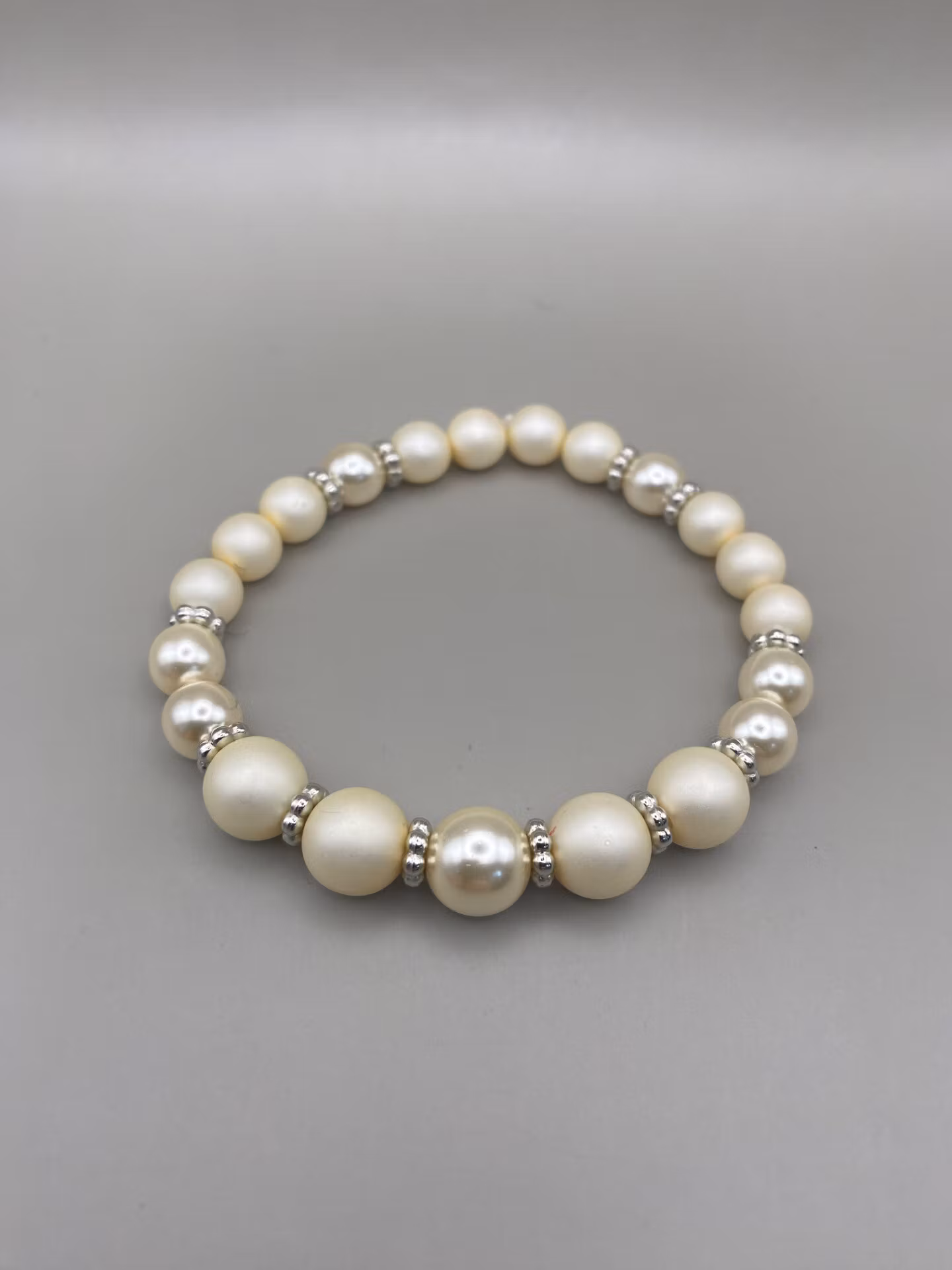 Elegant armband i blandat högblanka och matta beiga pärlor, större i blickfånget och något mindre runt om varvat med silverfärgade distanser..