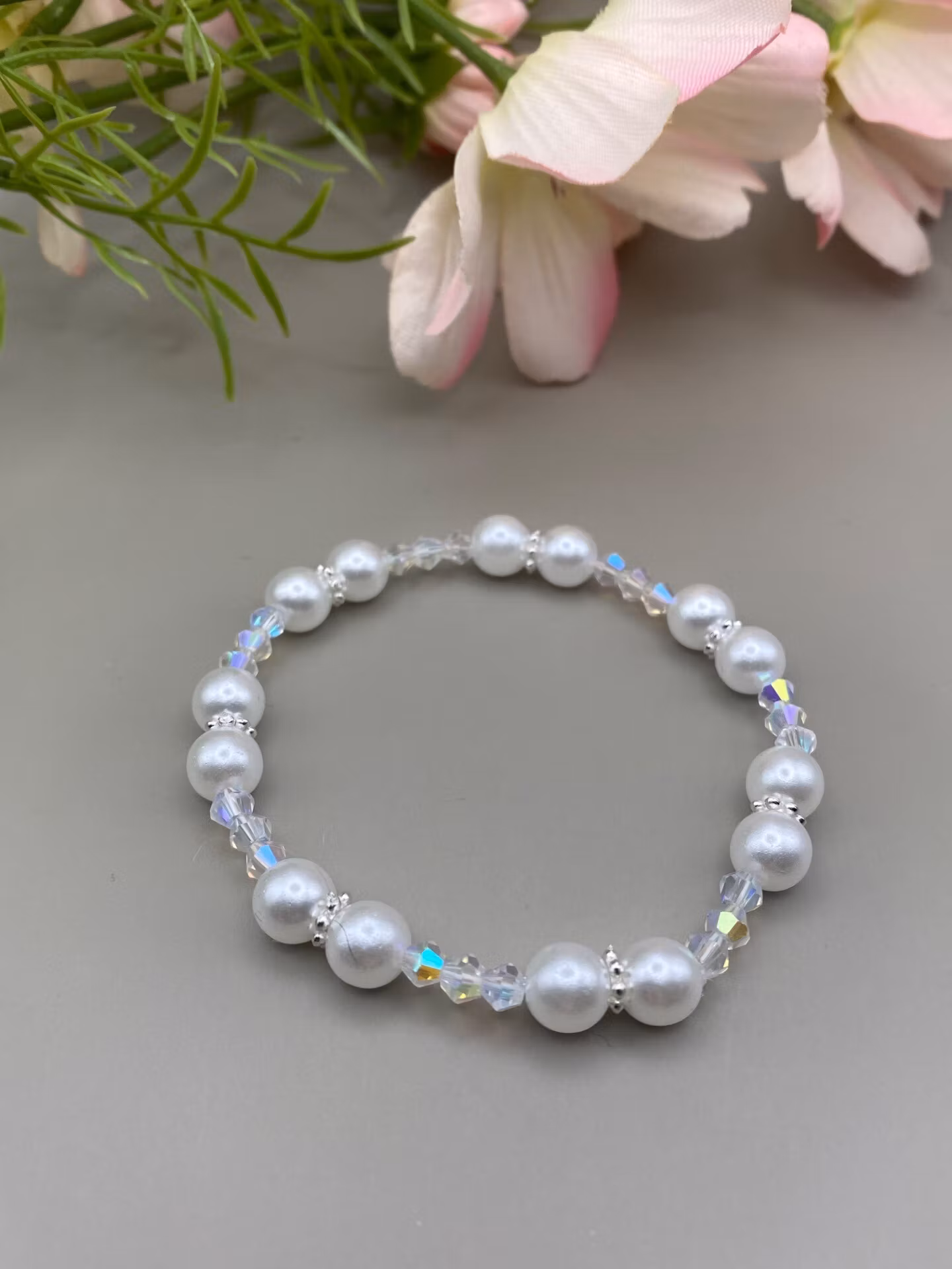 Elegant armband i högblanka kritvita pärlor och små facetterade hologramiska pärlor i fint varvat mönster, samt silverfärgade distanser.