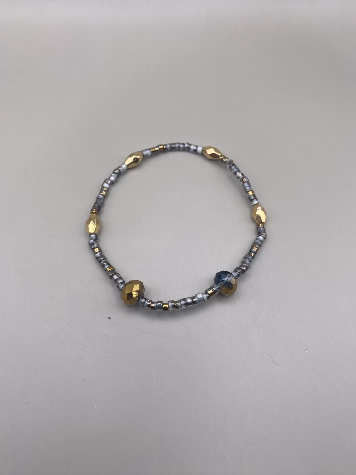 Elegant, diskret men tufft armband i små små gråmellerade glaspärlor i fint varvat mönster med guldmellerade stora glaskristallpärlor och guldfärgade avlånga kantiga pärlor.