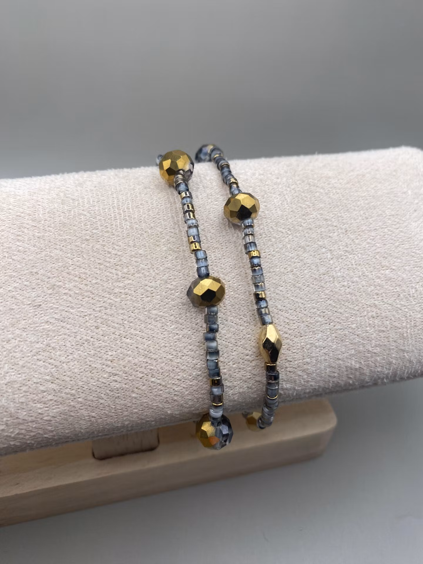 Elegant, diskret men tufft armband i små små gråmellerade glaspärlor i fint varvat mönster med guldmellerade stora glaskristallpärlor och guldfärgade avlånga ka