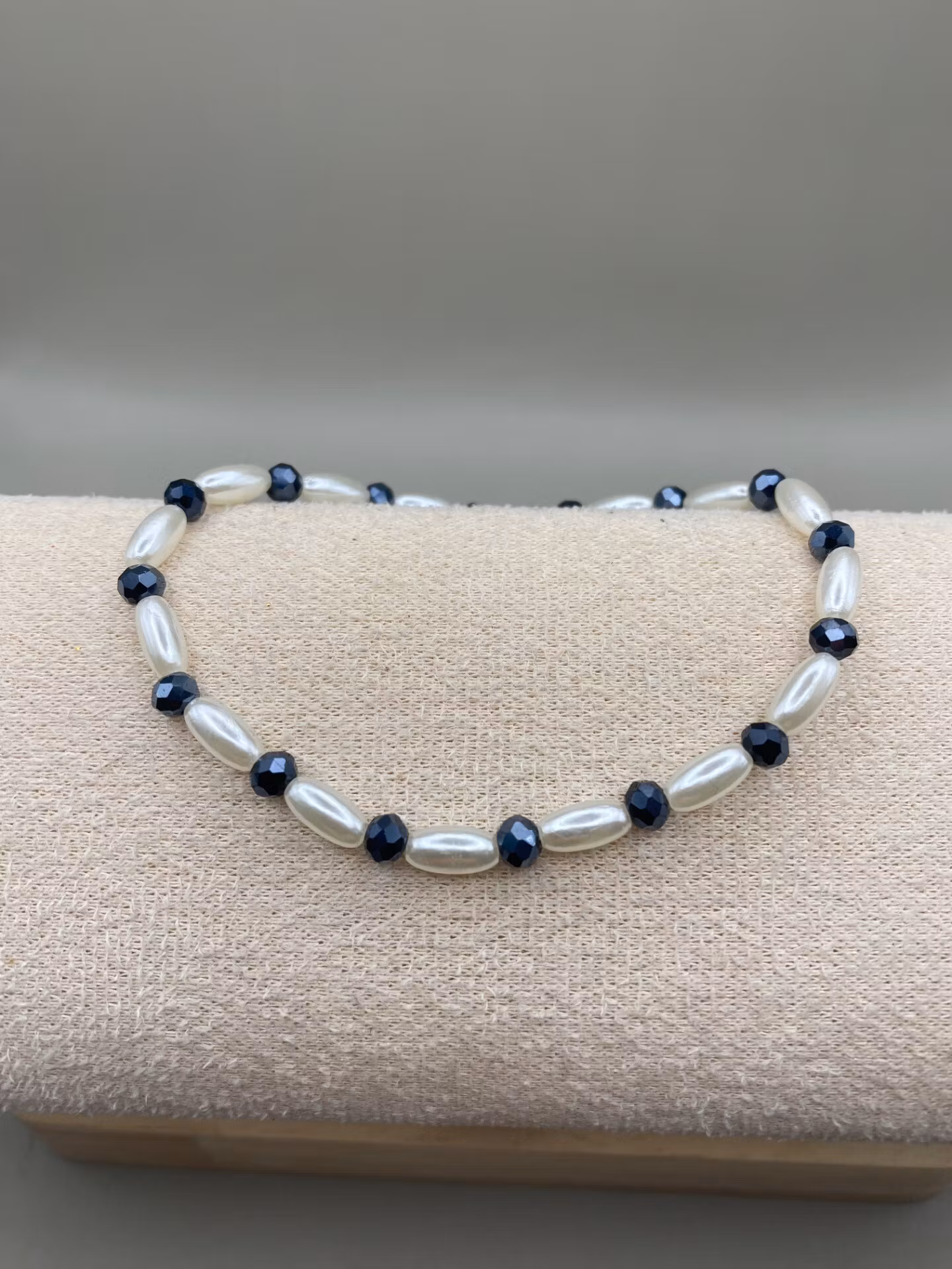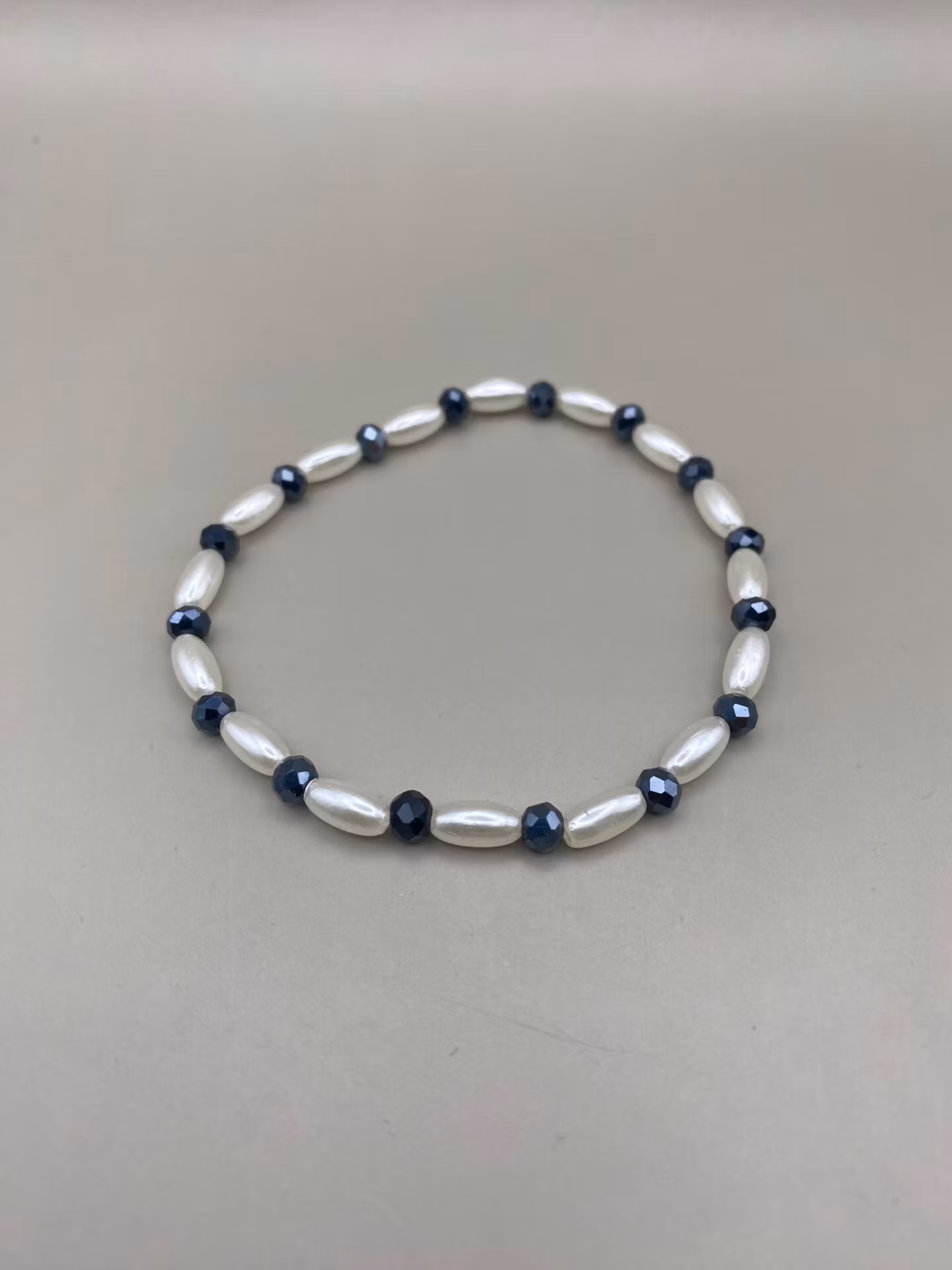 Ett elegant och diskret armband med benvita avlånga fauxpärlor varvat med små midnattsblå glaskristallpärlor.