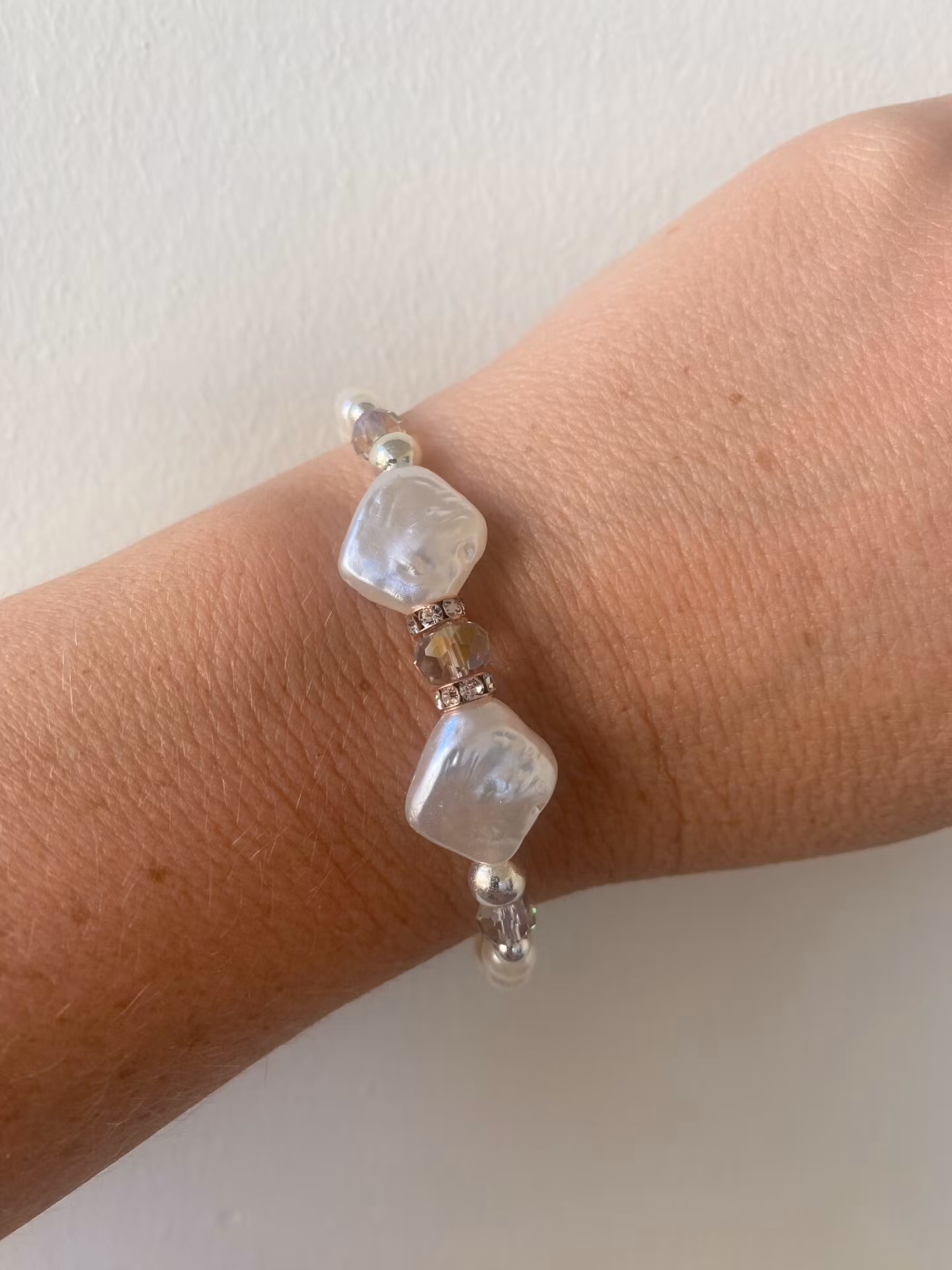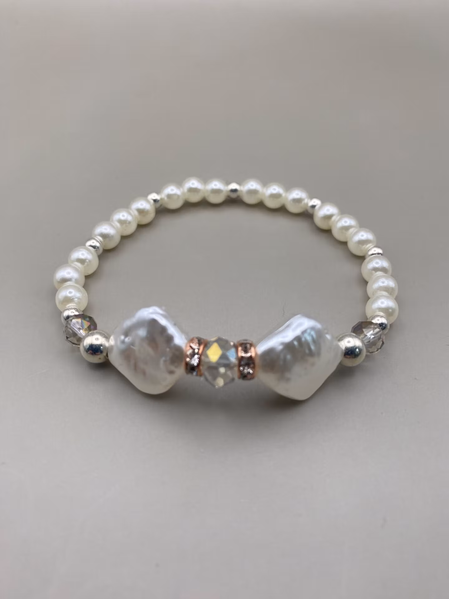 Ett elegant armband med benvita fauxpärlor varvat i fint mönster med små silverfärgade pärlor runt om och där benvita oregelbundna pärlor med roséfärgadstrass och beiga glaskristallpärlor står i fokus och blickfånge.