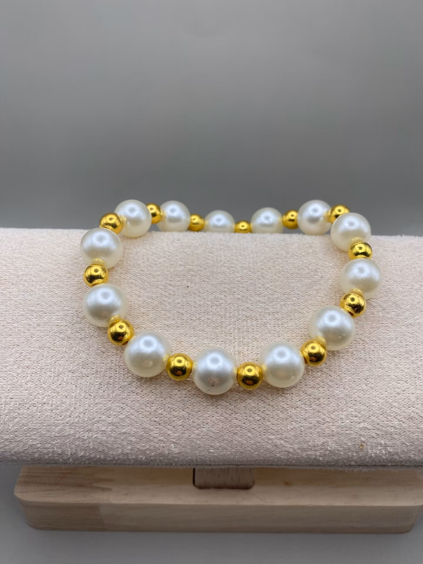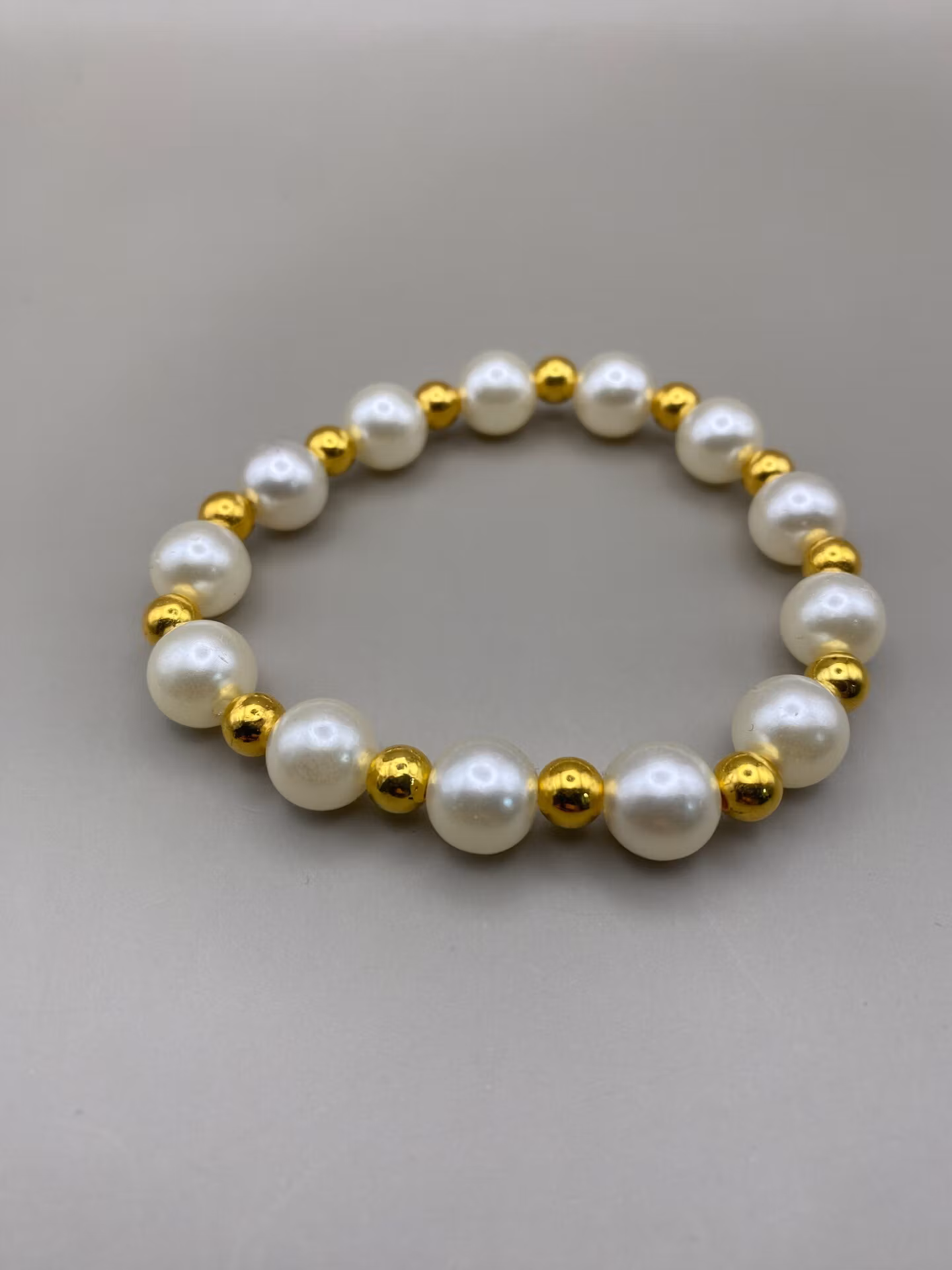 Ett elegant armband med stora elfenbenvita fauxpärlor varvat med guldfärgade pärlor. Stilrent.