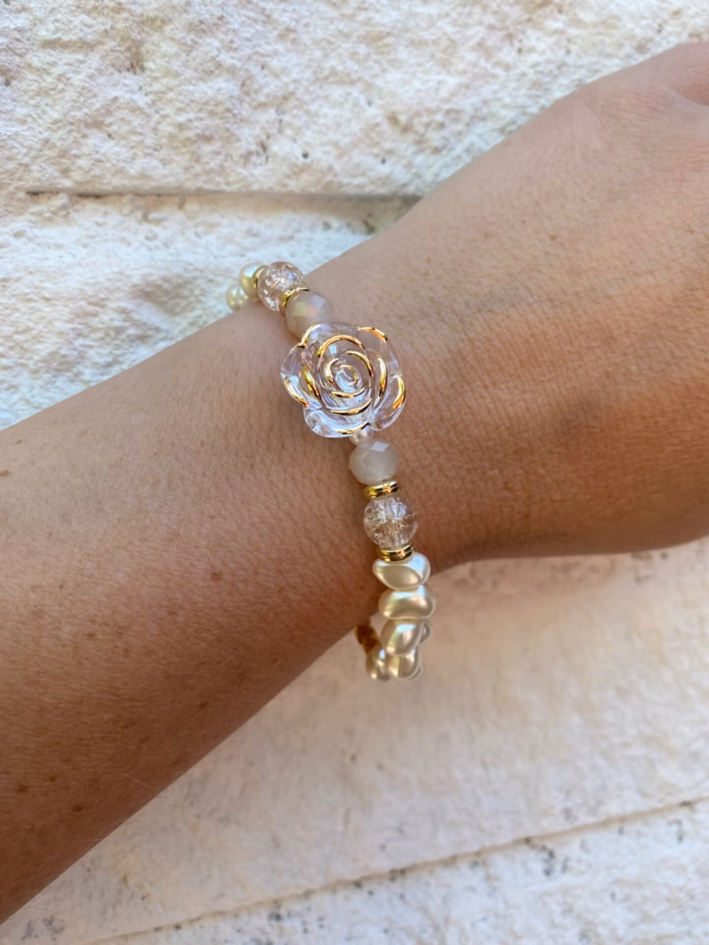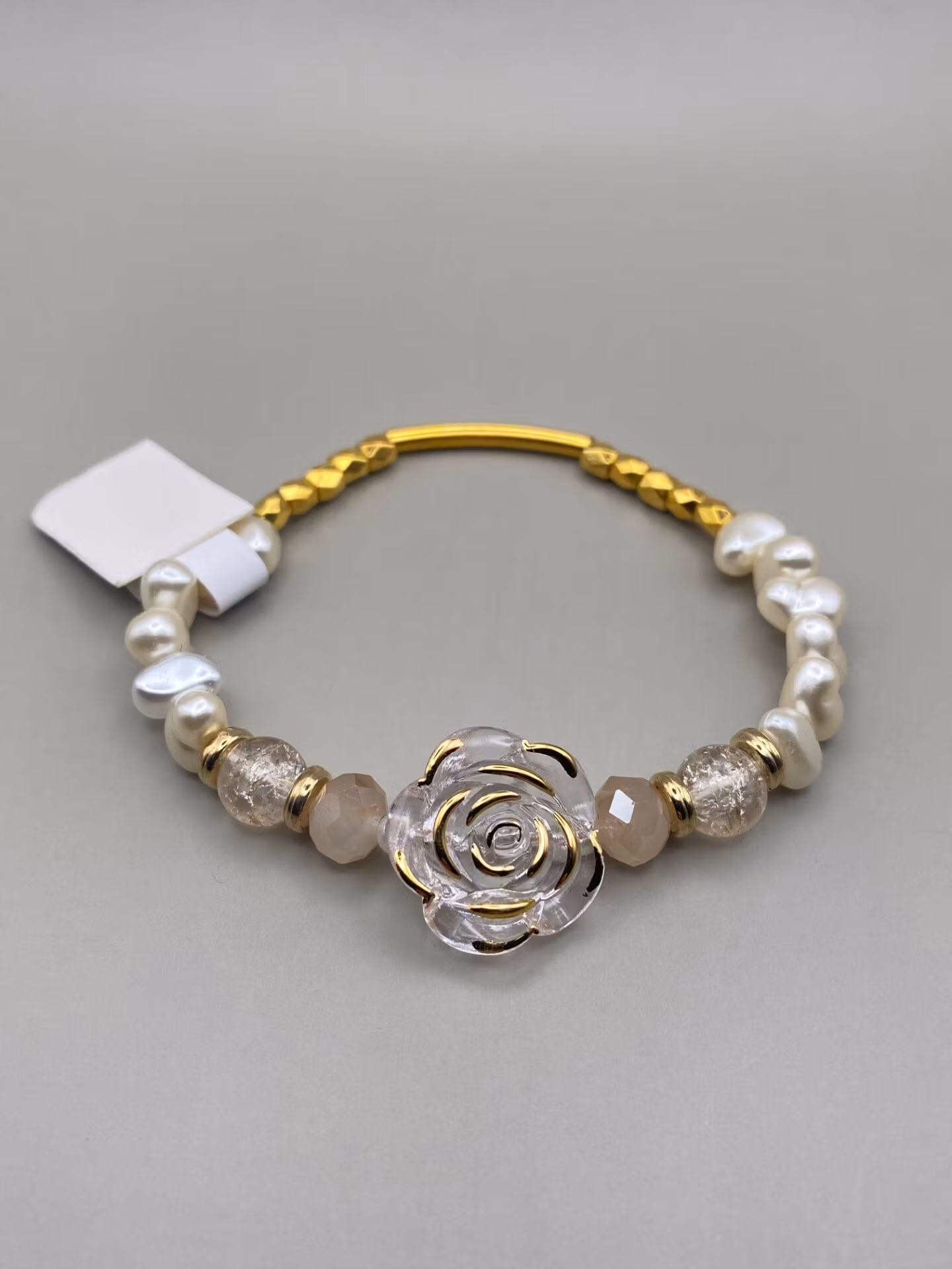 Armband med benvita vaxade ojämna pärlor, fin ros i blickfånget, guldfärgade detaljer