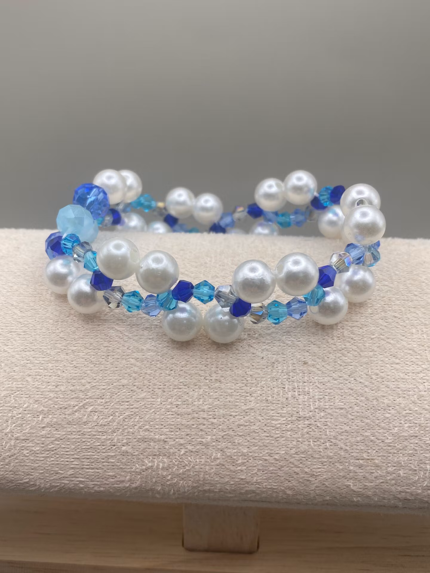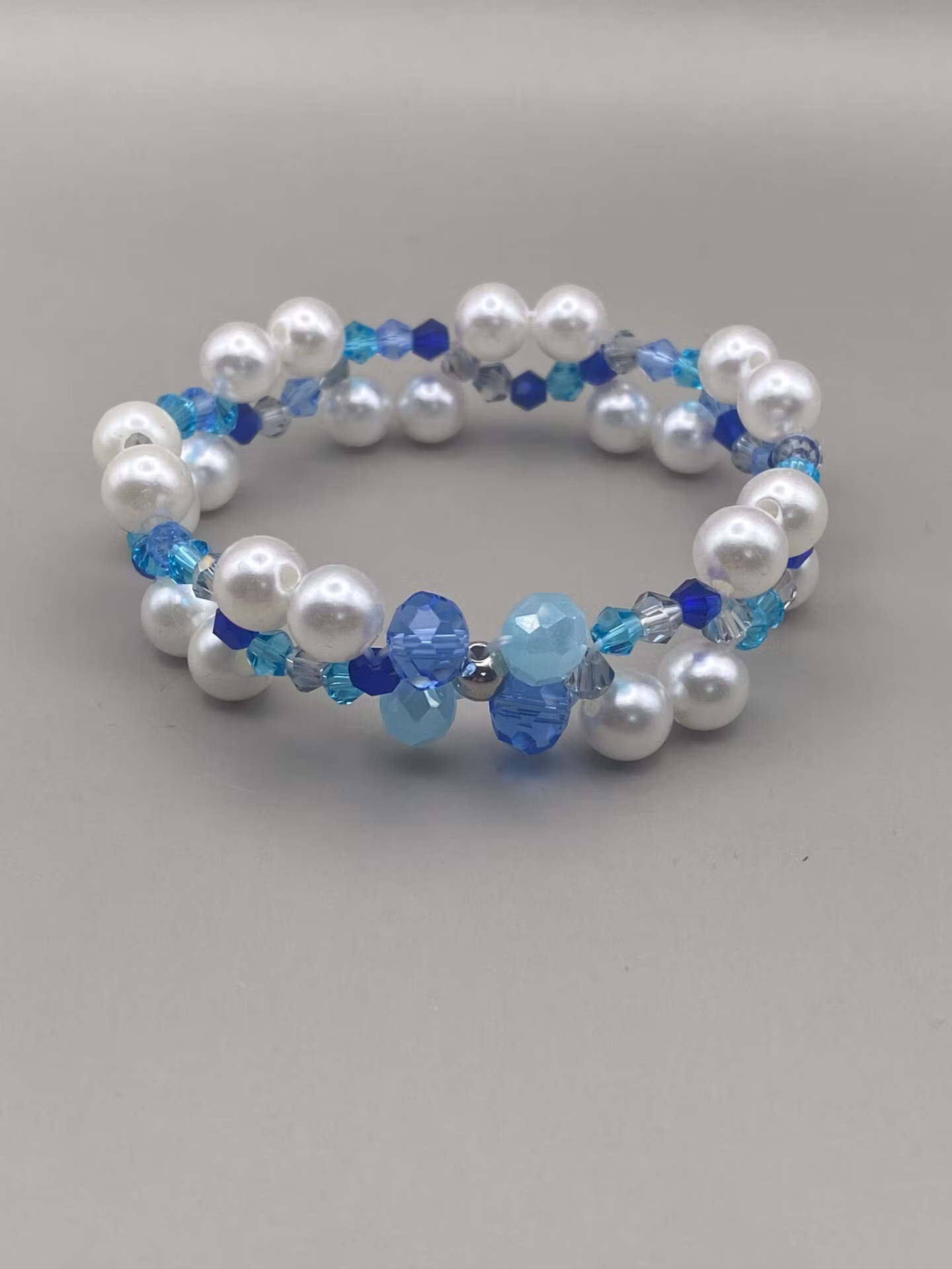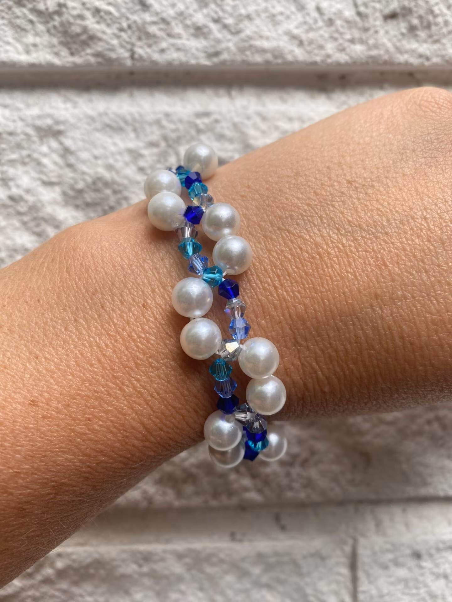 Vackert treradigt armband i varvat vackert mönster av kritvita högblanka pärlor och små blandat blå toner av glaspärlor i vackert mönster.