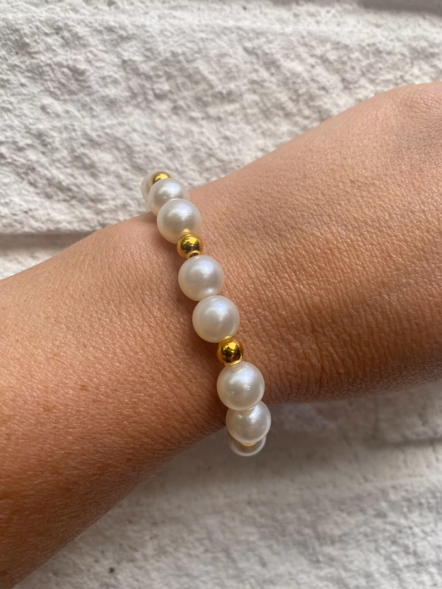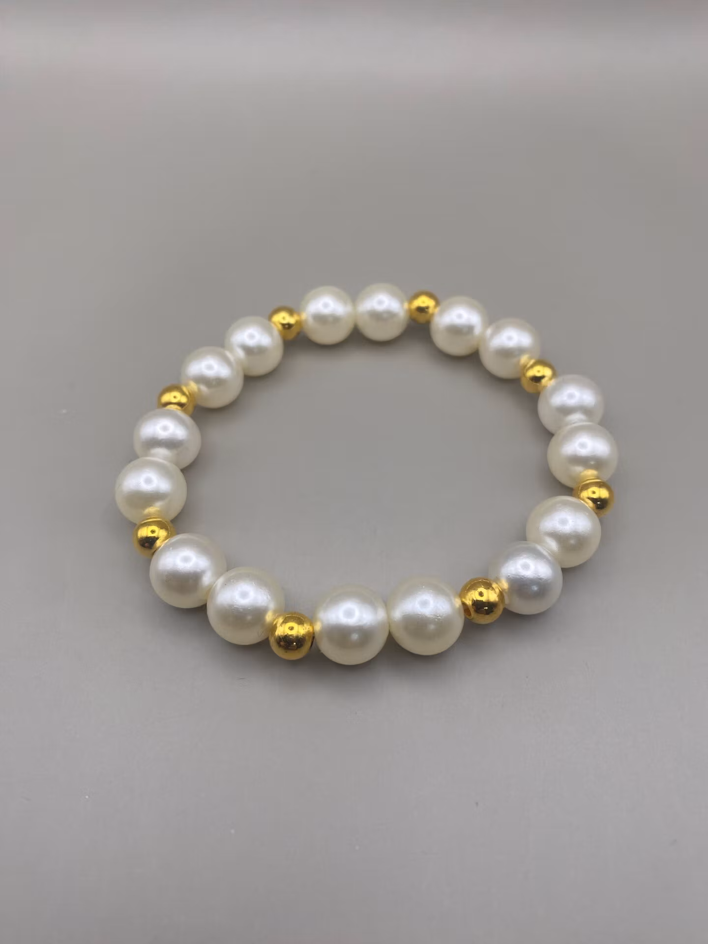 Elegant armband i varvat mönster av stora benvita högblanka pärlor och mellanstora guldfärgade pärlor. Vackra att kombinera två likadana armband för lite bredar