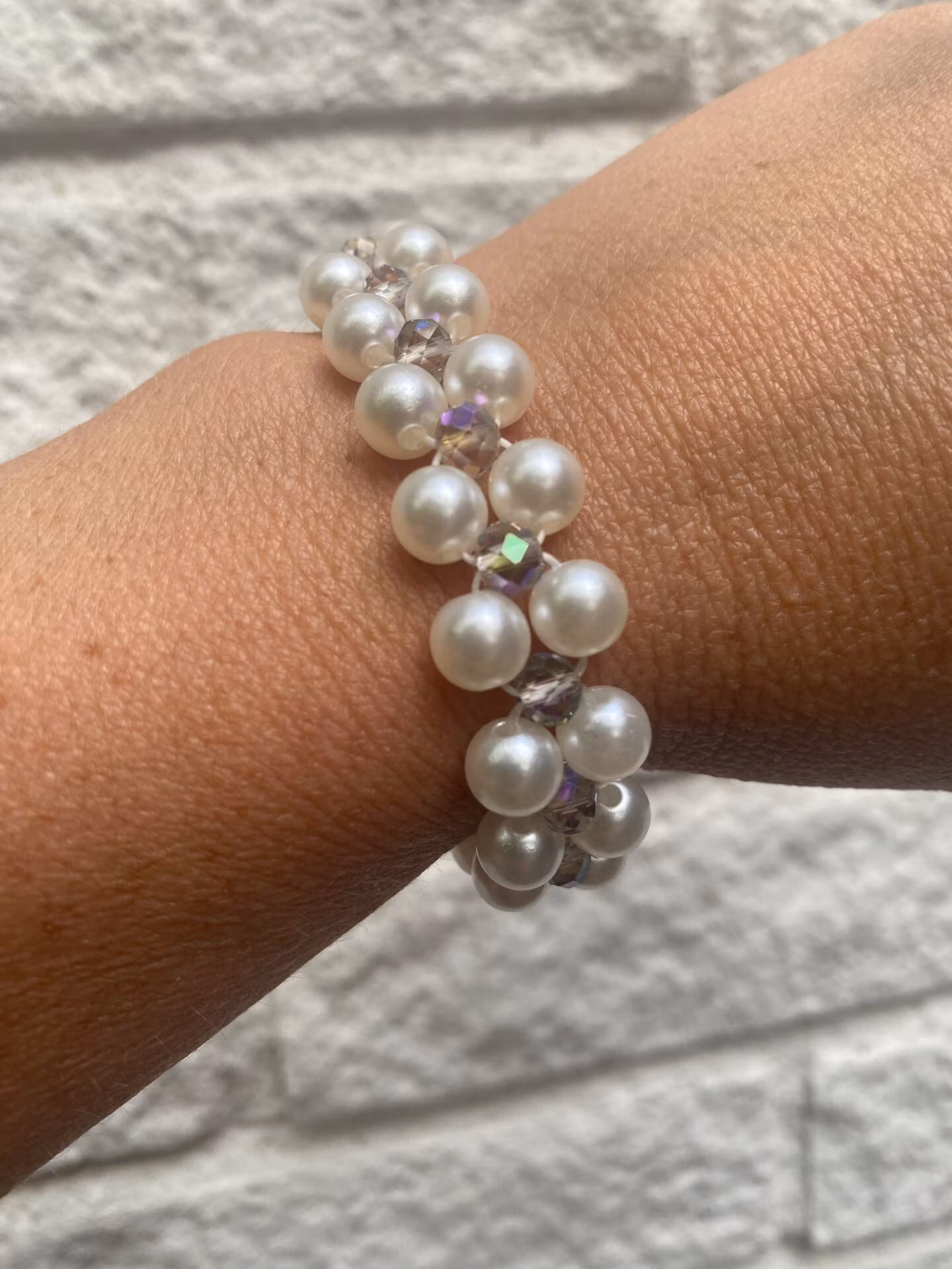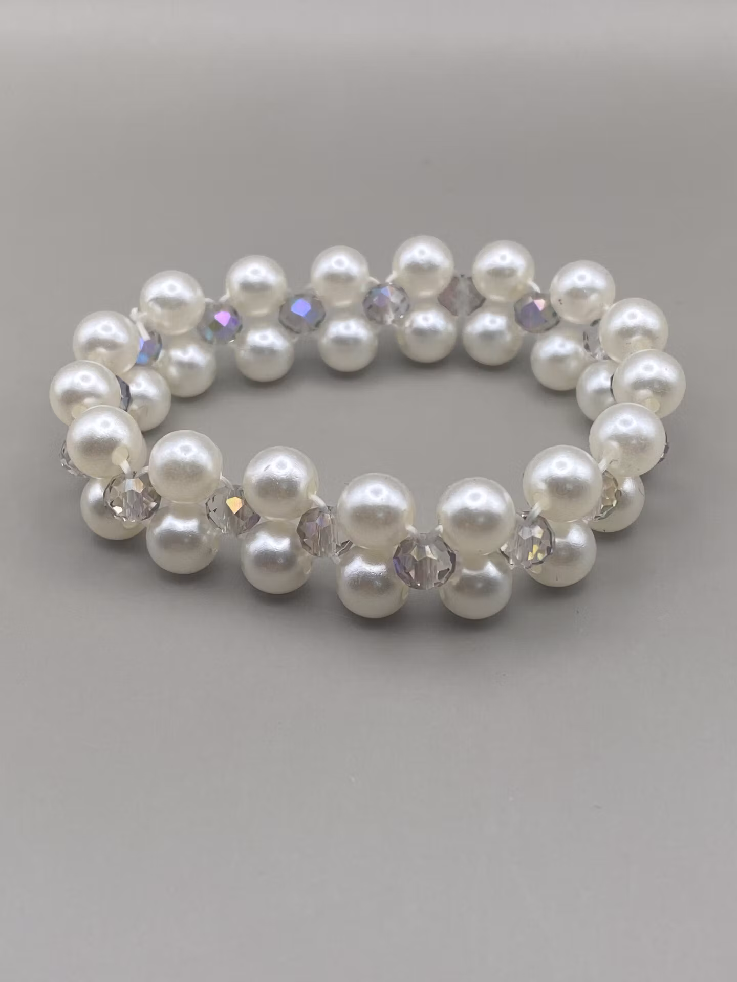 Vackert treradigt armband i varvat lekfullt mönster av kritvita högblanka pärlor och mellanstora svagt lilamellerande skimrande facetterade glaskristallpärlor.
