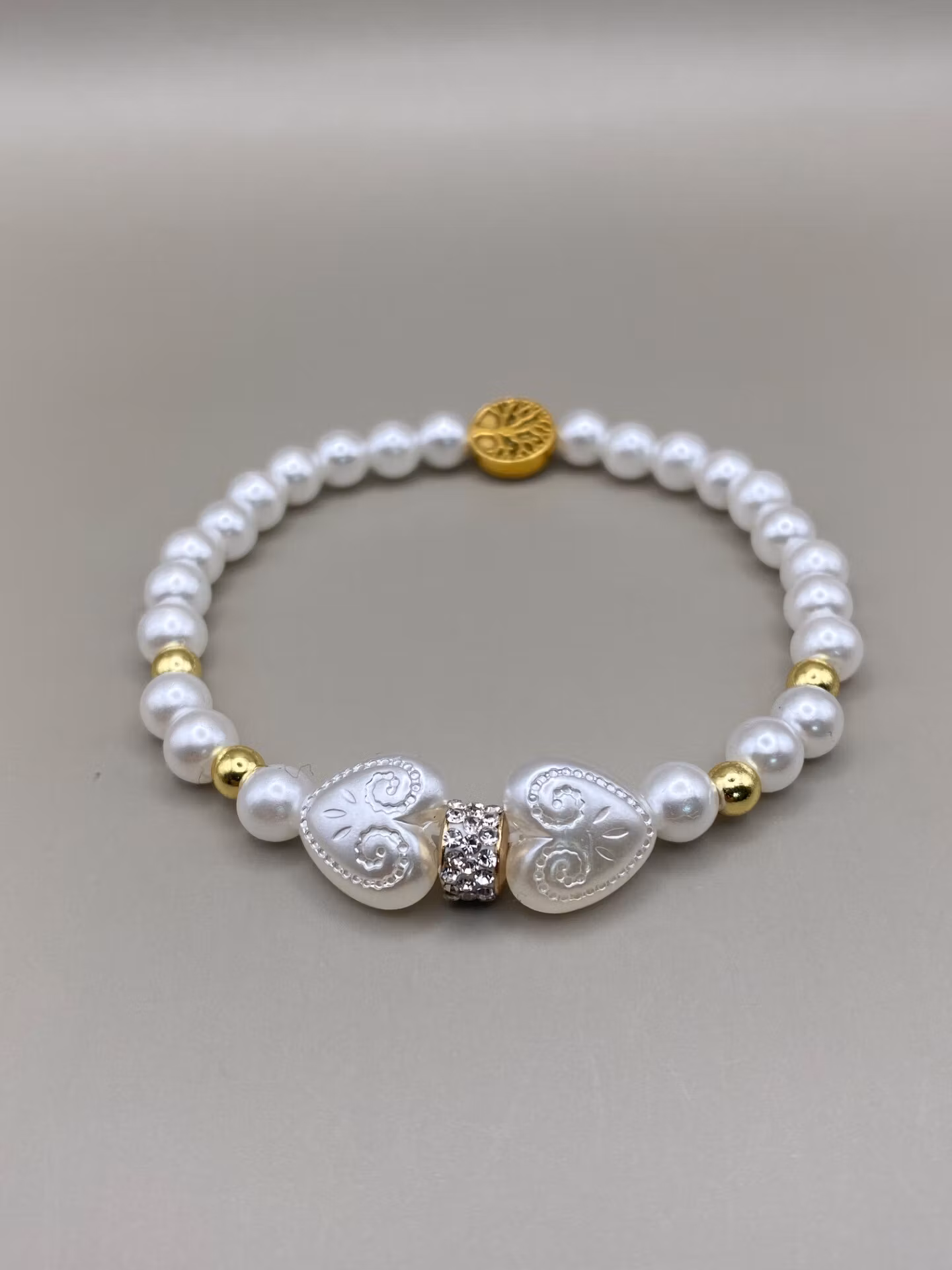 Sött armband med två vita hjärtan och strass i blickfånget, högblanka kritvita pärlor runt om med små guldfärgade distanser och vacker guldfärgad avslutspärla med livet träd.