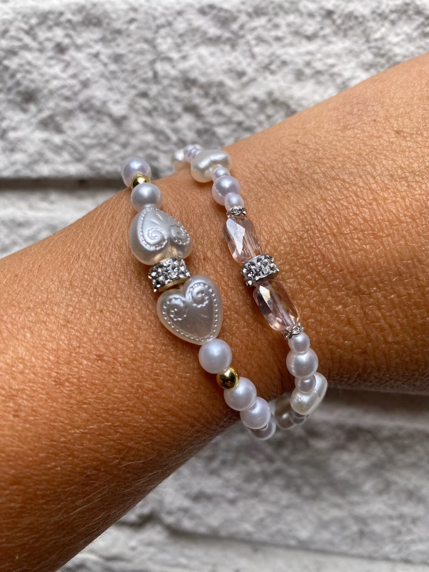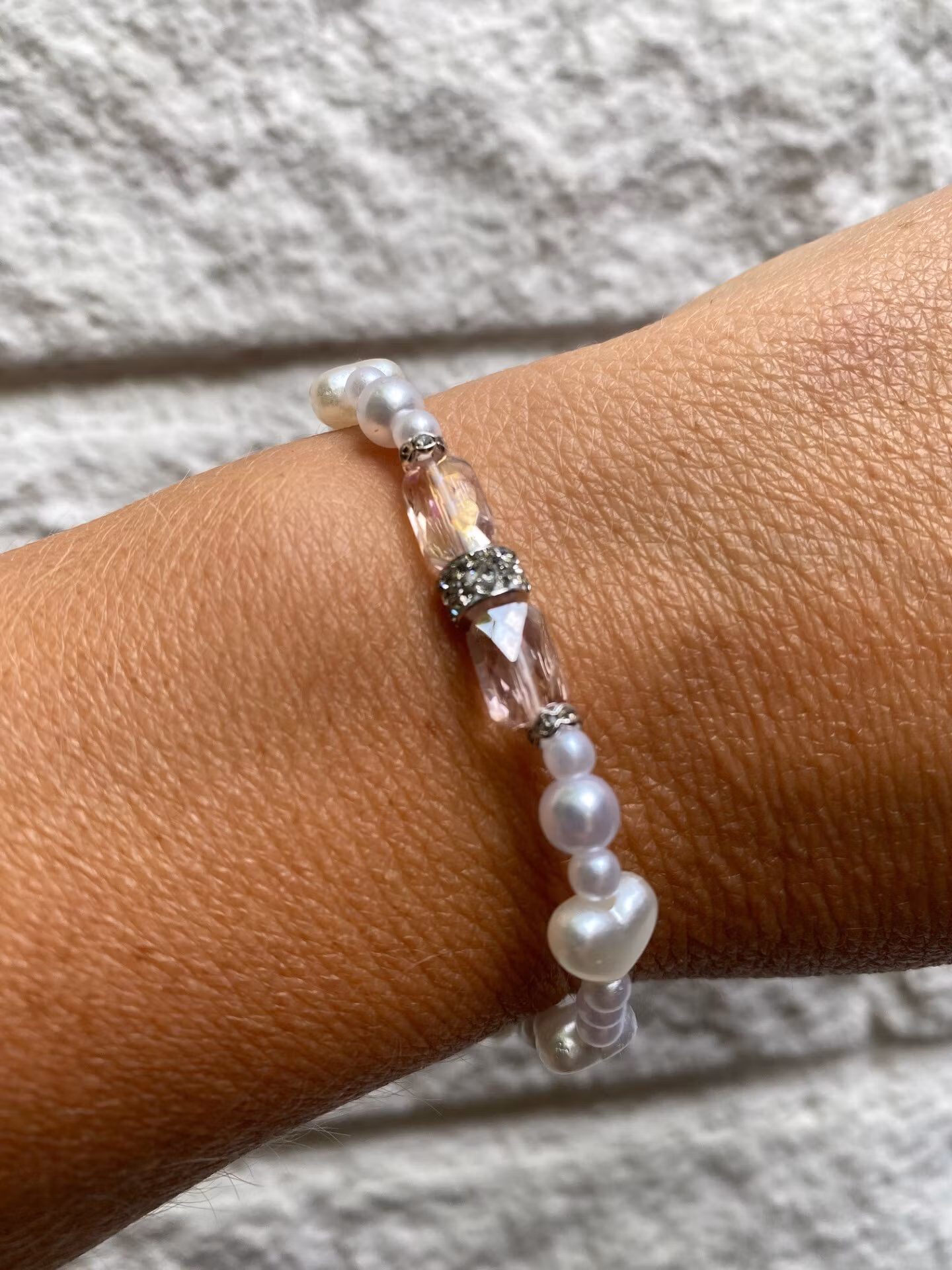 Sött armband med två ljusrosa avlånga facetterade glaspärlor och strass i blickfånget, högblanka kritvita pärlor runt om varvat med vita små hjärtan.