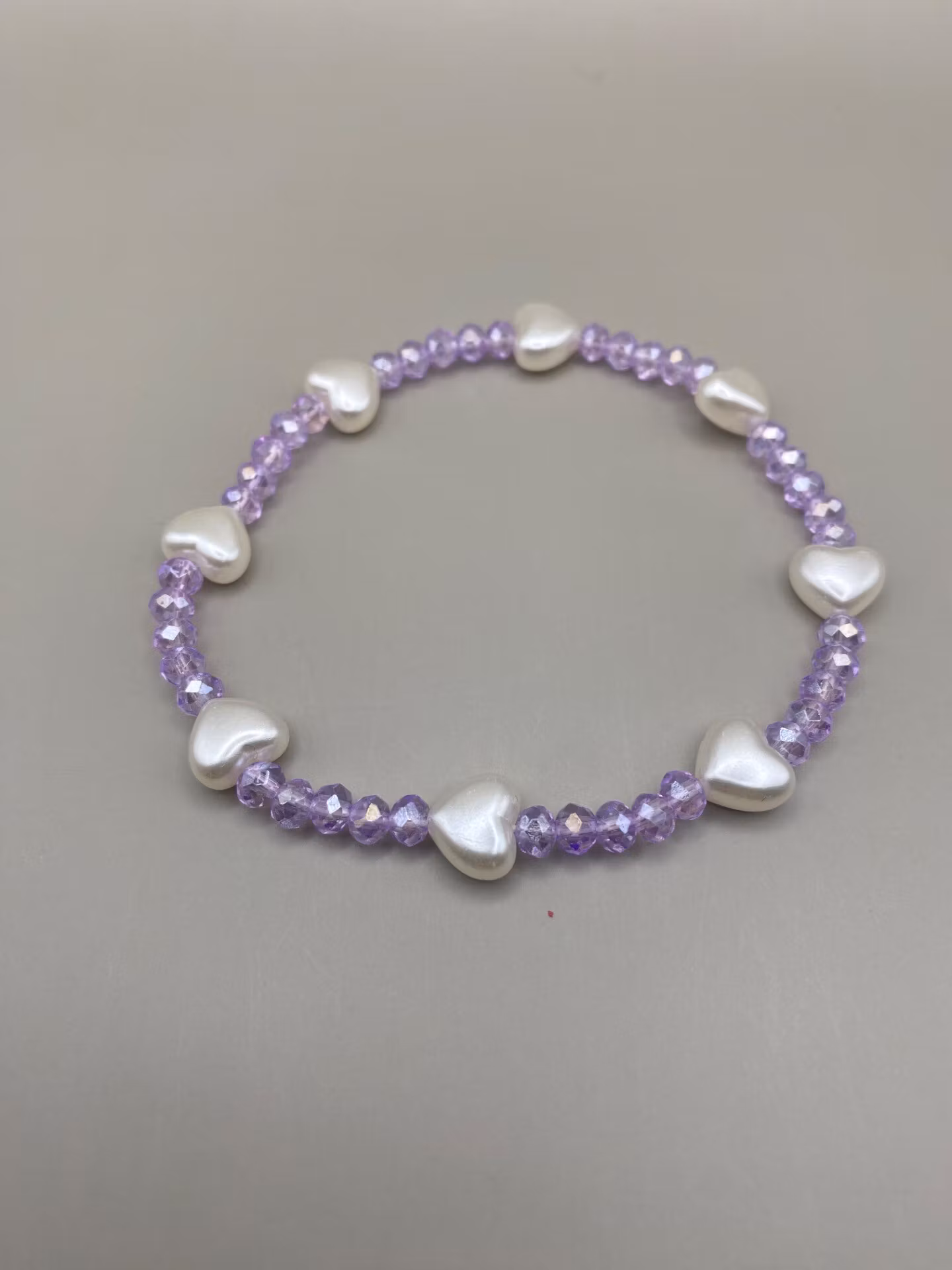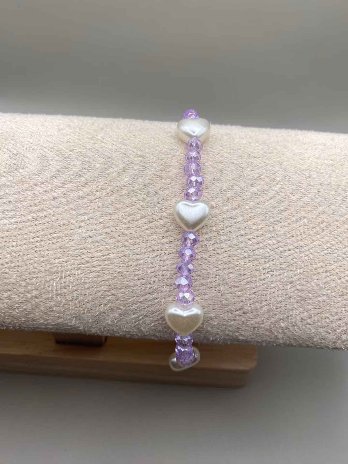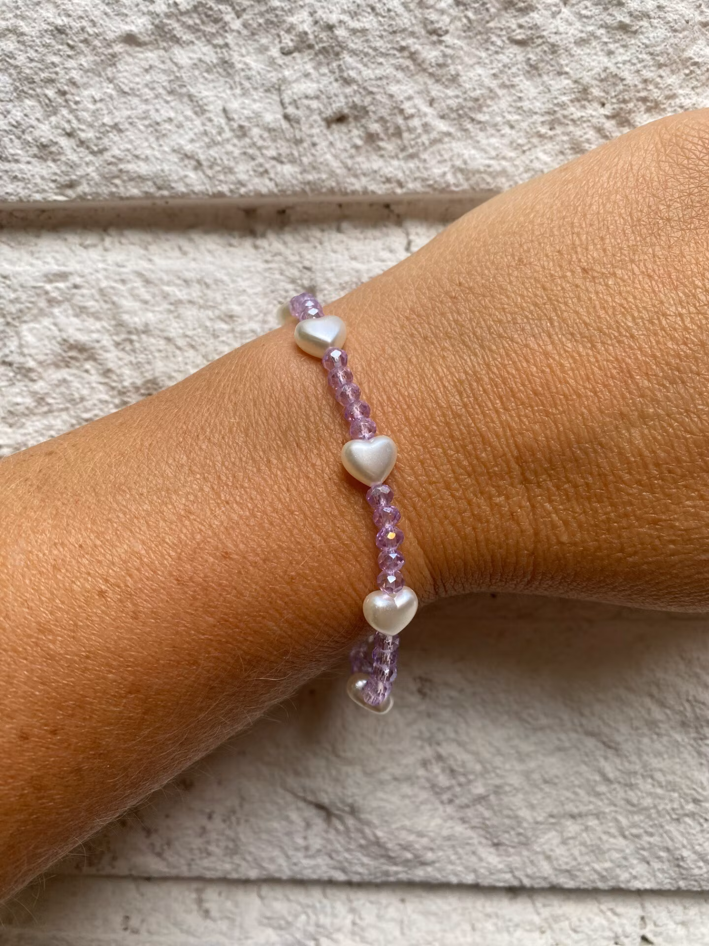 Sött ljuslila armband med facetterade glaspärlor och vita små blanka hjärtan.