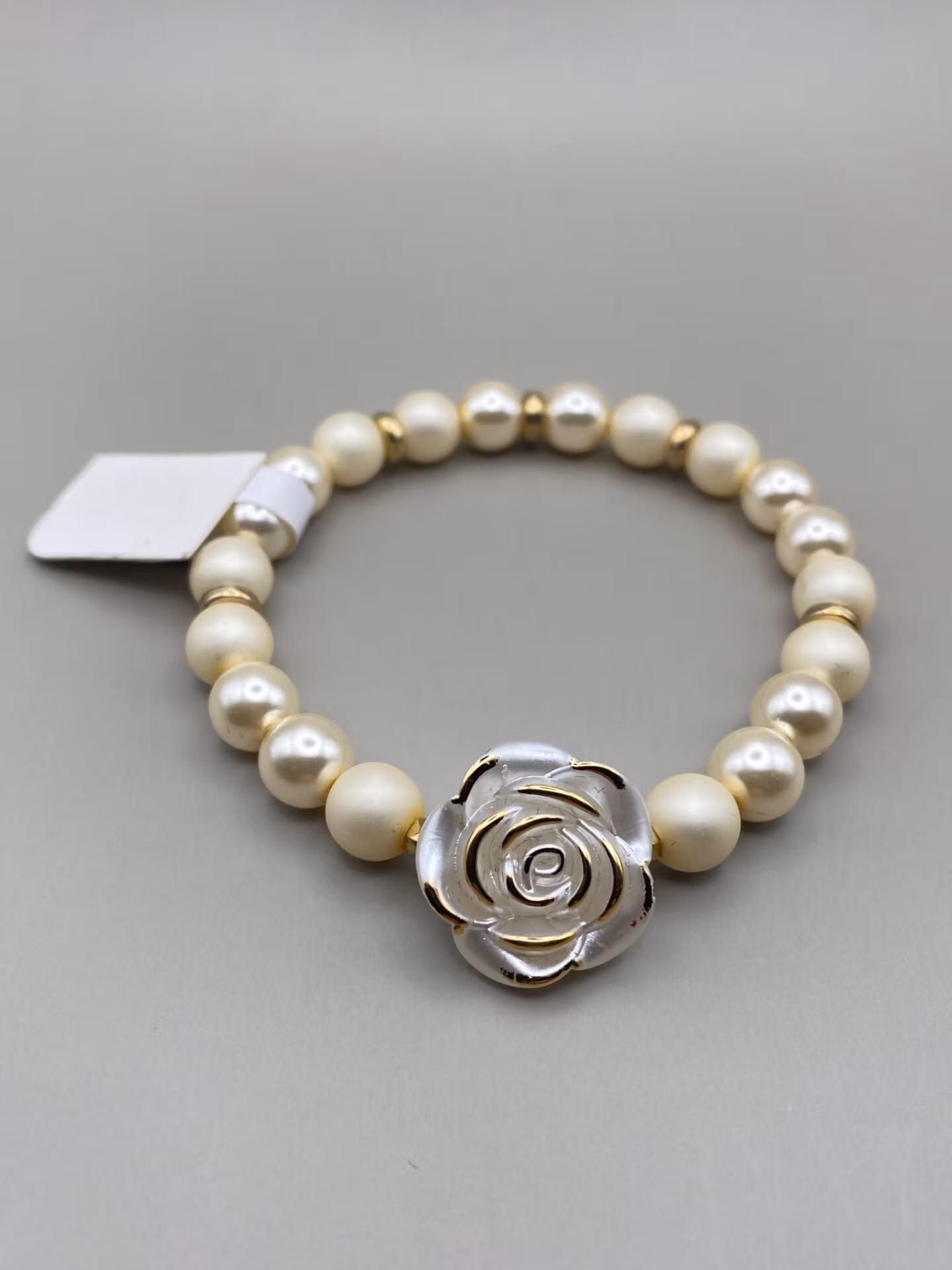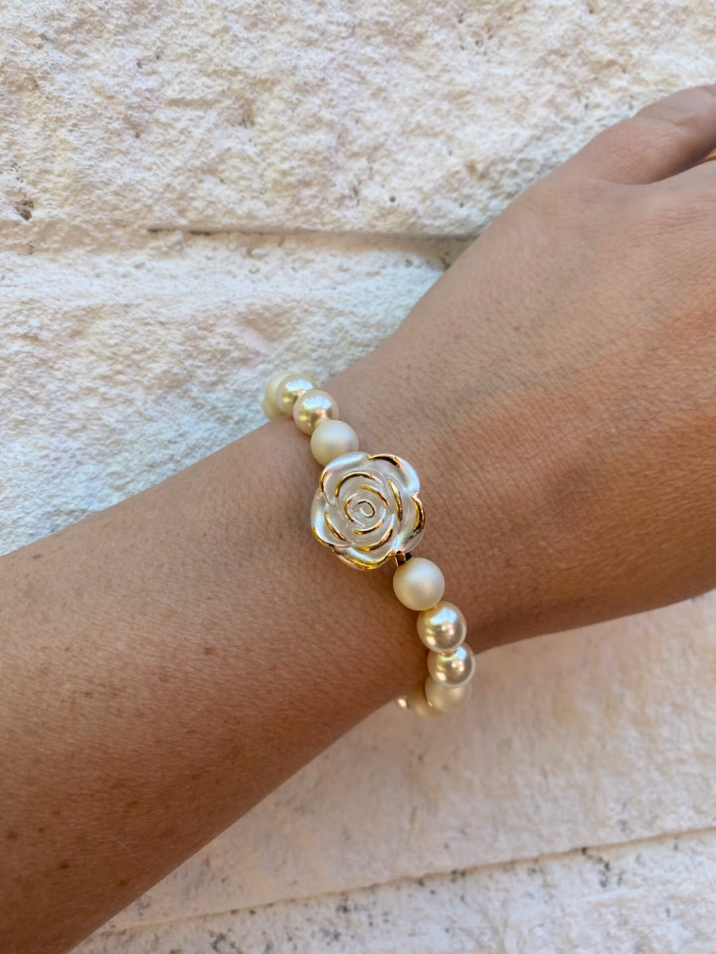 Armband varvat av beiga blanka och matta pärlor, guldfärgade detaljer och stor ros i blickfånget