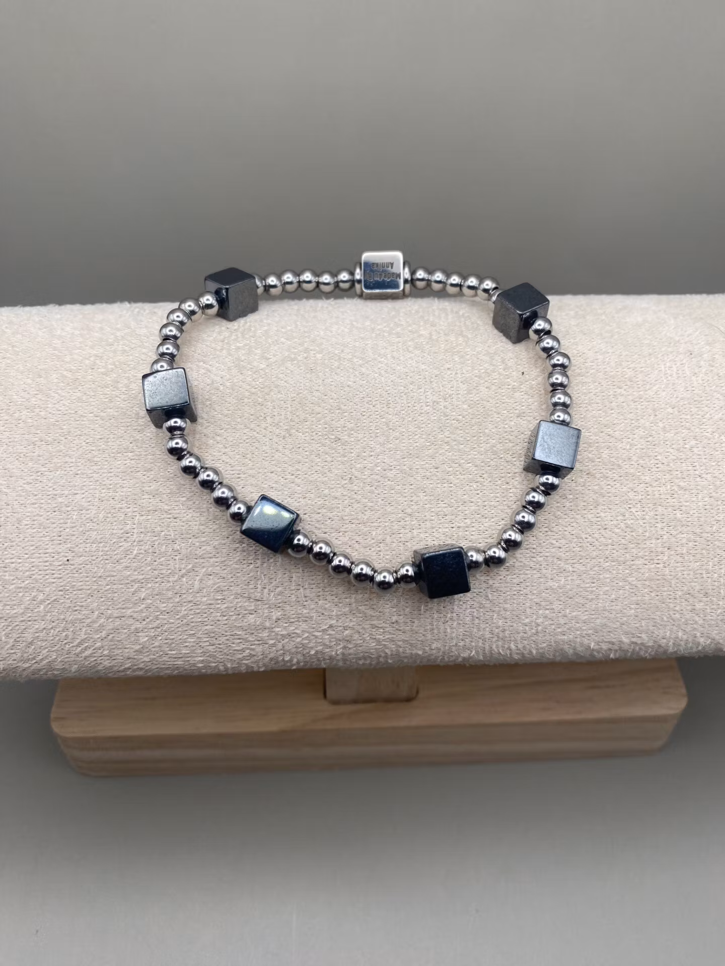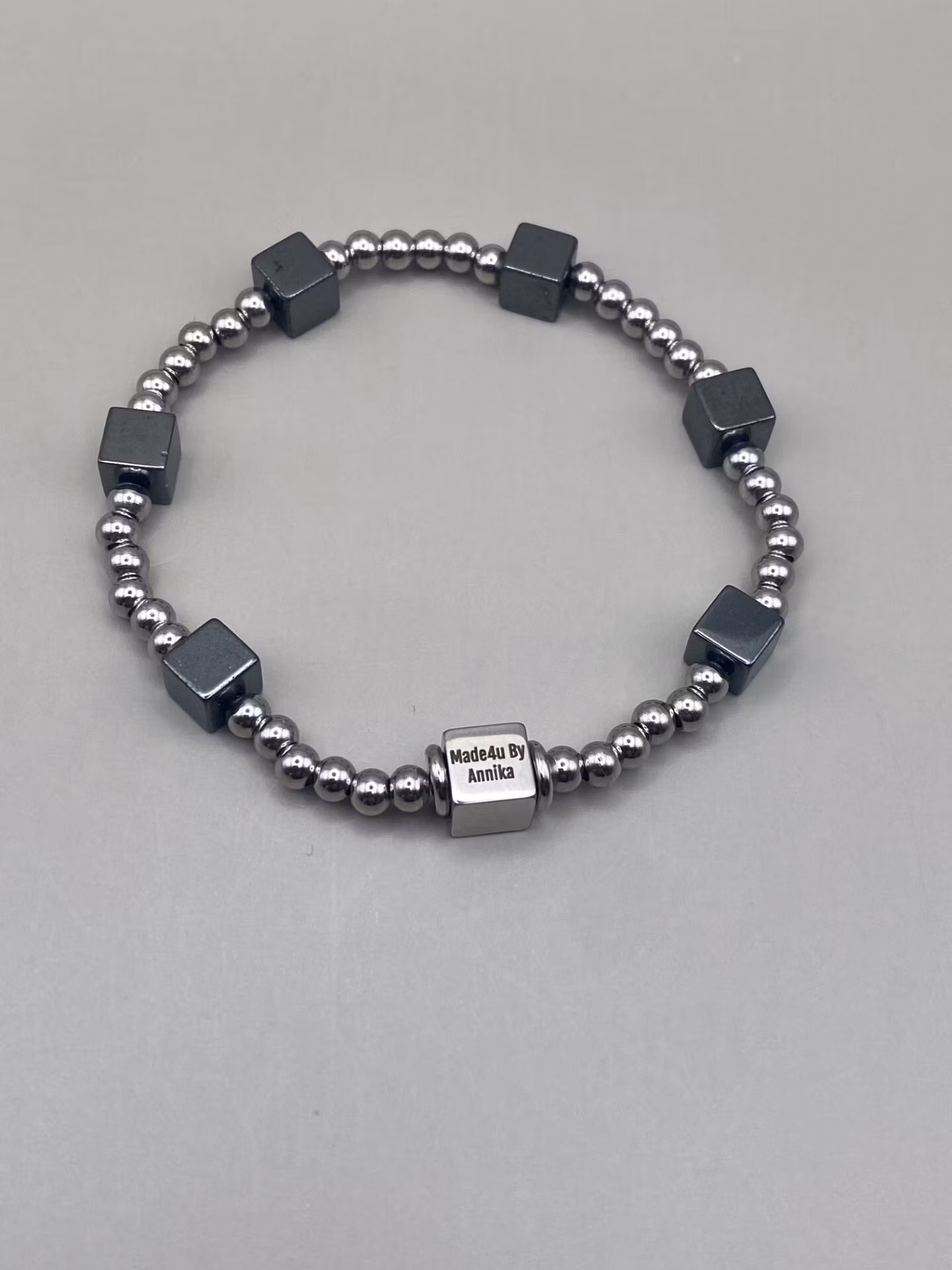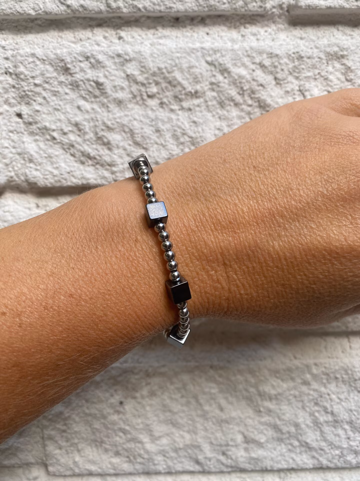 Vackert armband i varvat silverfärgade små pärlor i rostfritt stål samt fyrkantiga mörkt stålgrå hematitpärlor och fyrkantig silverfärgad avslutningspärla.