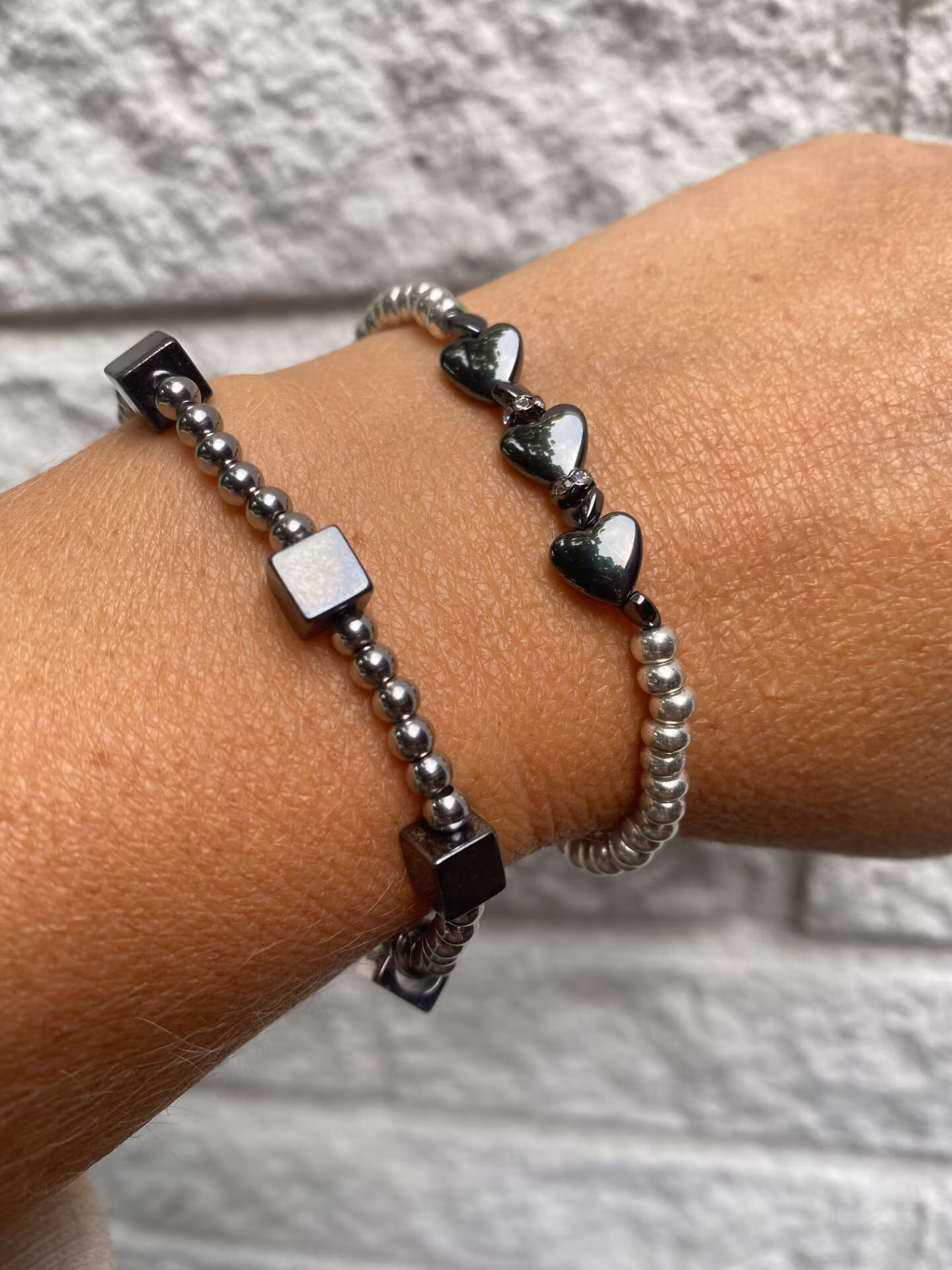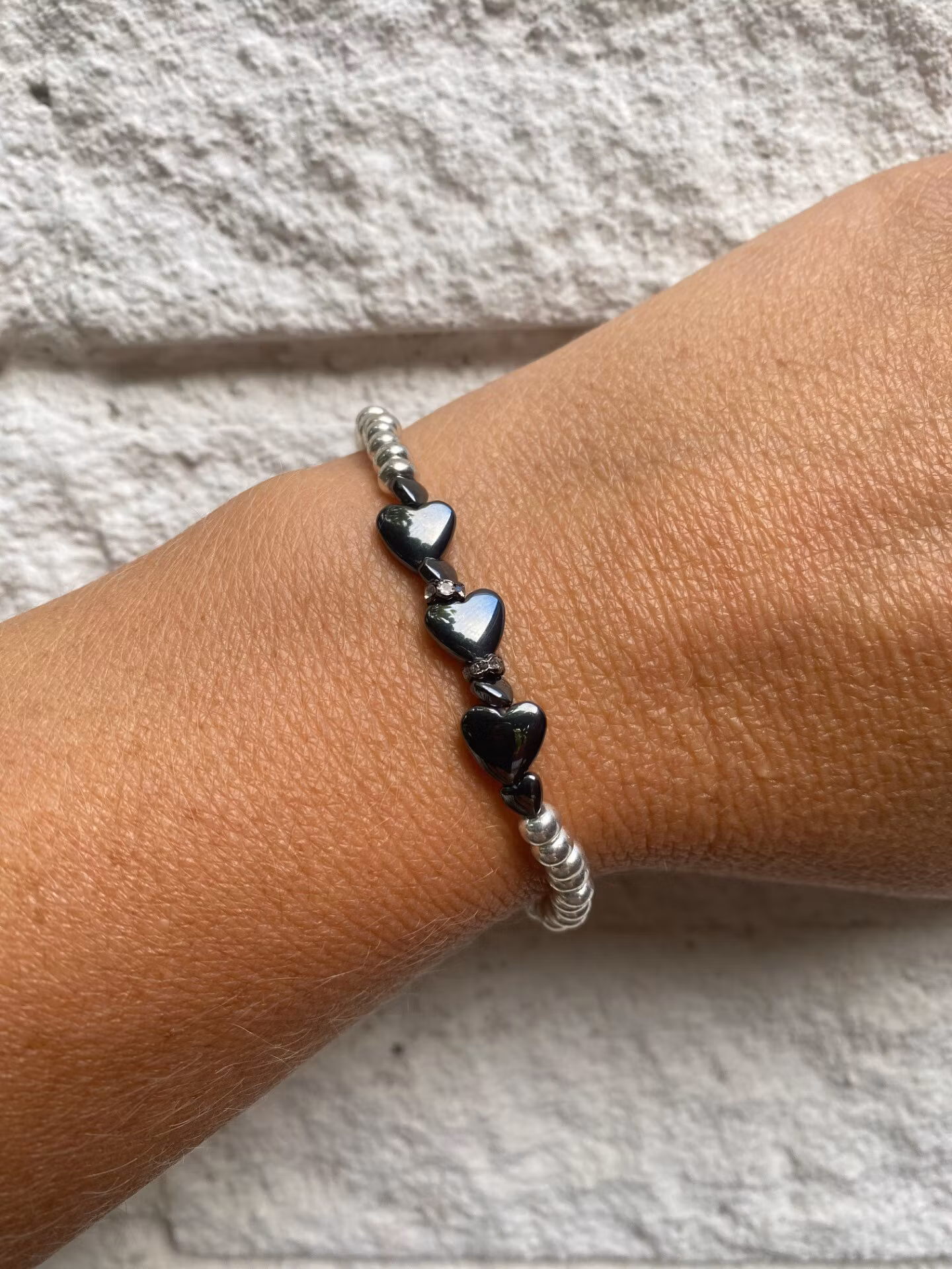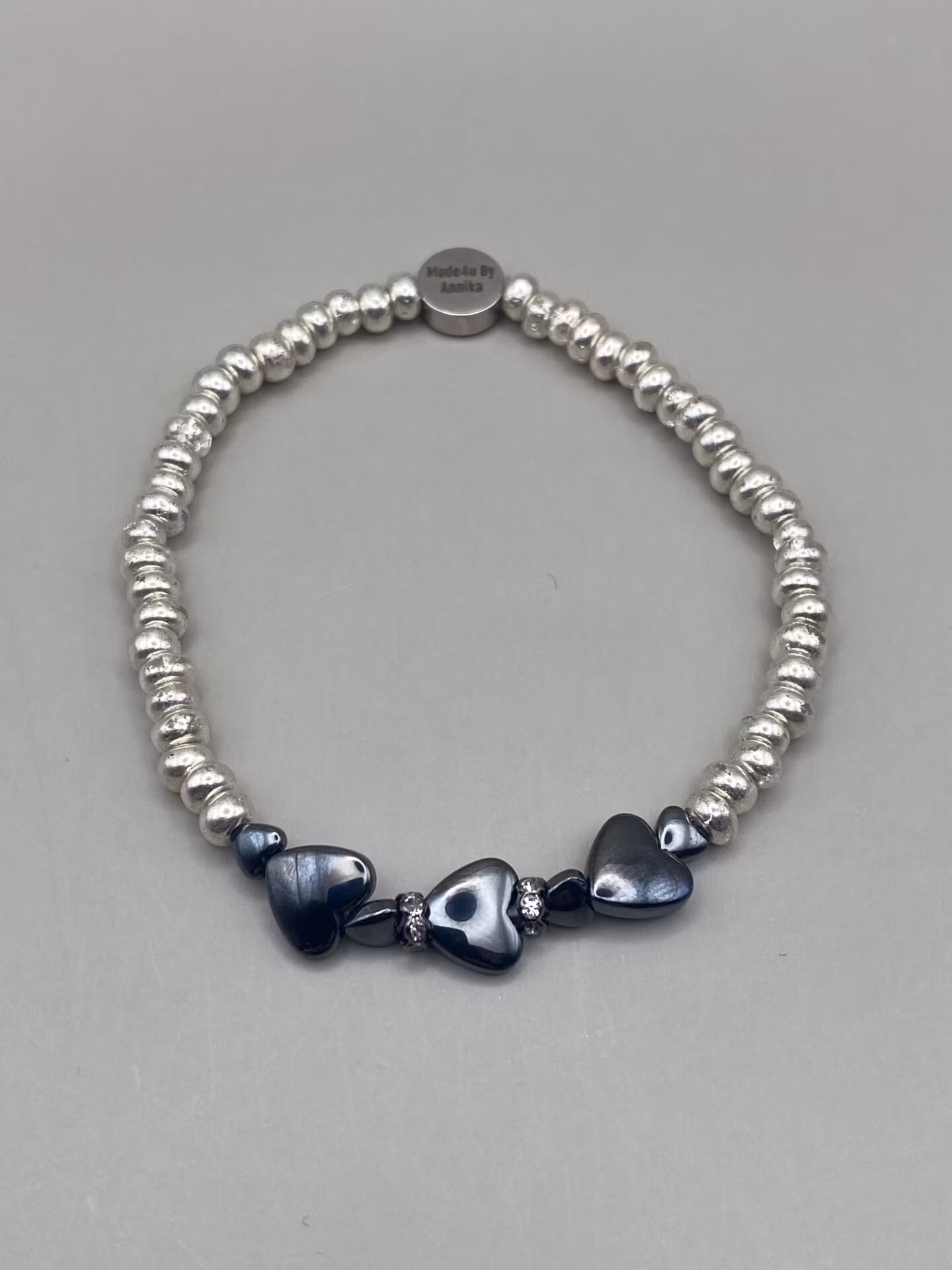 Vackert armband med silverfärgade glaspärlor runt om, tre stora och fyra små mörkt grå hematit hjärtan i och smått strass i blickfånget.