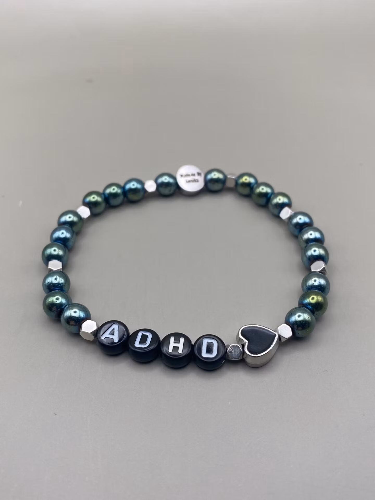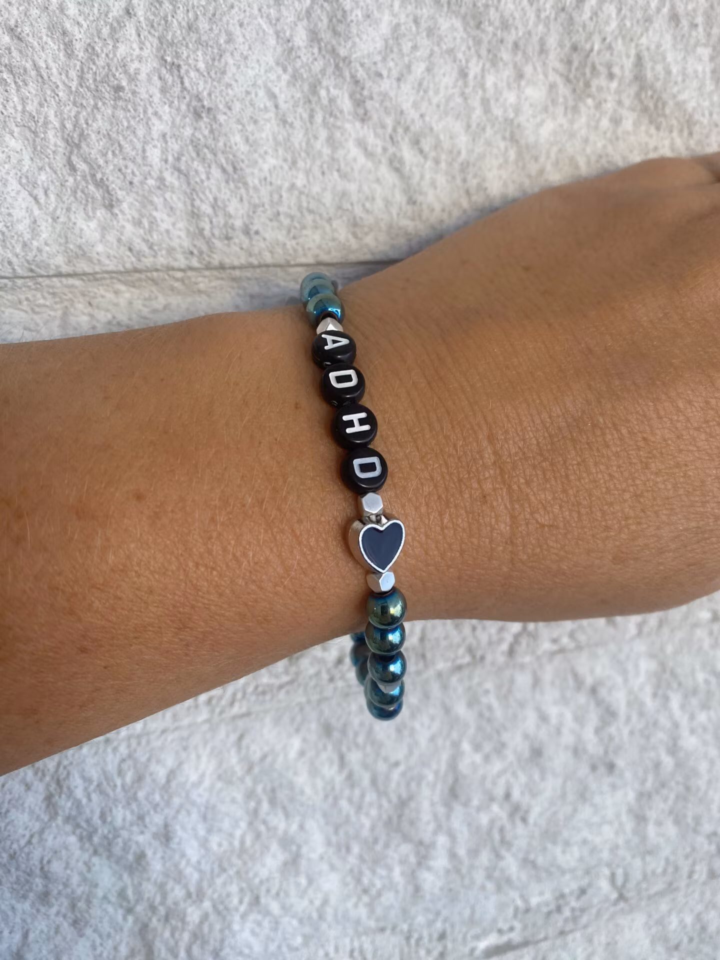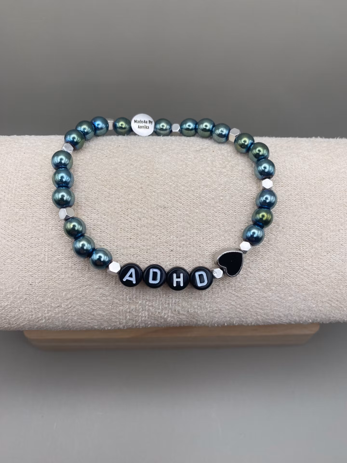 Stiligt armband med budskap. ADHD. Vackra turkosgröna hematitpärlor med lite tyngd varvat med silverfärgade fyrkantiga små pärlor och ett hjärta. Finns även i vit text. Passar både män och kvinnor.
