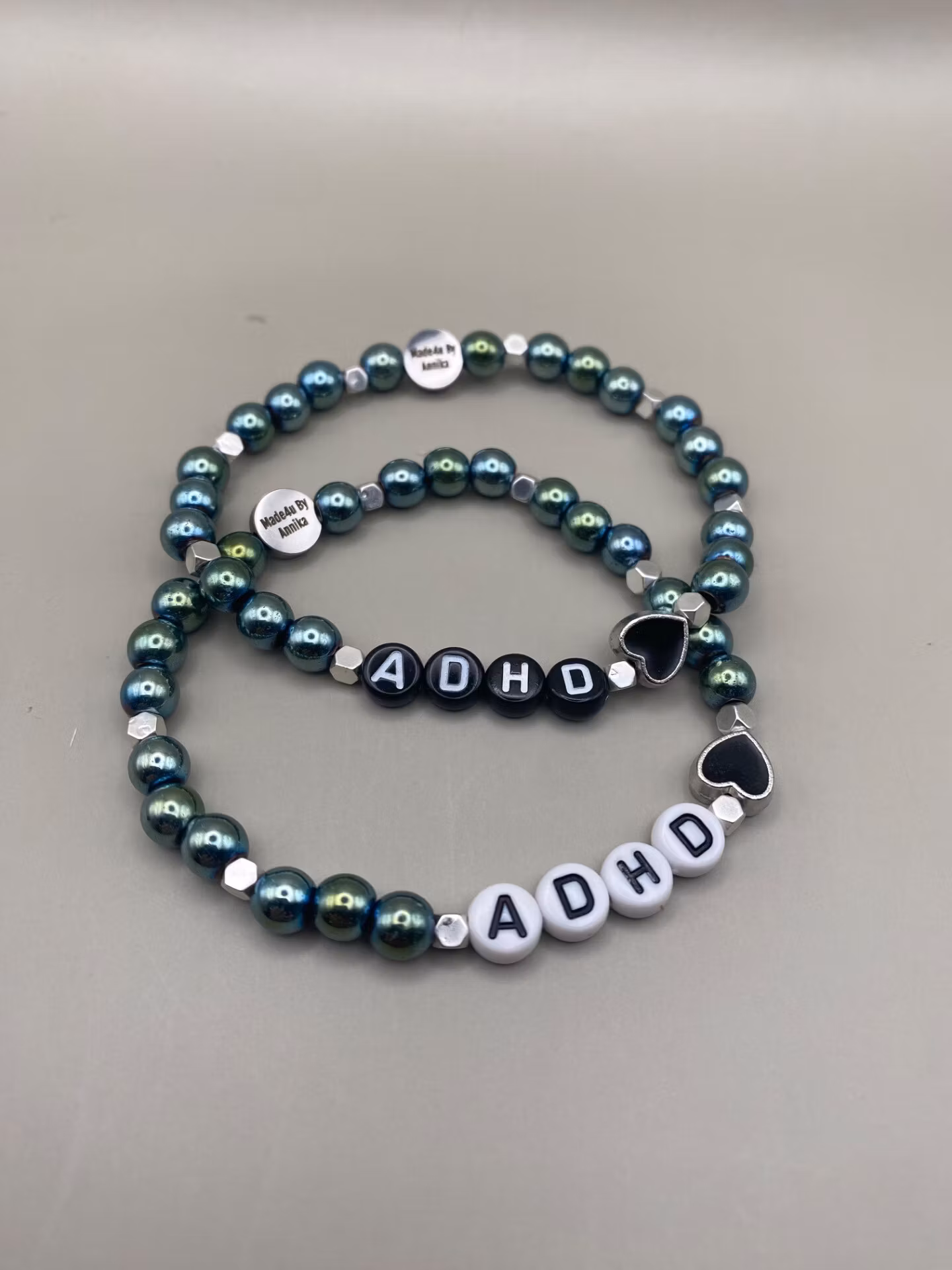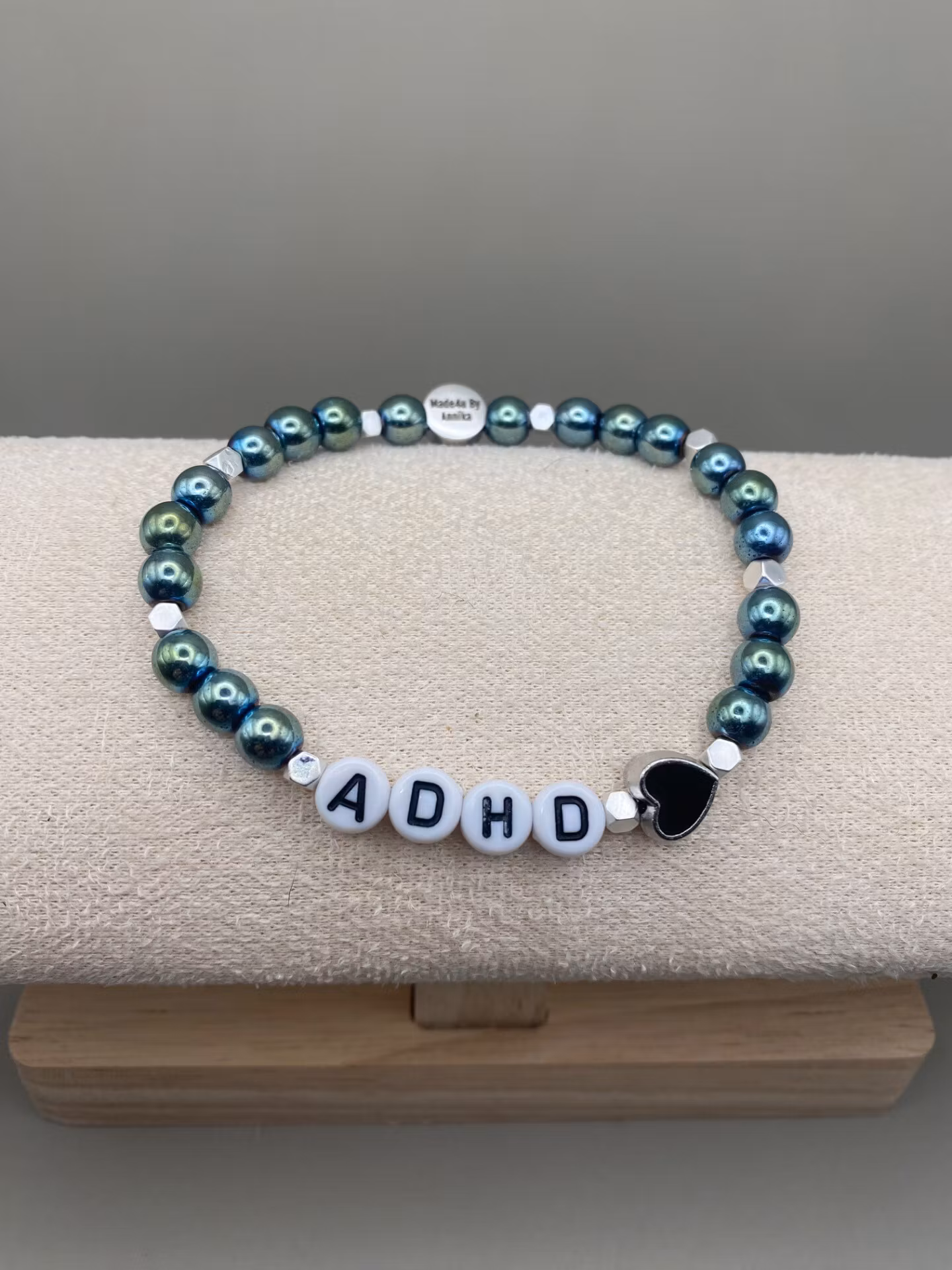 Stiligt armband med budskap. ADHD. Vackra turkosgröna hematitpärlor med lite tyngd varvat med silverfärgade fyrkantiga små pärlor och ett hjärta. Finns i även i svart text. Passar både män och kvinnor.