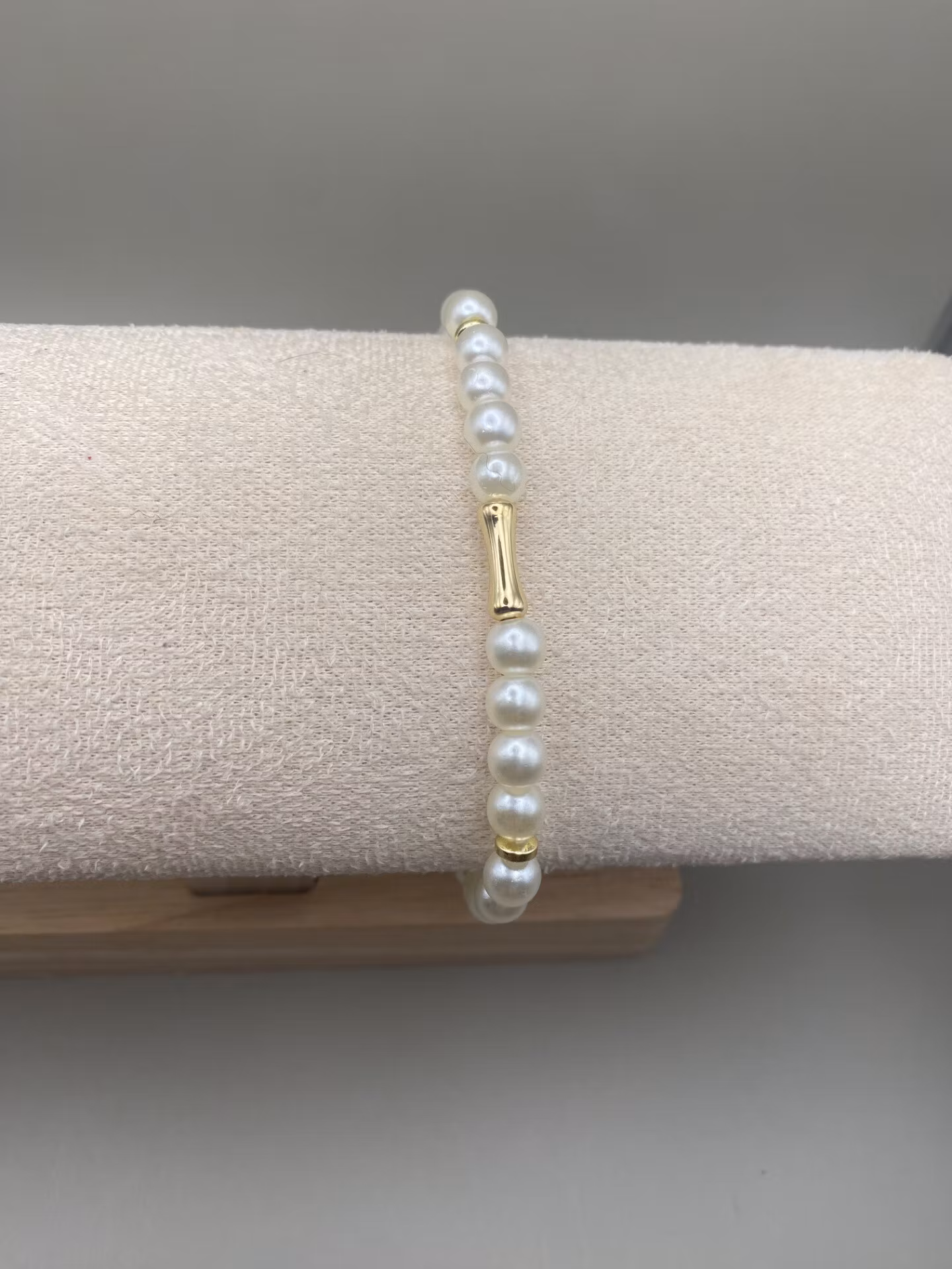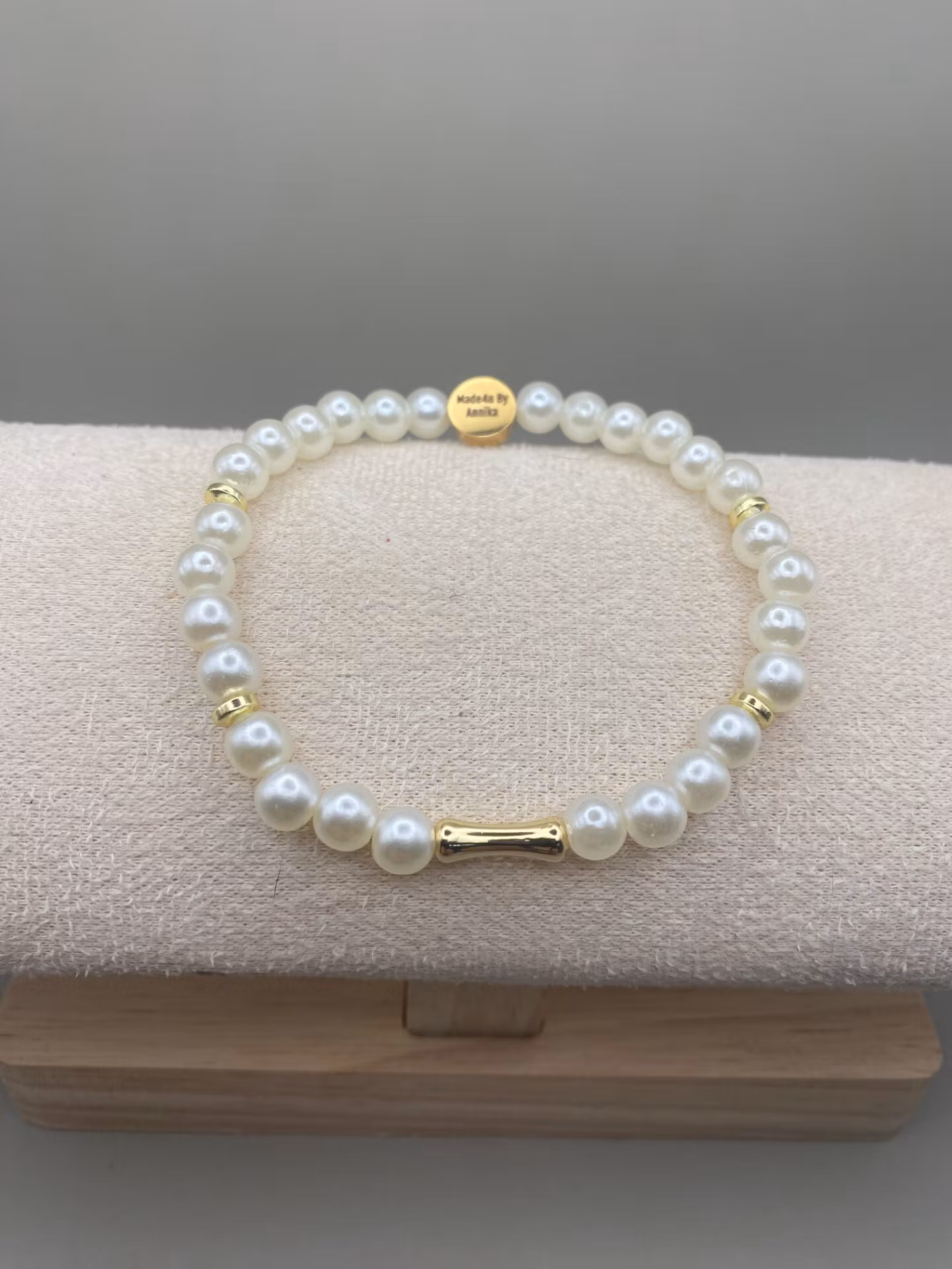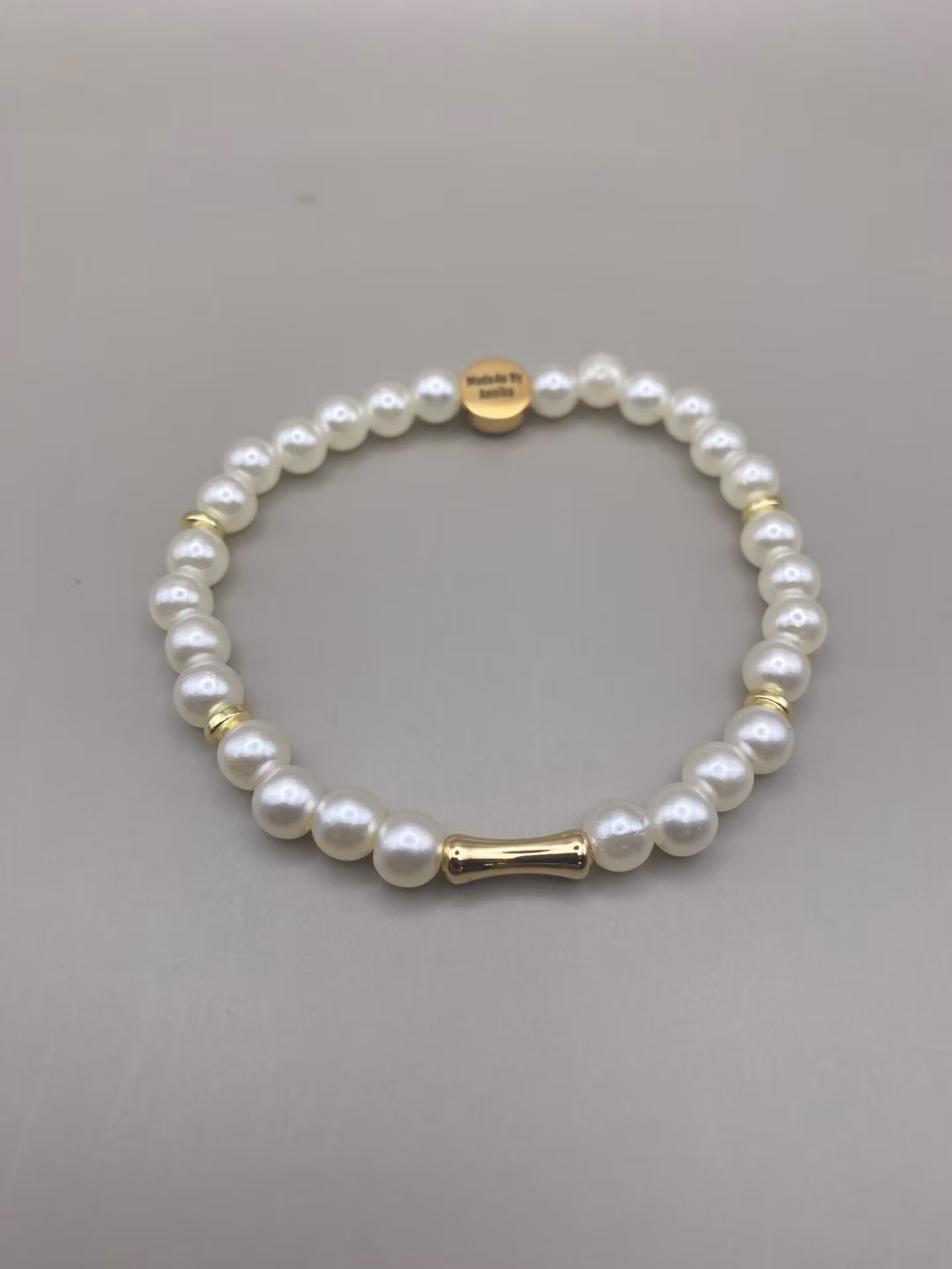 Elegant armband i benvita högblanka pärlor varvat med guldfärgade distanser och vacker 18K guldfärgad avlång form i blickfånget.