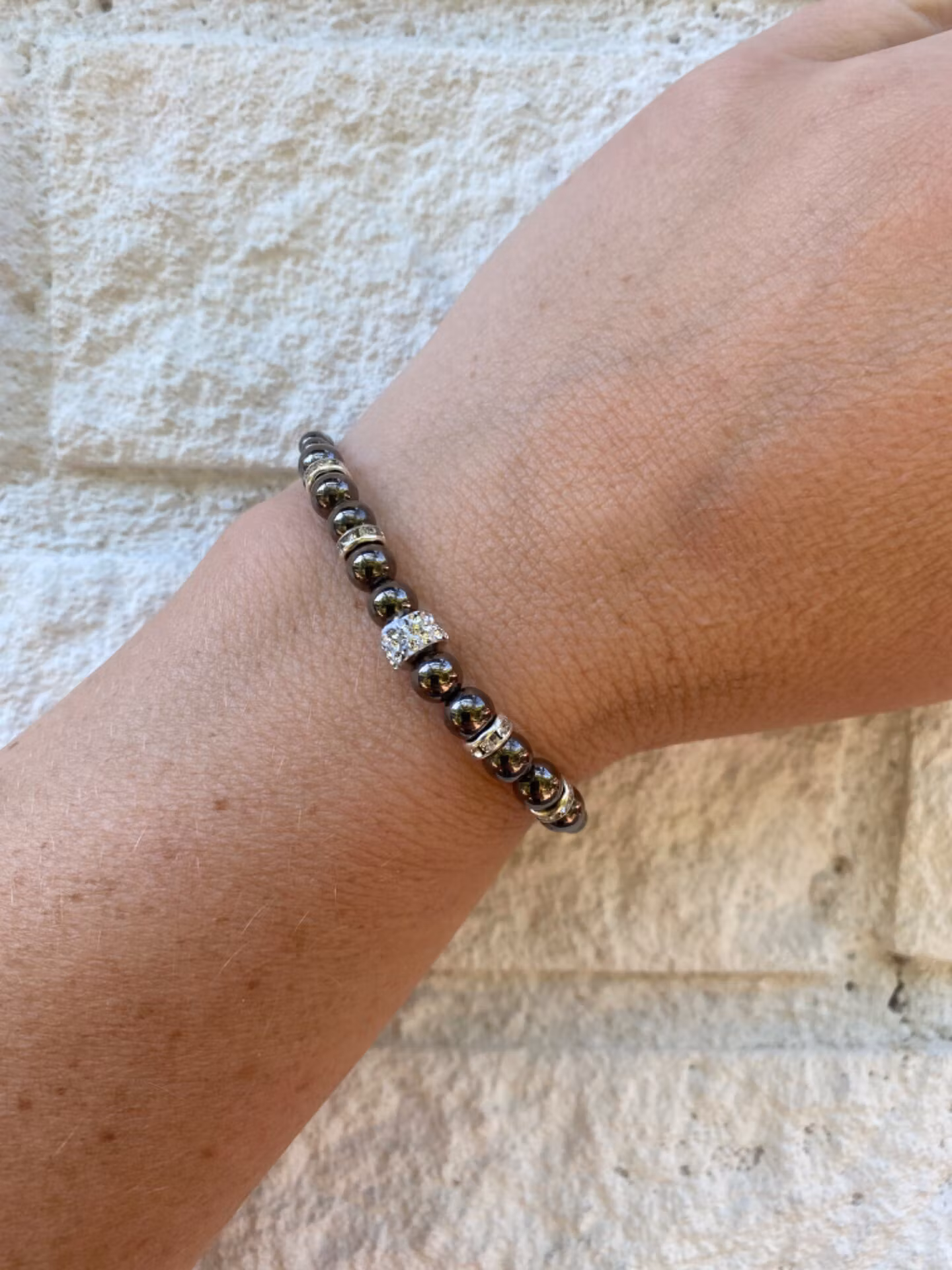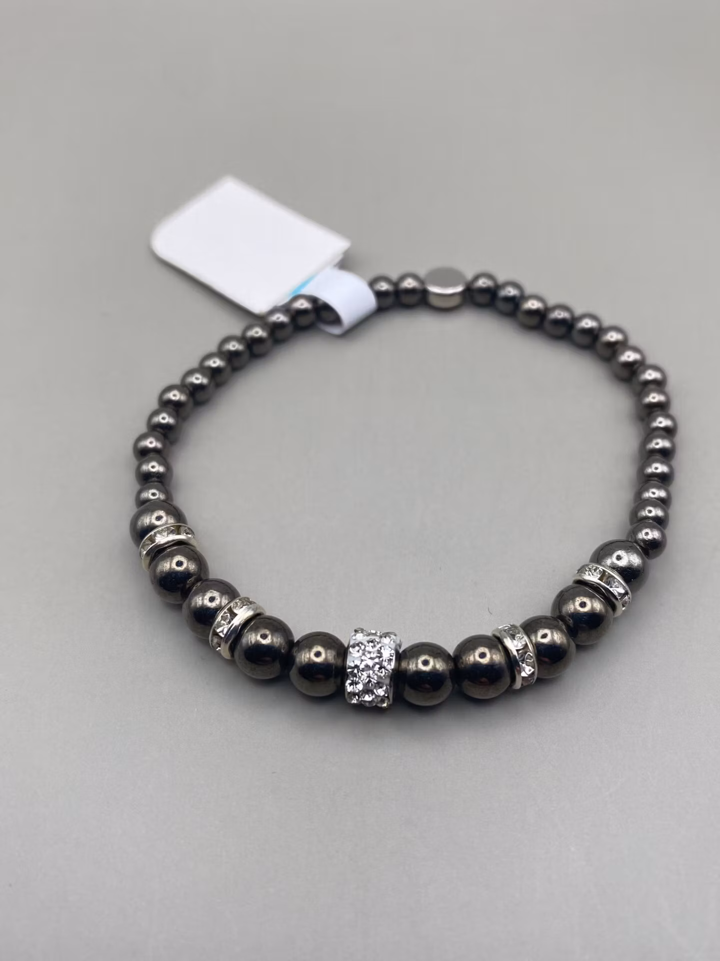 Armband i svartmetallicfärgade pärlor, varvat med silverfärgade detaljer och strass i blickfånget