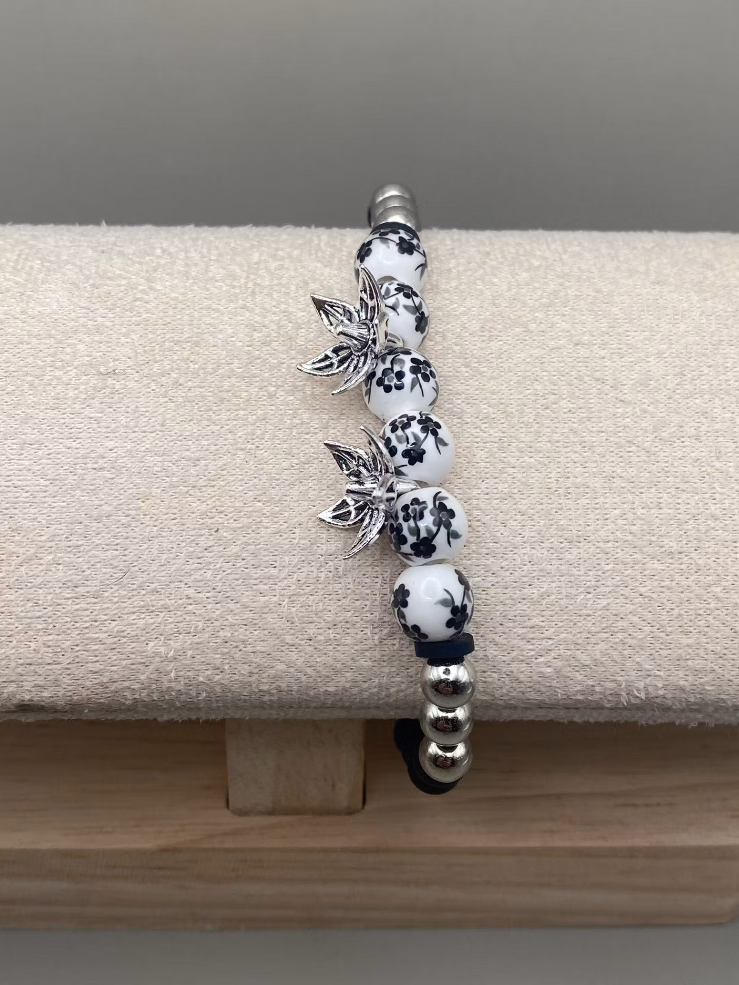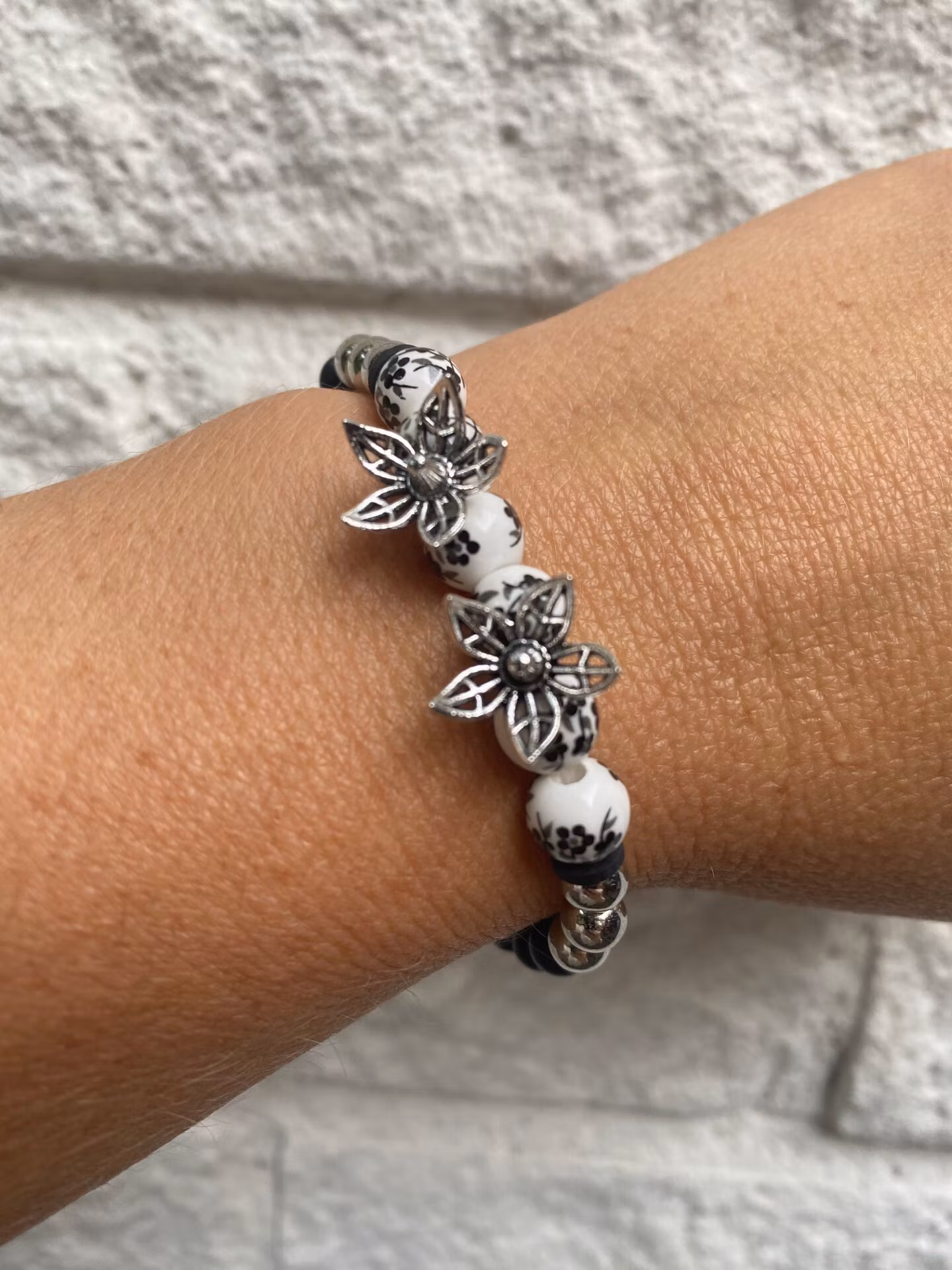 Tufft armband i toner av svart och vitt. Vita porslinspärlor med mönster av svarta blommor, utstående antiksilverfärgade blommor i blickfånget. Runt om har vi s