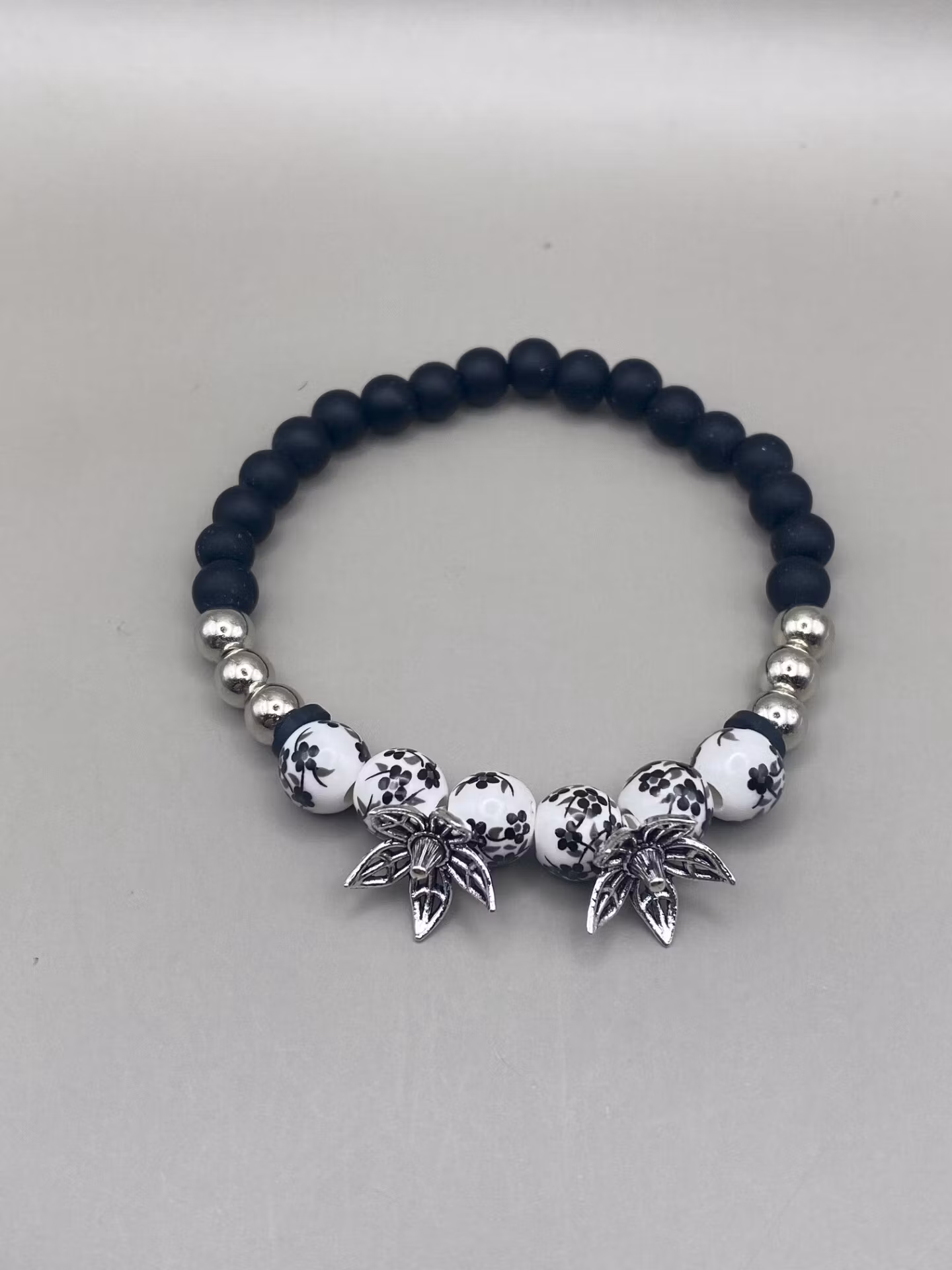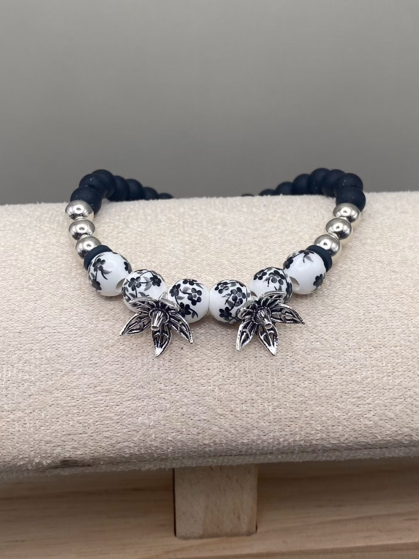 Tufft armband i toner av svart och vitt. Vita porslinspärlor med mönster av svarta blommor, utstående antiksilverfärgade blommor i blickfånget. Runt om har vi silverfärgade pärlor och gråsvarta pärlor. Ett riktigt statement armband.