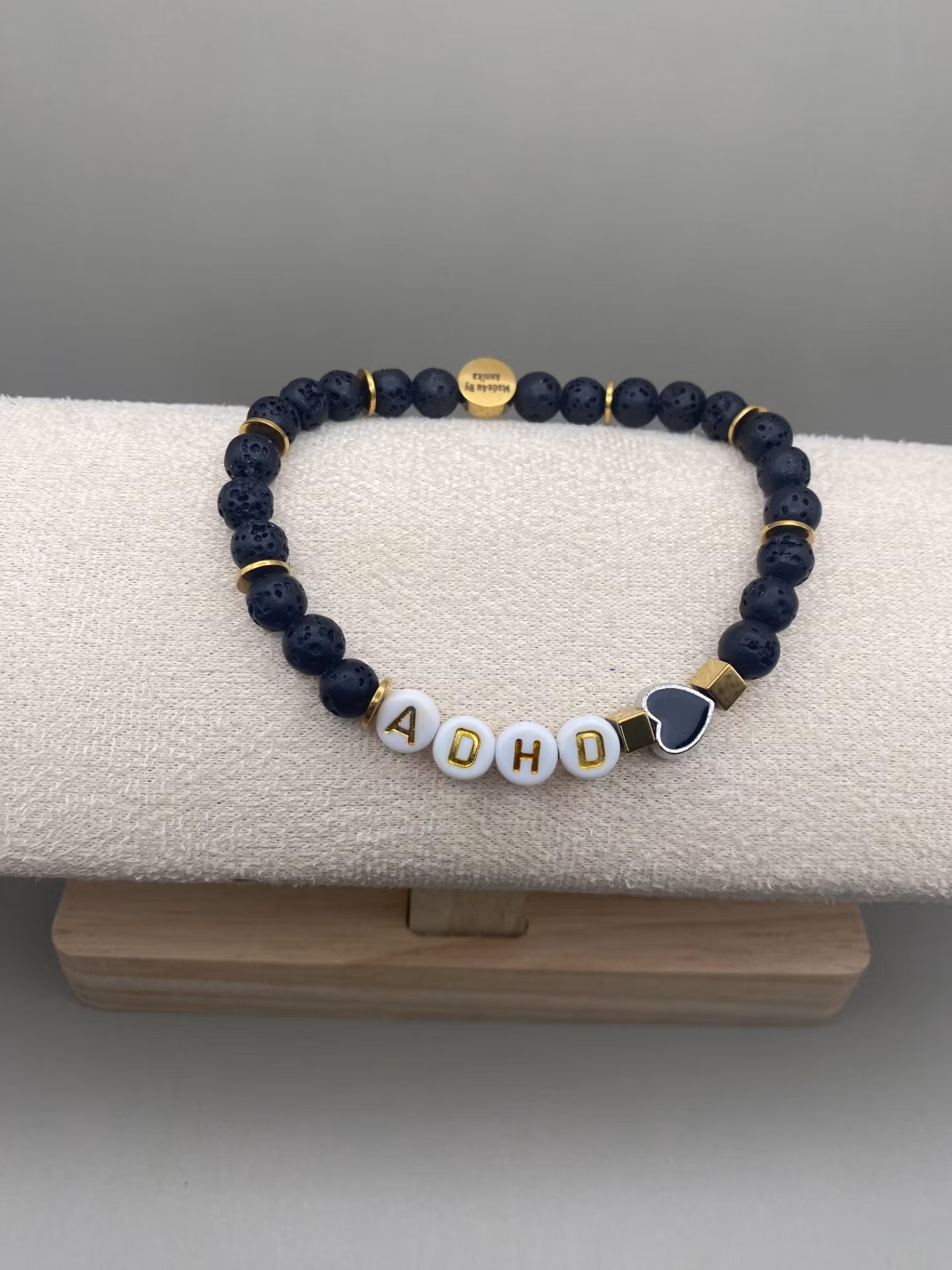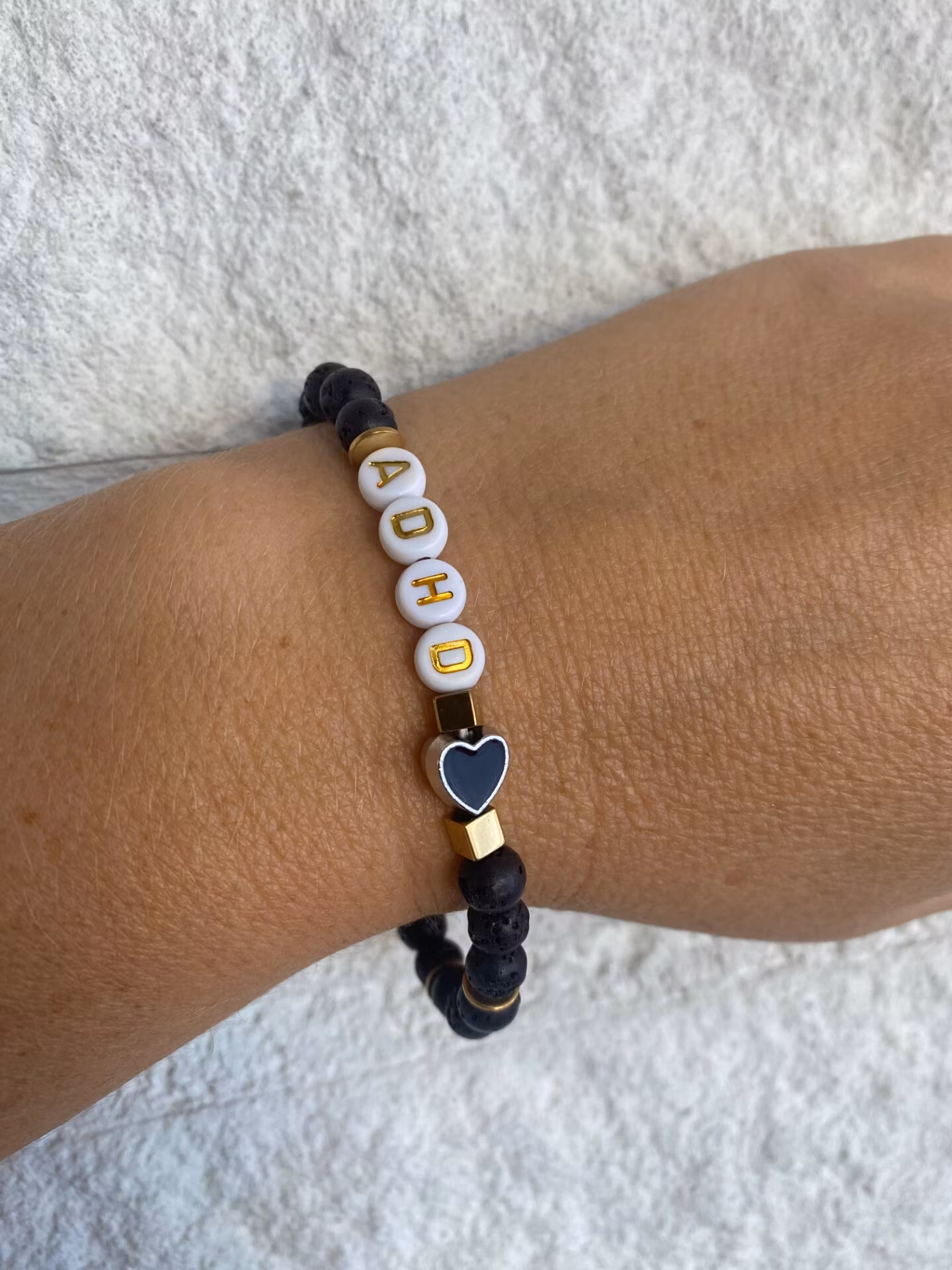 Stiligt armband med budskap. ADHD. Svarta mönstriga stenpärlor med lite tyngd varvat med guldfärgade distanser och ett hjärta. Passar både män och kvinnor.