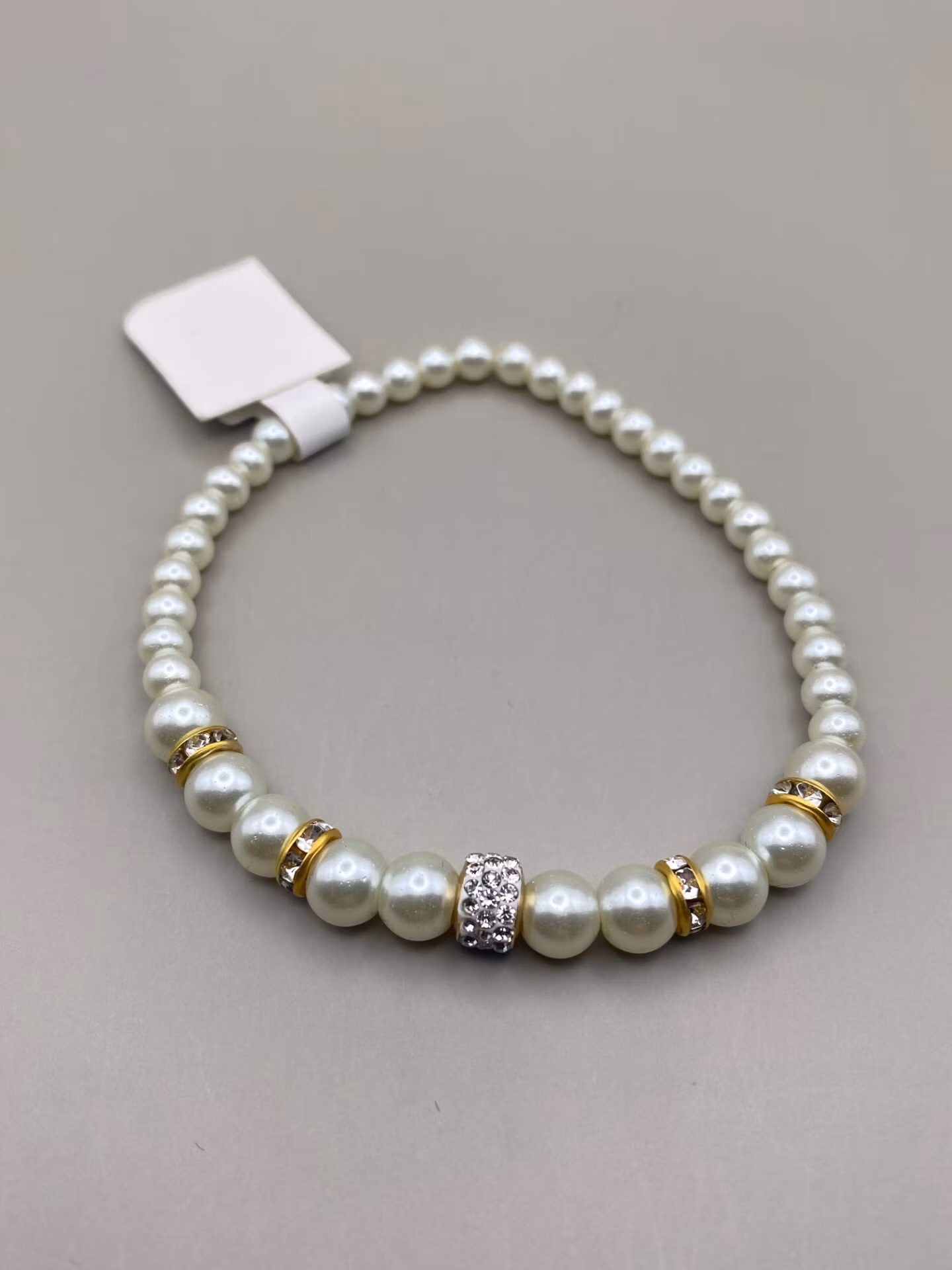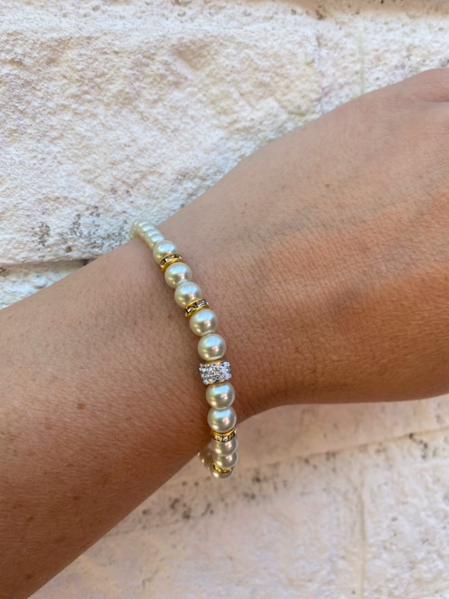 Armband i benvita/beiga pärlor, varvat med guldfärgade detaljer och strass i blickfånget